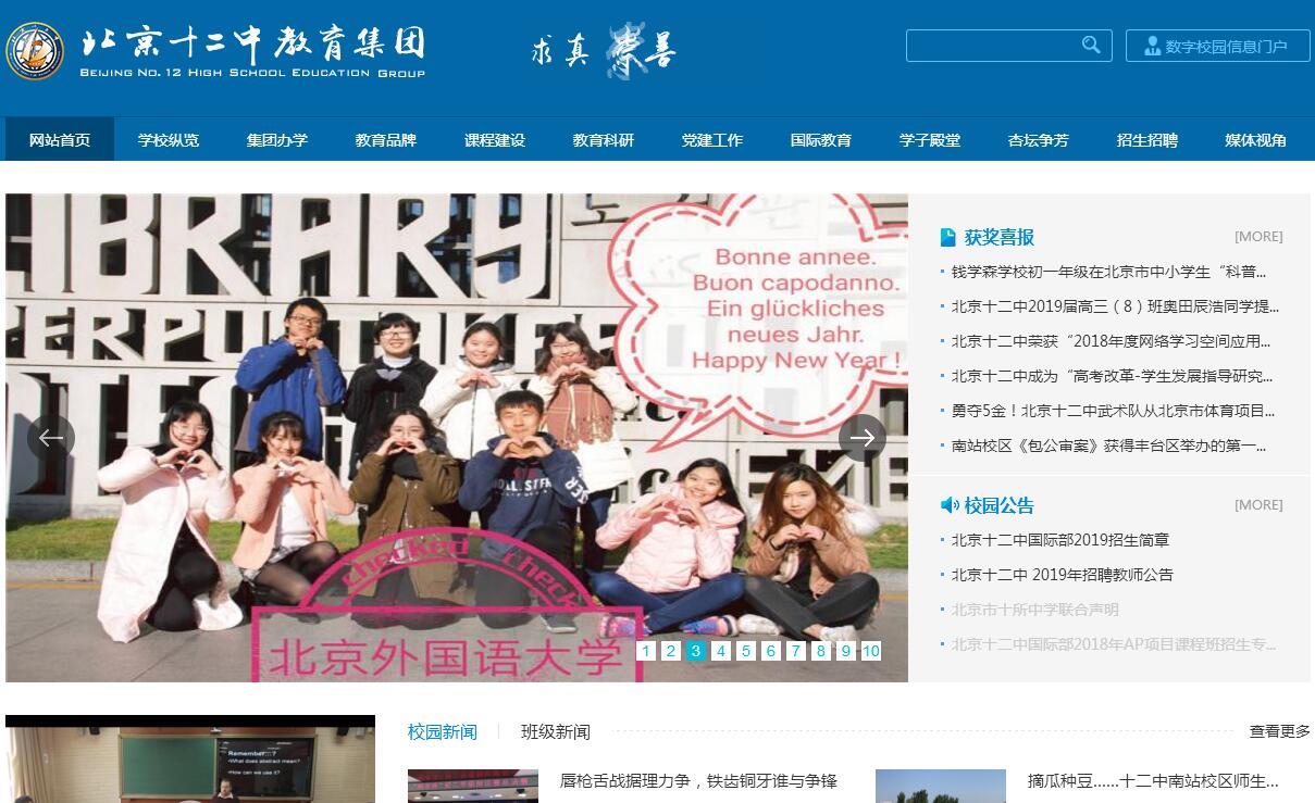 创建于1934年的北京市第十二中学,是北京市重点中学和首批高中示范校。创办全国第一所校办工厂,建立全国第一个中学心理教研室,在全国率先开设形体课、心理课和综合实验课……十二中人锐意进取,砥砺前行,留下了一串串熠熠生辉的足迹。它是国家传统国学文化基地校,也是世界名中学联盟成员校;是北京市"金鹏科技团"成员校和"翱翔计划"双科基地校;是国家级体育传统项目学校。多年来培养出大批优秀毕业生,遍及哈佛、斯坦福、北大、清华等国内外知名学府,创造出响亮的十二中品牌。学校在继承八十余年传统文化的基础上,逐步形成了"求真、崇善、唯美" 为核心的价值体系,鼓励师生作真的追求者、善的传播者和美的创造者。在科技教育、艺术教育、体育教育、心理教育、实践教育方面形成五大教育特色。北京十二中是首都基础教育的一张名片,目前已经发展成为跨越幼小中高多个学段、一校多址的十二中教育集团,现有170多个教学班、6120名学生和500余名教职工。北京十二中拥有一支师德高尚、业务精湛、结构合理、充满活力的高素质专业化教师队伍。现有3名教育部国培计划专家,3名享受政府特殊津贴专家,5名正高级教师,26名在职特级教师,73名市区级骨干教师。这支队伍成为学校不断发展的源动力。学校着力构建 “真善美交融”的课程文化体系。开发出学科综合课程、科技创新课程、社会适应课程、国际理解课程四个系列200余门校本课程。形成了 “创新算法与发明专利”、“形体艺术”、 “少年智慧学”、CAP等一大批精品课程。学生在“求真育智慧”的过程中探索真知、创新实践,在“崇善育精神”的过程中提升素养、养成善行,最终达到唯美品质、博大胸怀的课程文化育人目标。学校设立校长奖学金,提出“正气、志气、底气、雅气、灵气、勇气、和气、大气”的“八气修身”素质要求,激励学生品学兼优。为学生提供自主学习、积极思维、开展活动和充分表现的四大发展空间,让每一个学生都能在自己感兴趣的领域内得到健康的发展。北京十二中是“金鹏科技团”成员校和最早的“翱翔计划”基地校。学校与中科院、清华大学等科研院所和一流大学合作,创设了脑与记忆、超导技术、生态与环境等十五个科技创新工作室。董瑞等6名十二中学生获得东盟10+3初中科学奥德赛两项金奖;宿鑫等4名学生获得国际青少年发明两项金奖一项银奖和一项特别奖。杨晨宇等同学代表北京队喜获第27届国际青少年科学家竞赛一等奖;辛昱辰同学获得“第十二届北京市青少年科技创新市长奖” 。北京十二中艺术教育充满魅力,成绩斐然。金帆民乐团一举夺得全国中小学艺术展演一等奖第一名;行进管乐团参加全国比赛获得两项金奖;管乐团、合唱团双双获得2015年爱丁堡国际艺术文化节金奖。舞蹈团在北京市艺术节比赛中屡获第一。北京十二中是国家级体育传统项目学校。在全市率先实施男女生分班教学和走班教学。提出了 “强健体魄,健全人格”的体育学科宣言,开设有桥牌、形体艺术、健美操、武术等多门校本课程。体育竞赛硕果累累,田径队、排球队、足球队、篮球队、棒球队、板球队、街舞队等运动队在国内外各级体育赛事上争金夺银。体育周、运动会、篮球赛等校园体育活动蓬勃开展,学生体质健康水平居于北京市前列。学校体育呈现出生机勃勃的景象。北京十二中实践教育独具特色。每届高一年级为期一周的京外社会实践教育活动,成为学生期盼、家长称赞的学校品牌教育活动。学生足迹已遍布全国15个省市20个友好学校,实践教育经验已经推广到全市乃至全国。2015年起,启动学农实践教育活动。北京十二中是国家传统国学文化基地校,也是世界名中学联盟成员校。中西文化在这里交融,文化的纽带将国内外诸多名校联系在一起。模拟联合国社团活动、两岸四地的国学交流活动享有盛誉。如今的北京十二中,正在以国际化的视野和思维与世界接轨,以现代化的格局和眼光与未来对话。学校以“让优秀学生领跑,让所有学生优秀”为立足点,着力培养会通中西、学贯文理的高素质人才。青春在这里闪耀,梦想在这里放飞!北京十二中,让梦放飞的地方!