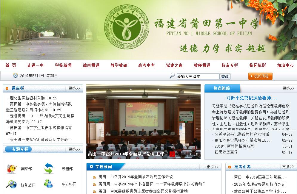 福建省莆田第一中学创办于1906年,校区位于市区学园南街,占地160亩,建筑面积7万多平方米,环境优美,教学设施现代一流。现有高中57个班,学生3000人。教师100%本科毕业,其中硕士研究生59人,高级教师81人,国家省市级学科带头人和骨干教师共60人,省市名师8人。学校办学成绩蜚声海内外,历史上以全国高考红旗而闻名。校友中有院士4人,教授级专家、学者、党政领导等近3000人。学校全面推进素质教育和新课程改革,坚持德育为首,实施“五个一”工程,按照“强化、浸润、体验、养成”的德育模式,以“五正”(正容、正言、正行、正心、正人)教育为核心,通过主题推进式德育,提高学生的文明素养。建立高三工作“139”新模式,高考成绩取得新突破,稳居全省前茅。2010-2015年共82人考取清华、北大、港大;文理科本一总上线率达95%;2015年71位学生获许亚琼奖学金,创1987年设奖以来我校年度获奖人数最高纪录。学校坚持秉承传统,与时俱进,不断推进集团化、国际化、多元化、特色化发展,提升办学品位。组建包含8个学校的莆田第一中学教育集团。2012年开办中美高中课程实验班,现共招生360人,外教6人;同年承担内地新疆高中班任务,现有10个民族的150名新疆班学生。突出科技教育特色,每年举办科技节、“奇思妙想”创意节,形成了一批省内一流水平的科技特色项目。每年都有10多位学生获创新大赛、机器人比赛省一等奖以上奖励。21项师生的实用新型专利获通过。学科奥赛成绩突出,学生曾获国际奥赛金牌、铜牌。2015年省学科奥赛获奖人数创历史纪录,特别是物理奥赛取得四项全省第一的优异成绩。体育底蕴深厚,校运会举办了141届,元旦环城跑和五四火炬长跑等传统体育项目已坚持了四十几年。校篮球队在省青少年篮球赛中十连冠,2009年获全国高中男子篮球联赛亚军。学校注重因材施教,促进学生全面发展、个性发展,已逐步形成办学模式多样化、民族多样化、社团活动多元化、学生发展多元化的新局面。学校以“为全体学生负责,为学生终身负责,为中华民族负责”为办学理念,以“进德、力学、求实、超越”为校训,致力于打造“文化一中、品质一中、学术一中、多元一中、和谐一中”,办莆田人民满意的教育。
