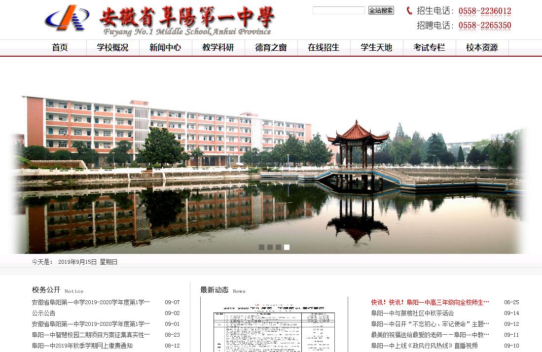 滚滚的千年颍河奔涌东流,不舍昼夜;蜿蜒的京九铁路纵贯南北,只争朝夕。在这传统与现代的交汇点上,每天冉冉升起的旭日,总会照耀着一个有着悠久传承、丰厚底蕴而又充满希望的求学圣地——安徽省阜阳第一中学。她开启阜阳新学,矢志不渝;她永立教育潮头,与时俱进;她承载华夏美德,陶冶人文情怀,育满园桃李成大器;她汲取泉颍灵气,铸就鲲鹏气概,助一代学子入青云。百年一中,文清意远,环境优美,设备齐全。她坐落繁华都市间,交通方便。她沧桑砥砺,风雨百年,依然彰显出博大与厚重、典雅与庄严。走进一中的校园,你能体会到她浓郁的人文气息,你能感受到她深厚的文化积淀。鲜花绿茵、亭台碧水、垂柳倒映、雕塑小品,如诗如歌,点缀其间,令人仿佛穿行在书林画卷,沉醉流连。科学馆、天文馆、图书馆、阅览室、标准塑胶跑道、音乐教室、多媒体设备,应有尽有,设施齐全。清晨,一鉴塘畔,书声朗朗,孩子们迎着霞光认真阅读,尽情地享受着美文诵读带给他们的愉悦与美感;黄昏,问源亭前,夕阳沉暮,孩子们伴着余晖握笔沉思,尽情地体会思想的深邃与灿烂……良好的育人环境,滋养出他们如诗如歌的青春;美丽的知识琼浆,浇灌出姹紫嫣红的华年!百年弦歌不辍,薪火相传,谱写华章;几代栉风沐雨,春华秋实,铸就灿烂。百年的荣誉,凝聚着百年的积淀;百年的辉煌,孕育着桃李满园。风景独好,桃李竞芳正兹时;硕果最丰,栋梁争茂唯此间。阜阳一中坚持智育与德育并行发展,抓好教学质量的同时,并将德育美育融入校园文化建设中间,把开展丰富多彩的活动作为载体,以推动学生的全面发展。在大学扩招的今天,考一个大学并不艰难,考一个一流大学并在以后可持续发展,才能拥有灿烂明天。一行行数字诠释着辉煌:阜阳一中人才辈出,代有峥嵘,培养出了刘德培、解广润、戴厚英、邵国培、郝敬民、张中华、张俊久、卢家丰、时光辉等数十多名院士、作家、将军、省部级领导为代表的万千英才。学校高考应届本科达线率、重点达线率和名牌大学录取率始终遥居全市之首,稳居全省同类学校前列。近几年来,学校出10名阜阳市文理科状元,考入清华 30 人,北大31 人,复旦25人,中国科技大94 人,有600多人考入排名前20位的国家高等学府。进入高校的学子,依然演绎着一中的辉煌,他们秉承一中传统,锐意进取,品学兼优。一项项荣誉牵动着景仰:阜阳一中以其卓尔不群的办学实绩被北京大学、清华大学、中国科技大学、西安交通大学等全国名校选定为“优质生源基地”。近年,学校曾先后获得国家级体育传统项目学校、全国体育先进单位、全国艺术教育先进单位、第四届全国百强中学、安徽省文明单位、安徽省绿色学校、安徽省电化教学一类达标单位、安徽省示范性校园网、安徽省“十一五”群众体育先进单位、安徽省优秀传统项目学校、安徽省体教结合先进单位、市“依法治校示范校”、市五四红旗团委、市“巾帼建功活动”先进集体、市文明单位、市教育系统体卫工作先进单位、市教育系统先进集体等荣誉称号。一枚枚硕果散发着馨香:近几年来的10名市文理科状元,170余名北大、清华、复旦、中国科技大学子。近几年来,我校有一批学生进入高校就崭露头角,成为大学生队伍中的佼佼者。吴泽飞、陈浩、谭佳音、柯可、褚天舒等大批同学获国家级奖学金。徐聪同学,02年进入安大学习,先后担任校学生会主席,安徽省青联副主席;夏炳风,清华大学电子系团委副书记,校实践顾问团成员,曾获社会工作奖学金;解利艳,现为北京大学经济学院分团委副书记,04—05年度北京市学生联合会三好学生;陈洁,南开大学优秀学生干部,获06-07年度国家奖学金;在中国科技大学读书的范谨同学,成功竞选学生会副主席;09年高二考入中科大少年班的王武翟同学今年获得中科大最高奖“郭沫若奖学金”,将到普林斯顿大学直读博士,并获得全额奖学金;09年市理科状元闫令琪被拥有世界上最强计算机专业的伯克莱大学录取为博士研究生,并获得全额奖学金;校友韩斌、英国剑桥大学博士后,中国科学院国家基因研究中心主任,其研究成果发表于《Genome Research》《Nature》杂志上,受到国际同行高度评价;校友韦小丁同学,现就读于美国哥伦比亚大学,在顶级刊物《科学》发表的研究成果受到广泛关注。这样的校友,不胜枚举。苍穹是一种高度,飞翔是一种梦想。一中,将为你插上梦想的翅膀,助你翱翔于青云之上。因为有春风化雨的精神,才有桃李增华的芬芳;因为有雄厚卓越的师资力量,才有春色满园的辉煌。以先进的管理指引教学。阜阳一中的领导班子,始终以教育教学为中心,牢牢把握教育的真谛,为打造一支名师队伍呕心沥血,殚精竭力。先进的教育理念是我们工作的灯塔,没有理念的指引就不会到达胜利的彼岸。为了提高办学质量,实现教育改革的目标,我校提出了 “师生为本、主动发展”的办学理念,努力把学生培养成“品德优秀、学业优异、举止优雅、习惯优良”的新型人才。以雄厚的师资推动教学。阜阳一中以其科学的管理、深厚的底蕴、人文的关怀为教师成长搭建适切的发展平台,重师德,铸师魂,重师能,塑师格,打造了一支高素质的名师队伍,形成了教科研一体化、名师辈出的新格局。阜阳一中先后有钱宝珍、齐名砾、马金星、杨碧明等7名老师被省政府授予安徽省“特级教师”称