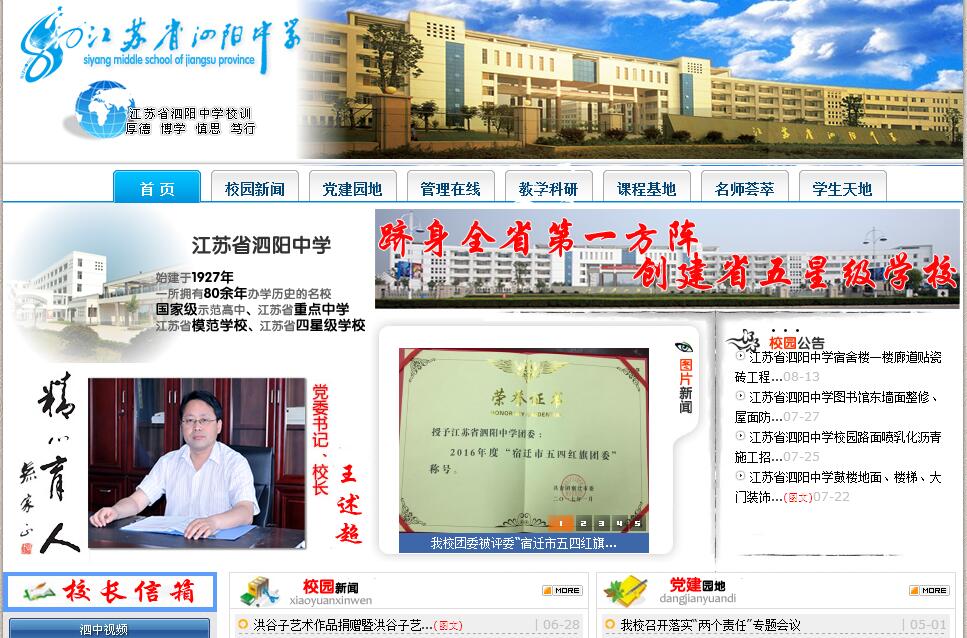 | 网站简介: 江苏省泗阳中学(Siyang High School)创建于1927年,该校是江苏省重点中学、江苏省模范中学、全国先进体育传统基础学校。1999年1月,经省教委批准,更名为“江苏省泗阳中学”。1999年7月,与南京师范大学签订联合办学协议,成为“南京师范大学泗阳实验中学”;2001年4月,顺利通过国家级示范高中验收;2004年,被省教育厅转评为江苏省首批四星级中学;2014年,顺利通过江苏省四星级中学复审。 |