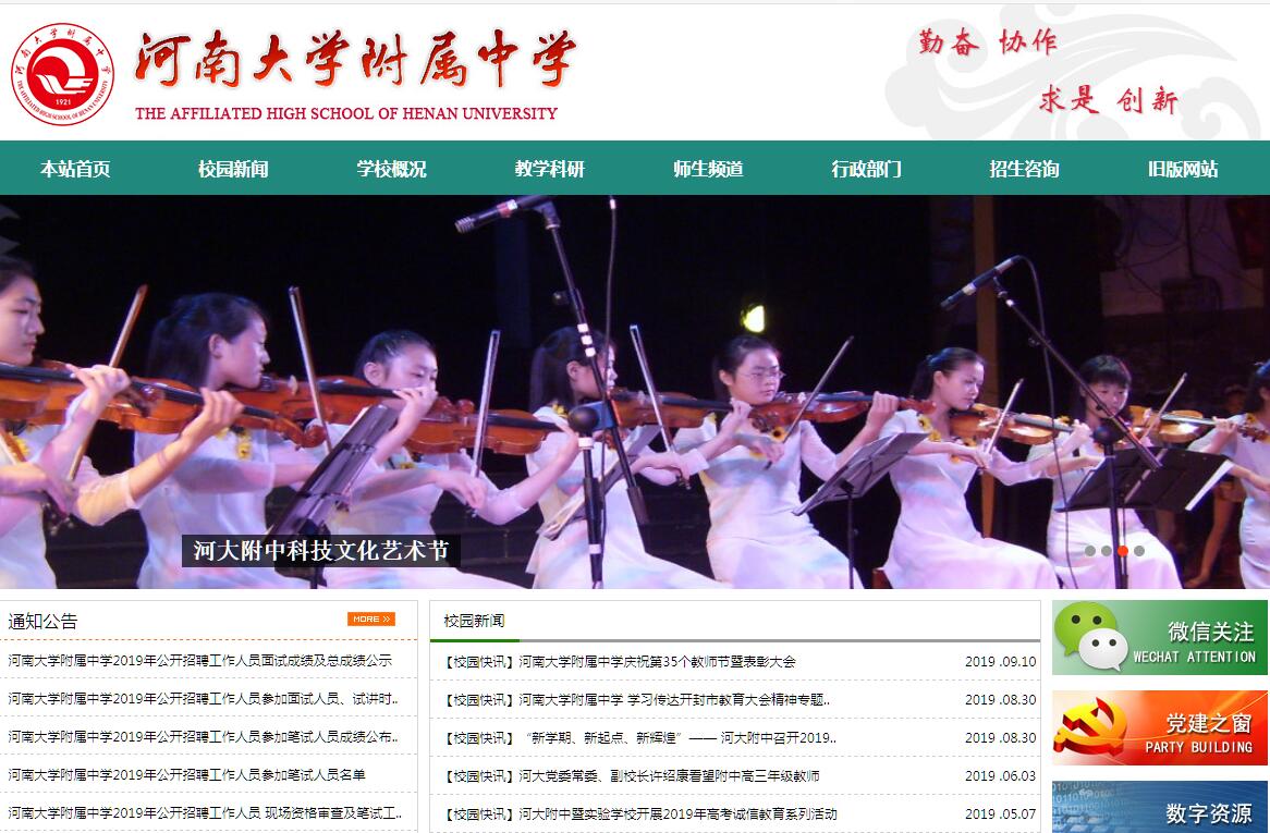 河南大学附属中学创建于1921年,是河南省教育厅直属的完全中学,河南省首批示范性高中,河南省首批普通高中多样化发展示范校,河南省首批办好的23所重点中学之一。学校的校训是“文明、求真”,旨在引导教师“千教万教教人求真”,引导学生“千学万学学做真人”、“做现代的文明的中国人”。学校遵循“秉承传统、发挥优势、把握优势”的办学基本原则,明确实施“成绩优秀、创新潜质、特长发展、社会责任”多样化办学目标定位,以立德树人为根本任务,继承发扬百年办学文化优势,尊重学生不同潜质,注重学生多元智能发展,以高品质多元课程体系建设为引领,以信息化教改实验为动力,以综合素质评价为抓手,以教师队伍建设为保障,创新人才培养模式。学校现有教职工328人,正高级教师4人(含特级教师2人),高级教师84人(含特级教师4人),中级教师117人,国家级骨干教师2人,河南省教育教学专家和河南省学科带头人5人,河南省骨干教师9人,河南省学术技术带头人25人。学校现有教学班69个,在校学生3290人。学校以人为本,以“育人”为中心,建立了科学的管理体制。对教师的教育教学建立了科学的评估考核办法,形成了具有河大附中特色的学校常规教学规范。根据新课程改革的精神与要求,完善学校课程设置,逐步形成了具有本校特色的课程体系。初中部尝试以班级为单位,以活动类课程为载体,建立特色班级,鼓励学生创办学生社团,目前已形成三十多个有特色的学生社团。学校以科研副校长为引领,利用高校资源组建指导团队,帮助学校制定教科研发展规划和教师专业成长发展规划,开展相关教师业务培训和教育科研培训。以课题研究为抓手帮助学校构建品牌学科,并将相关经验进行推广,为品牌学科建设提供智力保障。通过开通“附中在线”网络教学平台、校园OA系统,建设微课教室、虚拟教室、同步互动教室、3D创新实验室,将信息技术融入到教育教学的全过程,运用信息技术逐步改变原有的教育教学过程与模式,实现以知识传授为主的教学方式向以能力素质培养为主的教学方式的转变,并根据社会发展和学习者的需求,选择优质教育资源,进一步突破传统教学活动的时空限制,提升教育教学的效率与质量,促进学生健康成长。学校承办国家级“宏志班”,努力为品学兼优、家庭贫困的学生提供享受优质教育资源的机会,在校园彰显“宏志”精神,丰富学校文化内涵。学校高度重视青少年心理健康教育工作,成立了心理健康教育领导小组,形成了主管领导、学生处、年级段、心理咨询室等组织有力、分工明确的学生心理健康教育工作体系,建立了专职心理老师和兼职心理老师并存的教师队伍,有针对性地开展心理健康教育工作,多渠道、多角度了解学生的心理健康情况,掌握学生的心理发展动态,提升学生的心理健康水平。学校是省体育传统项目学校(田径、乒乓球),学校的男女乒乓球队、女子篮球队每年都代表开封市参加省晨光杯体育比赛,取得了令人欣喜的成绩。学生参加国家、省、市级艺术类大赛均取得了优异成绩,校合唱团曾获得全国中学生文艺汇演二等奖,学生自编校园剧获全国中学生文艺汇演一等奖。学生社团开封盘古队代表开封市参加全国比赛获好评。学校教育质量在河南省处于领先地位,先后成为北京大学、清华大学、中国科技大学、武汉大学、华中师范大学等重点高校的优质生源基地。自1994年以来,河大附中共培养出文、理等各类状元27名。每年的高考升学率一直名列河南省前列。因素质教育成绩显著,学校先后被命名为:全国语言文字规范化示范学校、全国首批科研兴校示范基地、全国群众体育先进单位、全国学校艺术教育工作先进单位、全国中小学课堂教学研究中心实验基地、中国科协青少年科技创新人才培养项目实验学校、中央教育科学研究所科研教改先进实验学校、国家级“宏志班”承办学校、教育部中国教师发展基金会校本建设项目全国重点实验学校、全国中小学舞蹈教育传统校、河南省教育系统先进集体、河南省文明学校、河南省办学管理规范化学校、河南省教育科研先进集体、河南省首批校园网示范校、河南省体质健康标准示范性学校、河南省体育“达标”先进单位、河南省卫生先进单位、河南省高中研究性学习实验学校、河南省普通高中课程改革先进单位、河南人民最满意的十佳学校、河南省文明标兵学校、河南教育名片、河南省精神文明单位、河南省心理健康教育示范校等。