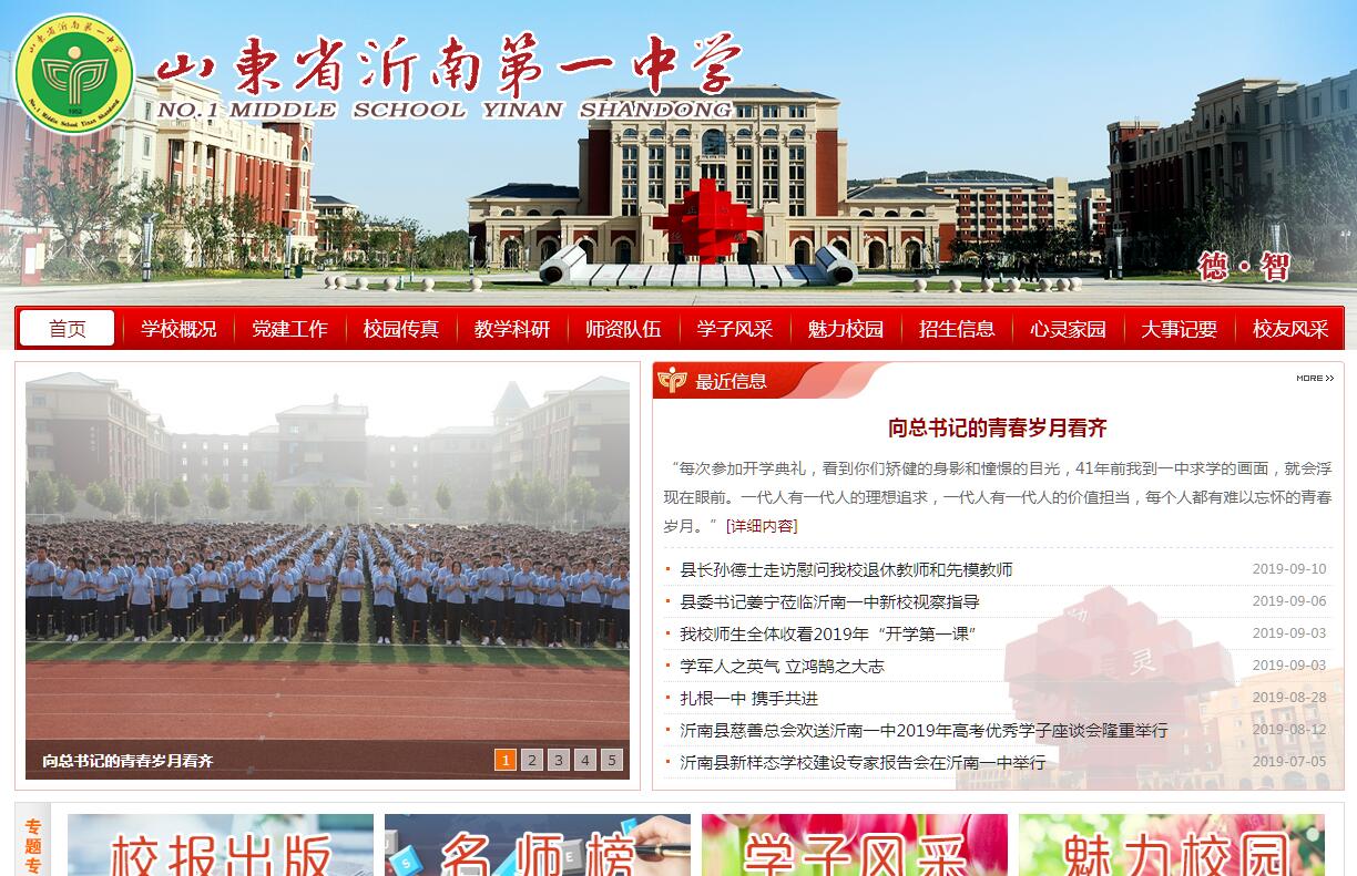 山东省沂南第一中学坐落在智圣诸葛亮的故里山东沂南,始创于1952年11月,1953年迁入现在校址——沂南县界湖镇文化路19号。学校占地54669平方米,建筑面积66401平方米。在职教职工563人,在校学生近7000人。拥有高级教师130人,中级教师211人,硕士研究生学历20人。2004年被评为山东省规范化学校,并先后被授予"山东省绿化先进单位" 等几十项荣誉称号。2015年12月,县教体局发布公示:沂南一中新校址选定于县城西外环以东、北外环以南、县城关中学(界湖一中)以西,占地约400亩。目前,新校建设正在紧张筹备中。学校建有集教学、会议、演出为一体的大型多功能厅。开通宽带网,建有教学网络平台、教学资源库。微机室、实验室、阅览室、体育馆等功能室一应俱全,电子监控安全网络覆盖全校。学校构建“德·智”校园文化体系,重视文化引领,以文化人。打造校宣传栏文化、教室文化、宿舍文化、餐厅文化、楼道文化、教研组办公室文化体系,重建学校网站,创办《沂南第一中学报》,制作学校宣传片,创作毕业歌、校歌,录制校歌MTV。学校建有一支敬业奉献、严谨执教、爱生善导、团结协作、以身立教的良好教师队伍。拥有省人大代表1人、省优秀教师5人、市劳动模范2人、市优秀教师6人、沂蒙名师4人、市优秀教研组长8人、市优秀班主任4人、市教学能手、教学新秀47人、市政府首届教学成果奖24人、县劳动模范2人、沂南名师13人、县十大杰出青年6人、县首届最美教师1人、县政府记集体记三等功3次,受县政府个人记功7人、县政府首届教学成果奖49人。沂南一中新校位于县城西北方向,北外环以南、西外环以东、玉泉路以北、规划英才路以西,四面环路,交通顺畅;南北望山,西面向水,毗邻汶河湿地公园和西山公园,地理位置优越。新校占地面积444.6亩,校舍建筑面积13.99万平方米,共有21个建筑单体、两个运动场、三个大门,总投资约4.58亿元;办学规模达到141个教学班,可容纳7000余名学生就读。是沂南县一次性投资最大的民生工程。新校功能布局科学合理,教学管理设施先进齐全。分为教学区、生活服务区、景观休闲区、综合会议区、校内外停车区等功能区。设有3座教学组团楼、1座科技楼、8座宿舍楼、2座餐厅楼、1座艺术楼、1座体育馆、1座图书综合楼、1座大礼堂、1座生活服务楼、1座浴室楼以及卫生室、理发厅、超市等生活服务用房。新校规划设计高端定位。同济大学承担规划设计,山东大卫国际建筑设计。以前庭后院的景观结构、环状流畅的交通体系、自由错落的建筑布局、叠山引水的景观特色为设计理念,塑造文化浓厚、山水园林园式学校。先后有32名学生被清华大学和北京大学录取,曾连续两年摘取山东省文科状元的桂冠,每年都有一大批学生升入“985”、“211”重点名校,先后被山东大学、山东经济学院、山东体育学院确定为"优秀人才输送基地"。近年来,有近两千人次在各学科奥赛,各类比赛、竞赛中和青少年科技创新大赛中获奖。学校先后被授予“中国西部教育顾问单位”,“山东省规范化学校”、“山东省绿色学校”等省级荣誉,“临沂市普通高中教学工作先进单位”、“临沂市师德建设十佳单位”等市级荣誉,并因开展各类竞赛荣获“临沂市青少年科技创新市长奖组织奖”等称号。校食堂获称“临沂市学校餐饮服务食品安全示范食堂”。