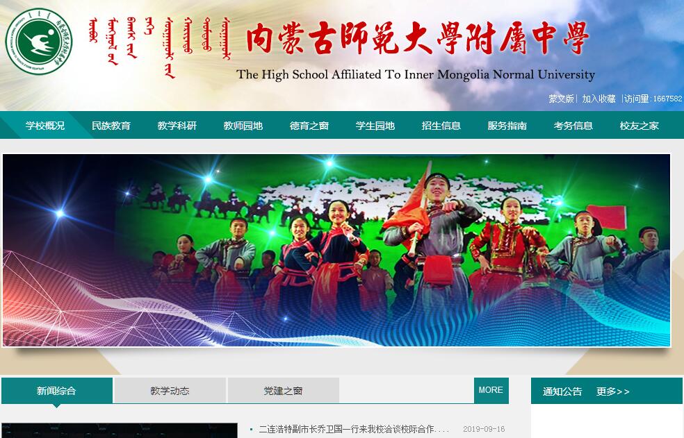 内蒙古师范大学附属中学始建于1954年,由前中华人民共和国副主席乌兰夫提议创办,隶属于内蒙古师范大学,由教育厅直接指导办学,是自治区唯一一所由自治区本级管理的首批示范性普通高中。师大附中位于呼和浩特市文化教育核心区域,北邻内蒙古大学,南靠内蒙古师范大学,东接内蒙古农业大学,钟灵毓秀,学府林立。师大附中“一校三部、统一管理”,设有蒙古语授课部、汉语授课部和国际部,三个学部各具特色、团结协作、相互促进、和谐统一;不同民族、不同背景、不同潜质的学子在附中共聚;蒙语、汉语、英语,书声相融,体现出鲜明的民族团结特色和多元化、国际化特色。师大附中名师荟萃,学养深厚。教师团队素来以高尚的道德修养、丰富的专业知识、扎实的教学功底、开阔的学术视野深得学生的爱戴和社会各界的认同。在这里,具有高级职称的教师113人,其中教授1人,正高级教师4人,特级教师8人,硕士生导师25人;教师中博士2人,硕士111人,占专任教师37.8%;全国优秀教育工作者、优秀教师7人,自治区级优秀教师18人,市级优秀教师、优秀教育工作者26人,自治区级、市级学科带头人、教学能手56人。师大附中校长张伟教授带领新一届领导班子,牢记使命,务实工作,承前启后,开拓创新,以科学民主的工作作风,推进学校各项事业向更宽更广的发展道路迈进。在总结附中60余年积淀的优良治学治校传统基础上,提炼出师大附中一贯的育人价值追求、始终如一秉持的教育理念:“为学生可持续发展和一生幸福奠基”。关注学生当下健康成长,着眼学生未来发展和幸福,是师大附中长期形成的独特教育品质和砥砺前行的教育实践范例。近年来,新一届领导班子正在着力实现附中转型发展,使学校成为“人文气息浓郁,校园环境和谐,学生学习快乐,教师工作幸福,师生健康成长”的乐园,并以博大的胸怀向基层学校输出优质教育资源,助推自治区基础教育和民族教育均衡发展,努力将附中建设成为特色鲜明、区内领航、国内一流的高品质学校。师大附中育人环境优美,教育设施先进,办学条件一流。400米橡胶跑道平整宽阔,标准化足球场绿草成茵,多功能体育馆宽敞明亮,室外篮球场鳞次栉比,排球、网球场一应俱全。完备的实验室和功能教室,为学生探究科学知识以及提高综合素养奠定基础; “科创教育中心”,天文观测台、科学探索馆、天文地理体验馆、植物科学实践馆帮助学生开启探索自然科学的大门;蒙古族民俗文化博物馆,让学生领略深厚绵长的蒙古族历史和文化;校史馆,让学生感受师大附中悠久的办学历史、深厚的文化底蕴和附中人六十余年励精图治取得的丰硕成就。图书馆藏书20余万册并配有数万册电子图书。为了方便学生借阅,学校将图书资源置于距离学生最近的地方,教学楼内每层都设有读书区并配有电子浏览器,扫码即可在手机上得到自己喜欢的图书,学生随时随地可以泛舟书海;为了展现班级文化,每个班级门口都配有电子班牌,学生们自己采集素材、自己编撰,记录青春时光,展现班级风采。楼道大厅设有“诚信柜台”,自行投币,就可以选择需要的文化用品;教学区文化墙由师生们自行设计,颇具创意;温馨的卫生间文化,更加显现附中的文明和品质。近五年,师大附中的教育信息化实现飞跃式发展,成为数字化校园。校园网接入千兆宽带,所有的教室都安装了84吋触摸屏组合机,并建有5个录播教室和导播室,同时拥有丰富的网络课程资源,多媒体信息化教学已经成为新常态。通过网络信息技术手段,开设了大量的在线选修课程,尝试了以翻转课堂为标志的混合式教学和在线学习指导,探索了有利于学生自主学习、个别化学习、提高教学质量的新途径。2015年初,师大附中被教育厅确定为自治区唯一一所自治区级“同频互动课堂”核心学校,同时开始向全区直播优质课堂。两年多来,师大附中已与全区112所学校实现互通互联,直播课达三千余节。师大附中“打造优质同频互动课堂、助力全区教育均衡发展”被教育部基础教育司和中央电教馆推选为“2016-2017年度全国基础教育信息化应用典型案例”并受到表彰奖励。2017年5月份,师大附中跟高等学校一起参与政府公开招标,以明显的资源优势和创新特色获得“国培计划”任务。该项目采取远程师带徒、送教下乡、名师工作坊和集中培训等形式,培训全区6500名中小学教师,培训主体是蒙古语授课教师。作为一所普通高中承担基础教育“国培计划”,是师大附中深入贯彻落实“十九大”精神、利用数字校园网络将自身优质教育资源辐射全区、促进全区基础教育均衡发展的一大创举,是师大附中优质教育资源惠及全区、领航内蒙古基础教育和民族教育发展做出的应有贡献。附中注重加强师资队伍建设,着力于打造学术型、专家型教师团队。自2015年开始,由学校出资35万元开展“课题立项研究”,激励教师进行科研立项,经附中学术委员会评审获准立项45项,2018年由教科研二处组织进行了第二批课题立项申报工作,经专家组审核获准立项29项,在此基础上,鼓励并推荐教师申报各级各类课题研究。2017年,附中教师申报的内蒙古自治区课题5项,2018年申报的内蒙古自治区课题9项。最近5年来,本校教师共发表论文116篇,其中收录在国内核心期刊的有81篇。参与出版的著作共有106本,其中编著有40本,教材41本,科普读物5本,译著4本