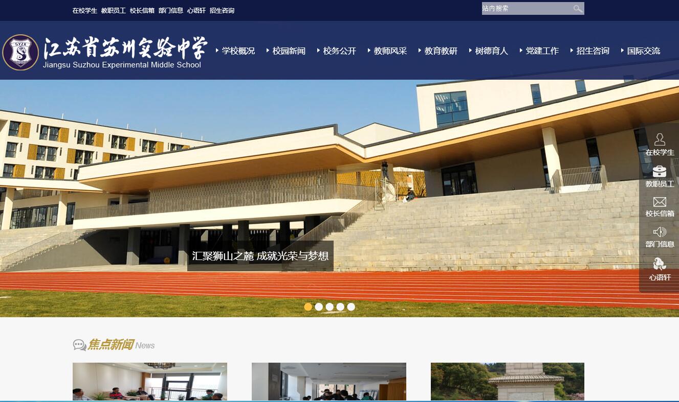 江苏省苏州实验中学位于苏州高新技术开发区的核心区域,坐落于狮子山麓,创办于1994年,1998年通过省重点中学验收,2000年被评为国家级示范高中,2004年评为省首批四星级高中。学校是江苏省内一流名校、苏州教育最优质的品牌之一。2016年起积极推动集团化办学,江苏省苏州实验中学科技城校于2017年成立,位于苏州科技城核心区域,2018年9月新校区正式启用。学校倾力打造以“雄狮精神”为核心的“狮山文化”,并将“雄狮精神”贯穿于学生成长、教师发展的全过程,“汇聚狮山之麓,成就光荣与梦想”成为实验人共同的理想追求。在长期的课堂教学探索和改革的基础上,学校形成了“原味·灵动·高效”的课堂教学特色,引领教学发展。我校坚持 “全面发展、突出个性”的育人理念,在狠抓教学质量的同时,重视提高学生的综合素质和实践能力,开发并实施了丰富多彩的校园活动。学校现有省人民教育家培养对象1人,省333高层次人才培养对象3人,教授级高级教师7人,省特级教师8人,大市学科带头人20多人,形成了由教授级高级教师、省特级教师、市名教师领衔,大市学科带头人引领,区学科带头人、优秀青年教师为中坚的骨干教师团队,保障了学校的高水平发展。 短短24年,学校培养出了2名苏州大市高考状元,6名“李政道奖学金”获得者,30多名学生考入清华、北大,本科率持续保持在95%以上,高考总均分等指标稳居苏州大市第一方阵前列。学校先后获“省教育工作先进集体”“省文明单位”“省教科研先进单位”等40多项省级荣誉,获“市文明单位标兵”“ 市普通高中科学提高教育质量先进学校”等50多项市级荣誉。