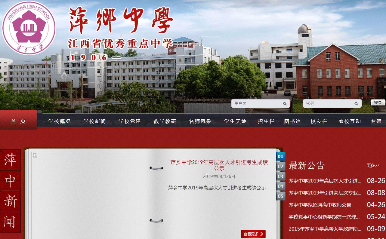 萍乡中学,江西省优秀重点中学,前身为明万历年间的鳌洲书院,1902年兴新学,由清末翰林文廷式倡导,改制为“萍乡学堂”,1906年更名为“萍乡中学堂”,系我国创办最早的现代公立学校之一,也是全国最早的具有保送资格的九所中学之一。她历史悠久,积淀深厚,素有“赣西文化保垒,渌水知识摇篮”之美誉,1963年列为江西省首批重点中学,1991年录入《中国中学名校》,1995年被授予江西省“优秀重点中学”称号。学校先后获得“全国现代教育技术实验学校”、“全国贯彻学校体育工作条例优秀学校”、“国家体育传统项目学校”、“江西省文明单位”、“江西省现代教育技术示范学校”、“江西教育科研基地”、“江西省绿色学校”、“江西省安全文明学校”、“江西省中小学和谐校园”等60多项省级以上荣誉。百年来,学校培养出了包括4名两院院士和36名具有少将以上军衔的将军在内的五万余名优秀学子,他们遍布五洲四海、大江两岸。期中,有彪炳青史的革命志士:黄钟杰、罗运磷、邓贞谦、张国庶、王麓水等;有在中国现代史上颇有影响的张国焘、陈洪时、蔡孟坚等;有科学界精英:著名物理化学家、学部委员(院士)吴学周,自然地理学、地图学、遥感应用和地理信息系统专家、院士陈述彭,光纤通讯专家、院士简水生,中国工程院院士、水稻专家颜龙安,新中国第一代航天科学家李宜敏,核工业建筑专家李日余,小麦育种专家彭启良,生命科学领域成绩斐然的年青博导昌增益等;有政绩卓然的党政军领导:原中宣部副部长凯丰,新中国第一任海关总署署长、原中央调查部部长孔原,原农垦部副部长刘型,原国家教委副主任、总督学柳斌,原昆明陆军学院院长、少将邓福全等;有新中国高教事业的开拓者:彭康、喻德渊、孙德伦以及知名高校的校级领导林增平、胡国根、杨展如等;有教育、文化、艺术、体育等领域的杰出人物:心理学专家、博导杨鑫辉,诗学专家、博导陈良运,作家、剧作家中杰英,二胡演奏家、作曲家黄海怀,音乐家、教授刘天浪,美术家、博导钟涵,运动健将李大培、肖志芸、王达人、欧阳固等。学校现占地320亩,环境优雅,布局合理,规划科学。文化景观错落有致,古樟翠柏遮天蔽日,处处曲径通幽,四季鸟语花香,人文校园、生态校园的理念随处可见。现有56个教学班,学生3000余人,在职教职员工282人,其中,特级教师4人,高级教师112人,省部级劳模5人,省级学科带头人8人,国家级骨干教师5人,省级骨干教师35人,研究生66人。学校设施完备,已经达到国家高级中学一类装备标准,现代教育技术已广泛使用。有装备一流的教学大楼,高标准的实验室,也有集电教、信息、图书阅览于一体科技馆,还有一流的多功能报告厅、电子备课室、电子阅览室、全数字语音室、塑胶田径场,还有独立的美术、音乐大楼、体艺馆。天文观测台,校园信息中心、电化教学双向控制系统等现代化设备也应有尽有,这些一流的软硬件设备为学生的腾飞提供了可靠的保障。百年萍中始终坚持正确的办学方向,全面贯彻教育方针,全面实施素质教育,大力倡导教育科研,坚持不懈地开展教育改革,教育质量和办学水平不断提高。学校高考成绩长盛不衰,历年来稳居全市第一,全省前茅,培养了众多北大、清华学子及少年大学生,2009年马毅鹏同学被保送到清华大学,2010年熊纬佳同学以649分荣夺全市理科状元并被清华大学录取。近几年来,通过改革选拔培养办法、聘请外地专家讲座、组织学生进清华北大实验室、赴日访问交流等,学校学科竞赛硕果累累,在各类国家奥林匹克竞赛中屡有斩获,现已有180多名学生获国家三等奖以上奖励。仅2009年,学校就有杨正伟等34名学生获高中应用物理竞赛、理化生及信息学奥赛国家一、二、三等奖;熊纬佳等30名同学在全国英语能力、听力竞赛中获一、二、三等奖;韩颖、胡滨洋、张天奕参加江西省英语听说能力电视大奖赛,获团体一等奖。尤其是青少年信息学已成为省内领先学科,继2006年2名同学、2007年3名同学获全国一等奖后,2008年有马毅鹏、卢震鹏、王天一、李毅坚四位同学获全国信息学奥林匹克竞赛一等奖;2009年又有卢震鹏、杨双睿同学获全国信息学奥林匹克竞赛国家级(赛区)一等奖,其中卢震鹏同学还入选了信息学奥林匹克竞赛国家冬令营……学校特色活动独树一帜,率先在江西中小学中开展无线电测向运动,成为北京市外唯一一所“青少年科技俱乐部基地”的学校……这里的学生,在世界的舞台上渐绽光芒:有中央电视台“三星智力快车”周冠军,有国家级发明小能手,也有在日本岗山纵论世界环保的科技小星,还有29届北京奥运会火炬手,更有一大批向往全国知名院校的有志青年……今天,学校在坚持“劳、谦、坚、实”的校训,坚持“以德求得,因材育才”的办学理念和“立足新起点,开拓新思路,落实新举措,实现新突破,创造新辉煌”的工作要求下,创全面发展之优,示素质教育之范,建设绿色校园、书香校园、人文校园、活力校园、和谐校园、幸福校园,用务实的脚步,不懈的追求,向着“现代化、高质量、有特色,全市领航、全省一流、全国知名、人民满意”的办学目标大步前进。