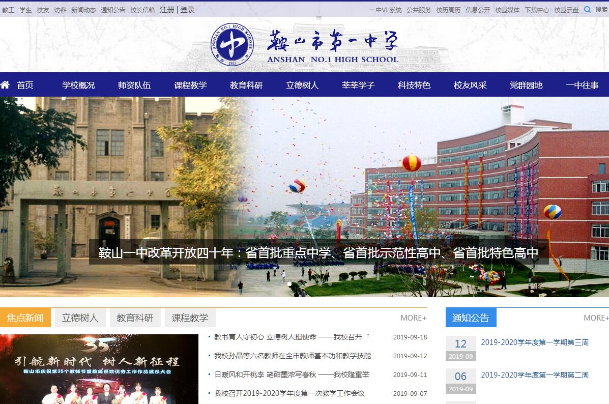 鞍山市第一中学始建于1923年,原名为鞍山中学堂。1946年,著名抗日将领孙立人将军在此创办“东北清华中学”。1950年定名为鞍山市第一中学,1978年被确定为辽宁省重点中学,2002年被评为辽宁省首批示范性高中,2012年被评为辽宁省首批科技教育特色高中,2013年组建鞍山一中教育集团,包括一中本校、新元高中分校和高新区实验学校。2017年学校建设完成全东北首家新高考智慧校园。 学校依山傍水,环境幽雅。现有在校生2300余名,56个教学班。学校正高级教师、特级教师、首席教师、特色教师名师荟萃;科技馆、体育馆、生态馆设施一流, STAR公演、英语剧、社团活动丰富多彩,运动会、科技节、体育节、艺术节异彩纷呈。九十五载砥砺耕耘,春华秋实;九十五载滋兰树蕙,桃李芬芳;九十五载兢兢业业,弦歌不辍。鞍山一中秉承“礼健智诚”校训,坚持“以学生发展为本,为学生可持续发展和终身幸福奠定基础”的办学理念,坚持“明礼立德,博智立学,健体立身,诚信立人,努力成为未来具有本土情怀和国际视野的拔尖创新人才”的育人目标,发扬“追求卓越”的学校精神,全面实施素质教育,努力把学生培养成为求实、创新、自强不息、文明高尚的未来人。把学校建设成为培育创新拔尖人才成长的沃土,推进学校优质特色发展,取得了辉煌的办学成就。学校先后被评为全国教育系统先进集体、教育部“中小学课外文体活动工程”示范校、教育部全国中小学教育信息化示范校、全国心理健康教育示范校、辽宁省科研兴校百强校、辽宁省高中课程改革先进集体、辽宁省科技教育特色实验学校、辽宁省校园文化建设品牌学校、鞍山市中小学创新教育基地和鞍山市科普教育基地等荣誉称号。名师的学校即为名校,在“追求卓越”的学校精神引领下,鞍山一中造就了一支教育观念新、教学能力强、结构合理、实力雄厚的教师队伍。在245名一线教师中有正高级教师4人,特级教师5人,省级学科带头人 4 人,国家级、省级、市级骨干教师39人,市首席责任教师26人,高级教师133人,78人具有硕士学位。我校积极推进“新师重塑行动”计划,一是实施名师工程。积极组织学科带头人、名师开展示范研讨课活动,公开发表论文,开设一中讲坛,做教育教学报告,开展科研课题研究,指导青年教师上课。二是实施骨干教师培养工程。成立学校骨干教师研修班,以新课程改革为载体,通过校本伙伴式研修的方式,大力提升骨干教师在课堂教学、课题研究、课程构建等方面的专业素养,助力成长,创优立业。三是实施青蓝工程。为青年教师选择导师,实行师徒结对,指导新教师发展。鞍山一中坚持质量立校,秉承“礼健智诚”校训,努力培养高素质拔尖创新人才,教育质量和高考成绩一直稳居全省前列。学校被北京大学首批确定为“中学校长实名推荐制”学校,被清华大学确定为自主选拔“新百年领军计划”推荐资质学校,被中国人民大学、复旦大学和同济大学确定为“中学校长直荐学生资格”中学,同时被中国科技大学等40余所知名大学确定为“优质生源基地”。近三年来,鞍山一中毕业生国际国内升学成绩连创新高,各项指标均位居全省同类学校前列,其中50余人被美国哥伦比亚大学、康奈尔大学和纽约大学、英国剑桥大学、加拿大多伦多大学、法国里昂大学、澳大利亚悉尼大学和新加坡南洋理工大学等多所国际名校录取,30余人考入清华大学和北京大学,文理科综合一本率达到95%,300余人取得高校自主招生优惠政策。鞍山一中坚持文化育校,强化以办学理念融入教育教学,立足拔尖创新人才培养,推行浸濡体验式德育教育和“五力提升”教育。学校注重以优质课程体系建设为载体,积极推进生本首席式课堂教学、突出“立德树人、教书育人”,“以生为本、学为中心”,进一步提升教学效率和教学质量。同时学校注重学生发展指导,积极构建多元成长平台,引导学生基于团委、学生会和社团联合会广泛开展和参与科技节、艺术节、体育节等校园文化活动,实现学生自我管理、自主发展,努力塑造符合未来社会发展需求的具有领袖气质的复合型人才。目前我校建立学生社团30余个,创办《学苑》、《新锐》报等校刊10余种,参加人数近千人。学校发展,硬件是基础、软件是关键、特色是灵魂。鞍山一中注重特色强校,积极整合学科教学、人文教育、社团活动和研究性学习,探索形成“一核、二化、四融合、五重点”的特色发展策略,成果显著。2012年被评为辽宁省首批科技教育特色高中。近年来,在学科奥赛和科技竞赛中鞍山一中学子摘金夺银,成绩突出,先后有270余人通过竞赛进入名校就读。其中吕廷博同学夺得物理奥赛国际金牌,校机器人代表队夺得ROBCUP机器人世界杯赛金奖。在全国物理、数学和生物竞赛中,我校共获得国际金牌1块,全国金牌5块、银牌17块、铜牌14块,73人获得省一等奖。在全国青少年科技创新大赛中,我校获得全国银奖4项,省级金奖39项、银奖12项,大学专项奖7项。2018年10月,鞍山一中第六届校园科技节盛大启动,18项精彩活动近1000名同学参加获得表彰,创客世界精彩绽放。鞍山一中坚持科研兴校,注重以学校发展型、引领型课题开展研究,“十一”五以来学校共有20项课题200余人次获得国家和省级奖励,其中《信息技术与学科课程整合的教学模式研究》获得全国一等奖,《信息技术环境下的