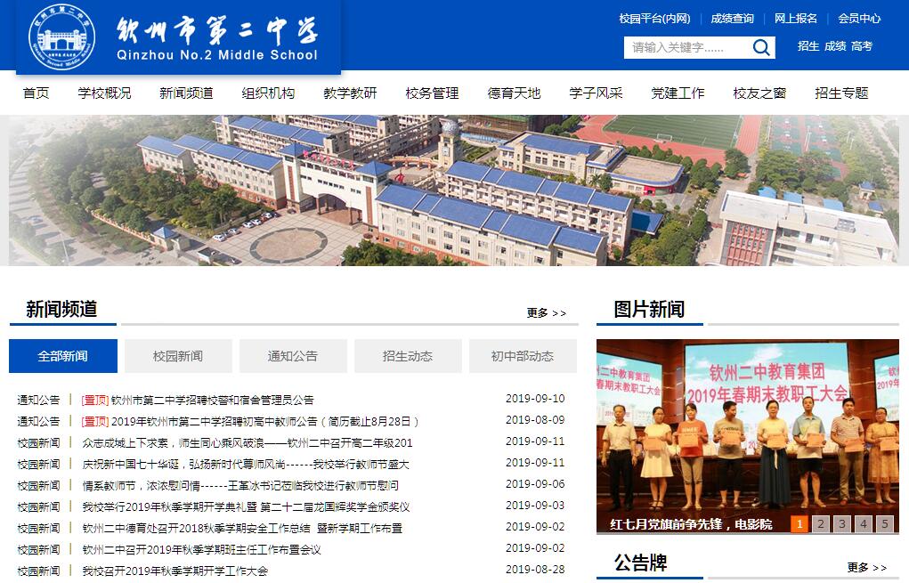 | 网站简介: 广西钦州市第二中学创办于1974年,是广西示范高中、广州军区国防生生源基地、全国模范职工之家、全国体育运动先进学校、全国依法治校示范学校,是中国科技大学等国家重点高校的生源基地。 2004年8月,钦州市第二中学新校区正式落成启用。新校区总投资1.5亿人民币,开创了广西区示范高中整体迁建的历史。学校具有广西一流水准的校园校舍,实现了教学现代化、办公自动化、管理网络化,为学生提供了求学、生活的理想场所。钦州市第二中学实行名师治教、科研兴校的工作思路。学校拥有一流的教师队伍,任课教师均为本科以上学历,其中研究生有30多人,一大批中青年教师成为自治区和钦州市的学科带头人,使学校成为钦州市两个“人才小高地”之一,教育教学成绩一直在广西一流中学的前列,成为北部湾沿海地区大学生的摇篮,在老百姓心目中享有崇高的声誉。 |