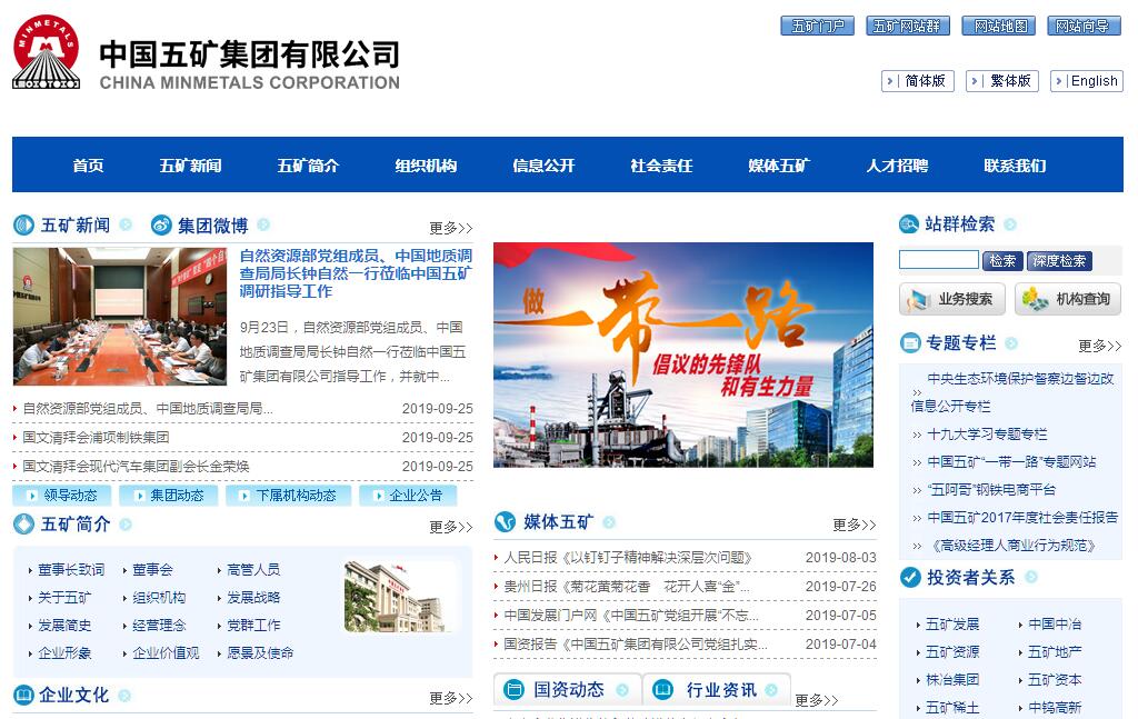 中国五矿集团有限公司(简称中国五矿)由原中国五矿和中冶集团两个世界500强企业战略重组而成,是以金属矿产为核心主业、由中央直接管理的国有重要骨干企业,国有资本投资公司试点企业,2018年世界500强排名109位,总部位于北京。旗下拥有8家上市公司,包括中国中冶(601618.SH、1618.HK)A+H两地上市公司,五矿资本(600390.SH)、五矿稀土(000831.SZ)、五矿发展(600058.SH)、中钨高新(000657.SZ)、株冶集团(600961.SH)五家内地上市公司,以及五矿资源(1208.HK)、五矿地产(0230.HK)两家香港上市公司。截止2018年底,公司管理的资产规模达到1.86万亿元,其中资产总额9115亿元,管理金融资产9499亿元,境外机构、资源项目与承建工程遍布全球60多个国家和地区。中国五矿以“世界一流金属矿产企业集团”为愿景,以“资源保障主力军、冶金建设国家队、产业综合服务商”为战略定位,率先在全球金属矿产领域打通了从资源获取、勘查、设计、施工、运营到流通、深加工的金属矿产领域全产业链布局,形成了以金属矿产、冶金建设、贸易物流、金融地产为“四梁”,以矿产开发、金属材料、新能源材料,冶金工程、基本建设,贸易物流,金融服务、房地产开发为“八柱”组成的“四梁八柱”业务体系。在金属矿产领域,公司金属矿产资源储量丰富,境外矿山遍及亚洲、大洋洲、南美和非洲等地,拥有邦巴斯铜矿、杜加尔河锌矿、巴新瑞木镍钴矿等一批全球一流矿山,铜、锌产量位居全球前十,钨、锑、铋资源量位居全球前列。在冶金工程建设领域,公司拥有世界一流的冶金建设企业,先后承担了国内几乎所有大中型钢铁企业主要生产设施的规划、勘察、设计和建设工程,是中国钢铁工业的开拓者和主力军,进入新世纪以来,依托强大技术优势进军国际市场,先后承担越南河静台塑钢铁基地、马来西亚关丹联合钢铁项目、印度TATA钢铁、乌克兰阿赛罗米塔尔等近几年全球几乎所有大中型绿地钢铁设计建设项目,积累了贯穿各环节的核心技术优势和设计施工能力,向着打造世界第一冶金建设国家队的目标大踏步前进。同时,依托多年在冶金建设领域所形成的高技术建设优势,公司作为国家指派的第一批支援深圳建设的施工企业和设计单位之一,完成了第一版深圳城市设计规划,在承建我国第一个公开招标项目时创造了“深圳速度”,还完成了多个城市新区的整体开发建设,是国内知名的城市建设全方位方案解决专家;公司在战略新兴产业方面,提前布局地下综合管廊建设、海绵城市、特色主题工程建设等六大业务领域,形成显著的竞争优势。在贸易物流领域,公司拥有遍布全球的贸易流通网络,全球采购、全球营销,金属矿产品流通规模国内领先。在金融、地产领域,公司拥有多个金融业务牌照,信托、租赁、证券、期货、财务公司、基金等业务优势显著;公司是国资委首批确定的16家以房地产为主业的央企之一,旗下五矿地产、中冶置业,享有较高知名度。公司科技创新能力突出,截至2018年底,共拥有成建制的研究设计机构14家,国家重点实验室等各类国家级科技研发平台37个,科技活动人员2.5万人,中国工程院院士2人,专业技术人员超过8万名,累计有效专利达到27046件,主编/参编国际国家标准800余项,综合科技实力位居央企前列。步入新时代,在习近平新时代中国特色社会主义思想的指引下,全体五矿员工正秉承“珍惜有限,创造无限”的发展理念,积极践行“一天也不耽误,一天也不懈怠”的企业精神,努力发挥金属矿产领域的国有资本投资公司功能,为打造世界一流的金属矿产企业集团而不懈奋斗。