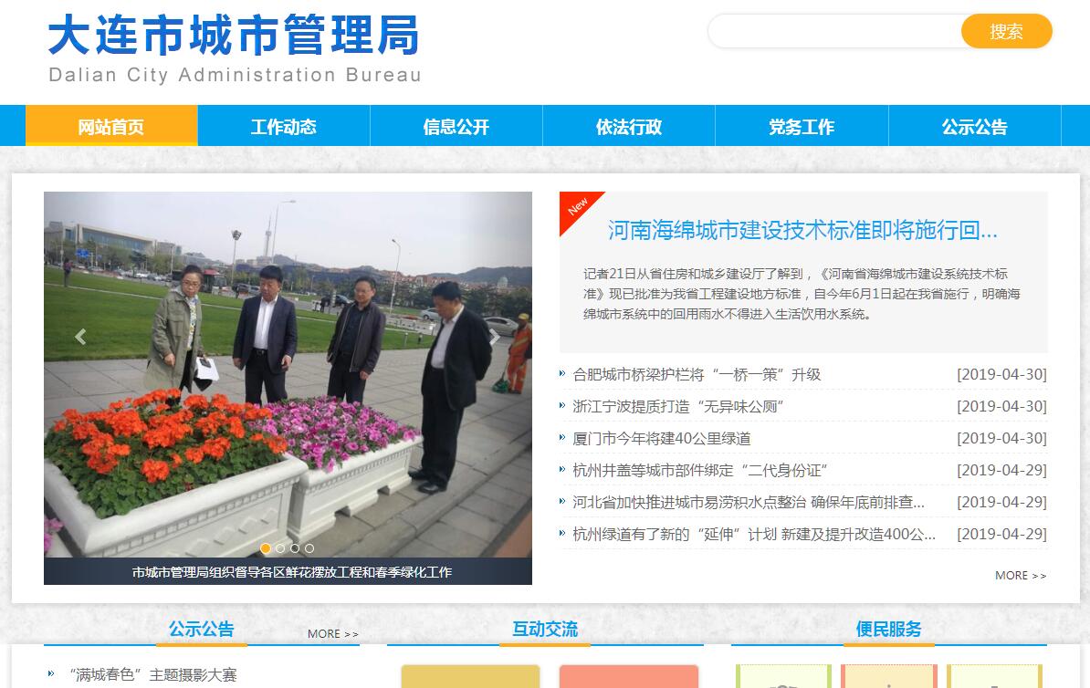 | 网站简介: 大连市城市管理局主要职责: 一、贯彻执行国家、省关于市政设施管理、市容环境卫生管理、园林绿化管理以及依法确定的、与城市管理密切相关、需要纳入统一管理的其他城市管理(统称城市管理,下同)和行政执法方面的方针、政策和法律、法规、规章,起草相关地方性法规和市政府规章草案及规范性文件并组织实施,制定行业作业标准、操作规程等管理办法并指导监督实施。二、负责编制城市管理中长期规划和年度计划并组织实施,负责编制市政、市容、环卫、园林绿化等设施年度维护计划和资金使用计划并指导监督实施。三、负责全市城市管理行政执法的管理工作,拟订城市管理行政执法工作规范和计划并组织实施,负责组织开展纳入城市管理综合执法范围的跨区域、重大复杂违法违规案件以及上级交办案件的查处工作。四、负责占道停车场设置管理工作,承担市园林绿化委员会城市组的工作,承担城市除雪指挥部的具体工作。五、承担指导区市县、开放先导区业务工作。六、对大连市市政公用事业服务中心实行归口管理。七、完成市委、市政府交办的其他任务。八、职能转变。加强对全市城市管理和行政执法工作的业务指导、组织协调、监督检查和考核评价。 |
