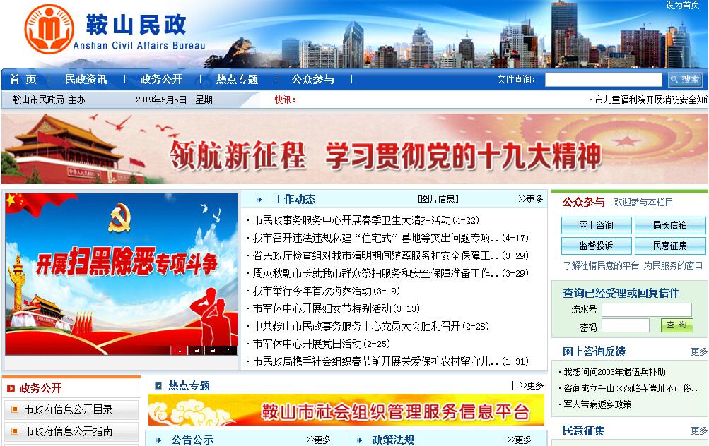 鞍山市民政局是主管有关社会行政事务工作的市政府工作部门,主要职责:一、贯彻执行国家关于民政工作的方针、政策和法律、法规,研究拟订全市民政事业发展规划和相关政策法规,起草有关地方性法规、市政府规章草案,并组织实施和监督检查。指导、推进民政工作的改革与发展。二、负责社会团体、民办非企业单位的登记管理和监督检查工作;起草社会团体、民办非企业单位管理的政策和规章,并监督实施;查处社会团体、民办非企业单位的违法行为,依照有关规定,取缔非法社会团体和民办非企业单位;指导和监督县(市)、区对社会团体、民办非企业单位的登记管理和执法监察工作。三、承担市双拥工作领导小组的日常工作,指导、组织全市拥军优属活动;研究提出各类优抚对象的优待、抚恤、补助标准及国家机关工作人员伤亡抚恤标准的调整意见;负责革命烈士、因公伤亡人员褒扬的审核、报批工作;负责接收牺牲、病故军官随军家属异地安置工作;负责革命烈士纪念建筑物的管理工作。四、指导和协调全市退役士兵(含士官)接收安置工作;指导全市退役士兵职业技能培训和推荐就业工作;负责复员干部、移交地方安置的军队离退休干部和军队无军籍退休退职职工的接收安置工作;负责军队离退休干部休养服务机构的管理工作。五、拟订全市救灾工作政策,组织、协调全市救灾工作;组织自然灾害救助应急体系建设,组织检查、上报灾情,统一发布灾情;管理、分配市级救灾款物并监督其使用;组织指导灾民安置和救灾捐赠,实施国家减灾规划;会同有关部门组织灾民临时安置和遣返事宜,承担市减灾委员会的具体工作。六、牵头拟订全市社会救助规划、政策,健全城乡社会救助体系,负责城乡居民最低生活保障、医疗救助、临时救助工作;组织和指导扶贫济困经常性捐助等社会互助活动,管理全市性福利募捐义演;指导县(市)、区社会救助工作。七、拟订全市城乡基层群众自治建设和社区建设政策,并指导实施;负责基层政权建设和城乡社区建设工作;指导、监督《村民委员会组织法》和《居民委员会组织法》的贯彻实施,推动村(居)民自治和基层民主政治建设;制定社区建设政策措施。八、负责婚姻登记和婚事服务的指导和监督工作;倡导婚姻习俗改革。九、负责行政区划工作;拟定全市行政区划规划;负责乡(镇)以上行政区域的设立、撤消、调整、更名和界线变更及政府驻地迁移的审核报批工作。负责全市行政区域界线的勘定和管理工作;承办县际边界争议的调查和调处。十、负责乡(镇)以上行政区划名称、重要的自然地理实体等地名命名、更名的审批报批;负责全市地名标志、门牌设置工作;负责市内标准地名图书资料的审定工作。十一、拟订和实施全市社会福利事业发展规划和各类福利设施标准;负责老年人、孤儿、五保户等特殊困难群体权益保护的行政管理工作;综合管理全市慈善事业发展,组织、指导社会捐助工作;负责儿童收养登记管理工作;负责生活无着流浪乞讨人员的救助管理工作;拟订社会福利企业的扶持政策,负责福利企业的兴办、管理工作。十二、贯彻执行国家殡葬管理政策,负责全市殡葬管理工作,推进殡葬改革。十三、会同有关方面按规定拟订全市社会工作发展规划、政策和职业规范,推进全市社会工作人才队伍建设和相关志愿者队伍建设。十四、指导市老龄委员会办公室业务工作。十五、承办市政府交办的其他事项。