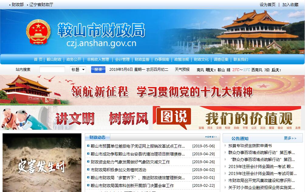 鞍山市财政局主要职责:(一)贯彻执行国家、省财税方针及政策,拟订市财政规划和改革方案并组织实施;分析预测经济形势,参与制定各项宏观经济政策,提出运用财税政策实施宏观调控和综合平衡社会财力的建议,拟订市与县财政体制,执行中央与地方、国家与企业的分配政策,完善鼓励公益事业发展的财税政策。(二)负责起草财政、财务、会计、行政事业单位国有资产管理的地方性法规草案和市政府规章。(三)负责编制年度市本级预算草案并组织执行;受市政府委托,向市人民代表大会报告市本级、全市年度财政预算及其执行情况,向市人大常委会报告财政决算和预算执行情况;负责审核批复部门(单位)的年度预决算;完善转移支付制度;指导县、乡(镇)财政管理工作。(四)负责市本级各项财政收入、政府性基金和财政专户管理;管理财政票据。(五)组织制定全市财政国库管理和国库集中收付制度;指导和监督全市财政国库业务,按规定管理国库现金。(六)贯彻执行国家、省税收法律、行政法规及有关政策,研究制定市管理权限内有关税收政策及税收政策调整方案并组织实施。(七)贯彻执行国家、省政府采购政策,负责制定市政府采购制度,监督管理政府采购活动;牵头负责建立健全政府向社会力量购买服务制度,监督政府向社会力量购买服务活动。(八)负责市本级各项财政支出管理,研究制定需要全市统一规定的开支标准和支出政策;负责市本级行政事业单位因公出国(境)经费管理。(九)依据职责分工,负责审核和汇总编制全市国有资本经营预决算草案,制定国有资本经营预算的制度和办法,收取市本级企业国有资本收益;拟订并组织执行全市企业财务管理法规和制度;按规定管理金融类企业国有资产有关工作;审批市本级行政事业单位资产配置、使用、处置;管理行政事业单位对外投资、出租、出借、担保审批等事项,以及行政单位未脱钩的经济实体和事业单位投资兴办的企业。(十)负责办理和监督市财政的经济发展支出、政府性投资项目支出预算的财政拔款,参与拟订市建设投资的有关政策,制定基本建设财务制度;负责有关政策性补贴和专项储备资金财政管理工作,组织审查财政性投资工程预(结)算、竣工决算;承担国家赔偿费用管理工作;负责财政支农支出和农业综合开发工作。(十一)编制和执行年度土地出让金收支预算,监管市土地管理部门土地出让金的征收和缴库;审核各项土地储备成本支出。(十二)会同有关部门拟订全市社会保障资金(基金)的财务管理制度,编制市本级社会保障预决算草案,会同有关部门管理市财政社会保障和就业及医疗卫生支出。(十三)贯彻执行国家、省关于地方政府债务管理的制度和政策,拟订全市政府性债务管理办法和实施措施,做好风险防范;统筹安排全市政府重点项目融资工作并组织具体实施;按规定管理外国政府和国际金融组织贷(赠)款。(十四)主管全市会计工作,贯彻落实国家、省会计法律法规和规章制度,监督和规范会计行为;负责全市会计从业资格、代理记账管理工作;组织会计执业和专业技术资格考试工作;指导和管理社会审计。(十五)监督检查财税法规、政策的执行情况和财政资金使用管理情况,反映财政收支管理中的重大问题,提出加强财政管理的政策建议。(十六)承办市政府交办的其他事项。