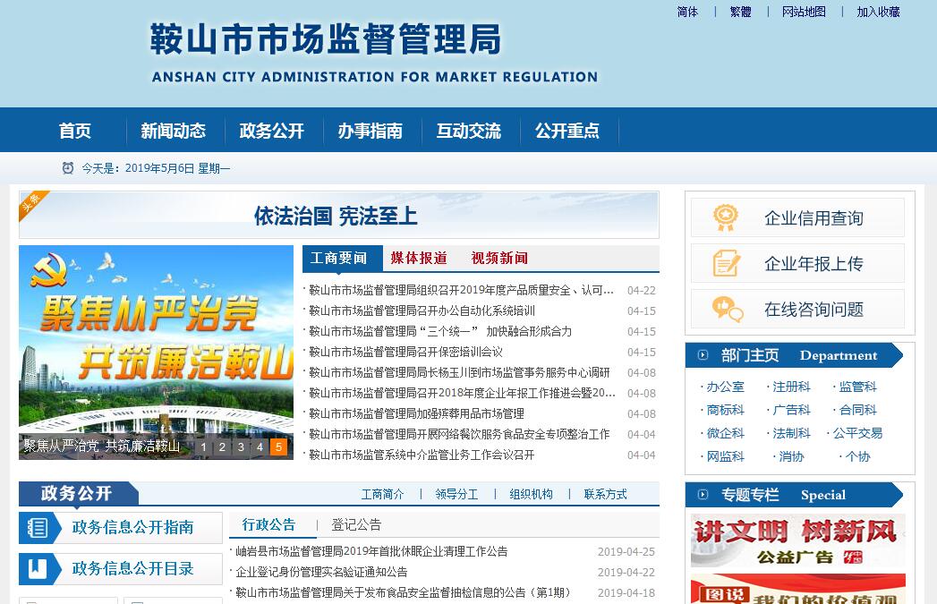 鞍山市市场监督管理局是鞍山市机构改革组建的新部门,为鞍山市人民政府工作部门。2018年12月30日,鞍山市市场监督管理局(鞍山市知识产权局)举行挂牌仪式,标志着鞍山市市场监督管理局(鞍山市知识产权局)正式成立,鞍山市市场监督管理局“三局合一”执法体制正式建立。新组建的鞍山市市场监督管理局将市工商行政管理局、市质量技术监督局、市食品药品监督管理局的职责以及市发展和改革委员会(市物价局)的价格监督检查与依法查处价格违法行为相关职责,市科技与知识产权局的知识产权管理相关职责等整合,作为市政府工作部门。鞍山市市场监督管理局加挂市知识产权局牌子。保留市食品安全委员会,具体工作由市市场监督管理局承担。不再保留市工商行政管理局、市质量技术监督局、市食品药品监督管理局。鞍山市市场监督管理局主要职责:负责市场综合监督管理,统一登记市场主体并建立信息公示和共享机制,组织市场监管综合执法工作,规范和维护市场秩序,组织实施质量强国战略,负责工业产品质量安全、食品安全、特种设备安全监管,统一管理计量标准、检验检测、认证认可工作,负责知识产权保护、商标、专利、原产地地理标志管理,指导商标、专利执法工作等。