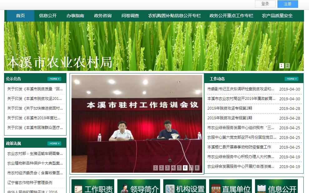 本溪市农业农村局主要职责:(一)贯彻执行国家和省有关“三农”工作的法律法规和方针政策,拟订全市种植业、畜牧业、农业机械化、粮食流通与储备等产业和农村经济中长期发展规划并指导实施,推进农业依法行政。(二)承担完善我市农村经营管理体制的责任,指导农村土地承包、耕地使用权流转和承包纠纷仲裁管理,指导、监督减轻农民负担和村民筹资筹劳管理工作,指导农村集体资产和财务管理,拟订农业产业化经营的发展规划与具体政策并组织实施,指导、扶持农业社会化服务体系、农村合作经济组织、农民专业合作社和农产品行业协会的建设与发展。(三)指导粮食等主要农产品生产,组织落实促进粮食等主要农产品生产发展的相关政策措施,引导农业产业结构调整和产品品质的改善,促进农业产前、产中、产后一体化发展,组织拟订促进农产品加工业发展的具体政策、规划并组织实施,提出农业产业保护政策建议,指导农产品加工业结构调整、技术创新和服务体系建设,提出促进大宗农产品流通的政策建议,研究制定大宗农产品市场体系建设与发展规划,培育、保护和发展农产品品牌,配合有关部门组织实施农业综合开发项目,推进北药产业、大健康产业和休闲旅游产业发展。(四)承担提升农产品质量安全水平的责任,依法开展农产品质量安全风险评估,发布有关农产品质量安全状况信息,负责农产品质量安全监测,实施农业转基因生物安全标准和技术规范,健全市农业检验检测体系,依法实施符合安全标准的农产品认证和监督管理,组织农产品质量安全的监督管理。(五)组织、协调农业生产资料市场体系建设,依法开展农作物种子(种苗)、种畜禽、农药、兽药、饲料、饲料添加剂的许可及监督管理,执行有关农业生产资料标准并会同有关部门监督实施,依法开展有关肥料的监督管理。(六)管理农业农村经济信息,监测分析农业和农村经济运行,开展相关农业统计工作,发布农业和农村经济信息,负责农业信息体系建设,指导农业信息服务。(七)承担农作物重大病虫害预测预报及防治、农业防灾减灾责任,会同有关部门制定动植物防疫检疫政策并指导实施,指导动植物防疫和检疫体系建设,组织、监督对市内动植物的防疫检疫工作,发布疫情并组织扑灭,组织植物检疫性有害生物普查,监测、发布农业灾情,组织种子、化肥等减灾物资储备和调拨,提出生产救灾资金安排建议,指导紧急救灾和灾后生产恢复。(八)制定农业科研、农技推广及其队伍建设的规划、计划和有关政策,会同有关部门组织全市农业科技体系创新和农业产业技术体系建设,组织实施农业领域的高新技术和应用技术研究、农业科技成果转化和技术推广,负责农业植物新品种保护,会同有关部门拟订农业农村人才队伍建设规划并组织实施,指导农民职业技能培训,承担农业系统劳动模范管理工作。(九)拟订耕地及基本农田质量保护与改良政策并指导实施,依法管理耕地质量,运用宜农措施发展节水农业,拟订并实施农业生态建设规划,指导农村可再生能源综合开发与利用,指导农业生物质产业发展,指导生态农业、循环农业等发展。(十)拟订全市农业机械发展规划,引导农业机械结构调整,负责已投入使用的农业机械的质量和安全管理工作,负责农业机械统计等工作。(十一)拟订市农垦系统产业发展规划和年度计划并组织实施;指导市农垦系统产业结构调整及农垦财务管理工作。(十二)拟订县域经济发展有关政策和措施,协调县域经济发展中的重大问题,负责全市社会主义新农村建设的规划、协调、指导和督察督办工作。(十三)拟订全市粮食流通和粮食储备的具体政策、规章制度、中长期发展规划、购销储存平衡计划和调控办法并组织实施,承担全市粮食监测预警和粮食应急任务,负责对粮食流通领域的监督检查行政执法工作,负责全市粮油仓储管理工作,负责全市军粮和救灾粮供应管理工作,指导粮食企业开展产业化经营,保障驻军及政策性用粮的粮油供应。(十四)拟订全市扶贫开发工作的政策、规划并组织实施,协调社会各界的扶贫工作,协调拟订市级扶贫资金分配方案,指导、检查、监督扶贫资金的使用。(十五)指导畜牧业结构调整、标准化生产、畜产品加工和规模饲养;组织实施畜禽遗传资源、饲料资源和草原资源的保护工作;负责饲料和草原监督管理,指导草原鼠虫害防治和防火工作;负责食用畜产品从养殖环节到进入批发、零售市场或生产加工企业前的质量安全监督管理工作,负责畜禽屠宰环节和生鲜乳收购环节质量安全监督管理,负责无公害动物产品的监督管理,负责畜产品地理标志相关工作;负责组织、协调、监督、指导全市重大动物疫病防治和扑灭工作;负责动物及动物产品检疫、兽药残留、兽医实验室监督管理工作;负责兽医执业人员和兽医执业单位监督管理工作;负责兽用生物制品安全、饲料、兽药研制、生产、经营、使用监督管理工作;组织实施饲料、兽药的质量管理规范;负责全市种畜禽卫生监督管理和繁育体系建设工作;拟订畜牧业生产加工、草原保护与建设、动物卫生和畜产品质量安全科技发展规划和人才培训规划;负责全市定点畜禽屠宰的监督管理工作。(十六)承办市政府交办的其他事项。