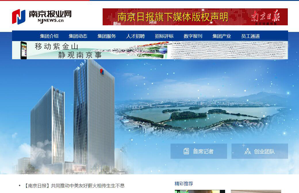 南京报业传媒集团是经国家新闻总署批准、于2002年12月17日挂牌组建的媒体集团。旗下有南京日报、金陵晚报、周末报、大众证券报、江苏商报、东方卫报、现代家庭报、家教周报、都市文化报、南京手机报、金陵瞭望杂志,以及龙虎网、南京报业网、中国家庭教育网等媒体;有时代传媒股份公司及各媒体公司十余家,业务涉及广告经营、印刷发行、数字出版、信息服务、物流配送、电子商务等领域。作为全市宣传舆论的主要阵地和文化产业的重要力量,近些年来集团抢抓媒体融合战略机遇,以建设基于移动互联的新型主流媒体集团为目标,实施“塑头雁”、“换底盘”、“育雏鹰”三项核心工程,力推深度融合整体转型。集团现已建立“报、网、博、信、端”融合传播体系并开始走向移动优先的传播架构;同时在政务舆情、教育培训、文化创意、旅游休闲、健康养老、智慧社区等价值方向上深耕拓展,形成以“互联网+”、“创意+”为核心的新型业务支撑。集团旗下江苏龙虎网信息科技股份有限公司(股票代码:831599)、南京虎凤蝶电子商务科技股份有限公司(股票代码:837815)两家企业已在“新三板”挂牌。今年以来,在市委市政府的关心支持下,集团河西新媒体大厦列入2017年度全市重点工程,计划三年建成,成为新媒体的集聚地、新应用的孵化地和新融合的催生地;板桥国家数字出版基地在一期完成80亩后,二期50亩建设即将启动;海福巷“南报文创园”已改建完成,正处在后期招商之中。这些工程将为集团融合转型奠定新的支撑。