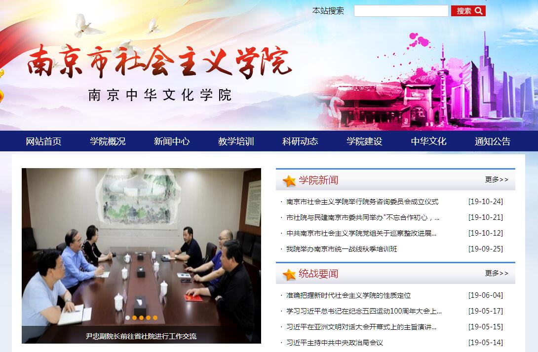 | 网站简介: 2004年8月,南京市社会主义学院(简称南京社院)开始筹建,于2006年初完成筹建工作,初步实现“四有”。即:有编制、有人员、有经费、有办公场地。一是市机构编制委员会印发了《南京市社会主义学院主要职责、内设机构和人员编制规定》,明确我院为正局级事业单位,加挂南京中华文化学院牌子。内设2个职能处室:办公室、教务处。事业编制10名,其中5名参照公务员管理。二是通过联动公选、公务员考试等形式,选拔、招录干部。目前,学院院长1名(兼),党组书记1名,副院长1名,副巡视员1名,办公室干部2名,教务处干部3名。三是市财政每年下拨专项培训经费。四是解决了办公场地问题。2006年4月,南京社院隆重举行揭牌仪式暨2006年春季开学典礼。时任江苏省委常委、南京市委书记罗志军同志(现任江苏省委副书记、江苏省省长)亲手为南京市社会主义学院和南京中华文化学院揭牌并作重要讲话。这标志着南京社院(南京中华文华学院)开始正式履行职能。 |