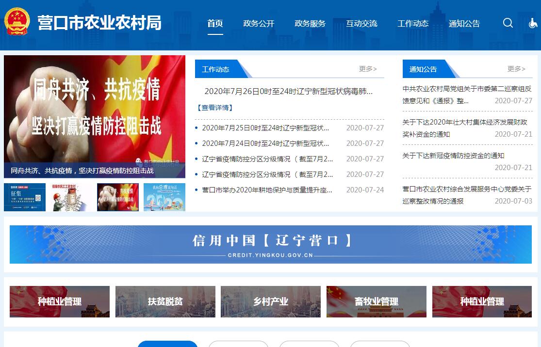 营口市农业农村局贯彻落实党中央关于“三农”工作的方针政策和决策部署,在履行职责过程中坚持和加强党对“三农”工作的集中统一领导。其主要职责是:(一)统筹研究和组织实施全市“三农”工作的发展战略、中长期规划、重大政策。贯彻落实国家有关扶贫开发的方针政策和法律法规,组织、协调、指导全市脱贫攻坚工作,组织实施精准扶贫、精准脱贫。组织起草农业农村有关规范性文件草案,指导农业综合执法。拟订并组织实施全市涉农和扶贫开发工作的政策、规划,拟订农村贫困人口扶持标准。(二)统筹推动发展农村社会事业、农村公共服务、农村文化、农村基础设施和乡村治理。牵头组织改善农村人居环境。指导农村精神文明和优秀农耕文化建设。指导农业行业安全生产工作。(三)贯彻落实国家、省关于深化农村经济体制改革和巩固完善农村基本经营制度的政策。负责农民承包地、农村宅基地改革和管理有关工作。负责农村集体产权制度改革,指导农村集体经济组织发展和集体资产管理工作。指导农民合作经济组织、农业社会化服务体系、新型农业经营主体建设与发展。(四)指导乡村特色产业、农产品加工业、休闲农业发展工作。提出促进大宗农产品流通的建议,培育、保护农业品牌。发布农业农村经济信息,监测分析农业农村经济运行。承担农业统计和农业农村信息化有关工作。(五)负责种植业、畜牧业、渔业、农垦、农业机械化等农业各产业的监督管理。指导粮食等农产品生产。组织构建现代农业产业体系、生产体系、经营体系,指导农业标准化生产。负责远洋渔业管理和渔政渔港监督管理。(六)负责农产品质量安全监督管理。组织开展农产品质量安全监测、追溯、风险评估。提出技术性贸易措施建议。参与制定农产品质量安全地方标准并会同有关部门组织实施。指导农业检验检测体系建设。(七)组织农业资源区划工作。指导农用地、渔业水域以及农业生物物种资源的保护与管理,负责水生野生动植物保护、耕地及永久基本农田质量保护工作。指导农产品产地环境管理和农业清洁生产。指导设施农业、生态循环农业、节水农业发展以及农村可再生能源综合开发利用、农业生物质产业发展。牵头管理外来物种。(八)负责有关农业生产资料和农业投入品的监督管理。组织农业生产资料市场体系建设,执行有关农业生产资料标准并监督实施。贯彻落实兽药质量、兽药残留限量和残留检测方法国家标准。组织兽医医政、兽药药政药检工作,负责执业兽医和畜禽屠宰行业管理。(九)负责农业防灾减灾、农作物重大病虫害防治工作。指导动植物防疫检疫体系建设,组织、监督动植物防疫检疫工作,发布疫情并组织扑灭。(十)负责农业投资管理。提出农业投融资体制机制改革建议。编制相关农业投资项目建设规划,提出农业投资规模和方向、扶持农业农村发展财政项目的建议,按权限承担农业投资项目相关工作,负责农业投资项目资金安排和监督管理。(十一)推动农业科技体制改革和农业科技创新体系建设。指导农业产业技术体系和农技推广体系建设,组织开展农业领域的高新技术和应用技术研究、科技成果转化和技术推广。负责农业转基因生物安全监督管理和农业植物新品种保护。(十二)指导农业农村人才工作。拟订农业农村人才队伍建设规划并组织实施,指导农业教育和农业职业技能开发,指导新型职业农民培育、农业科技人才培养和农村实用人才培训工作。(十三)牵头开展农业对外合作工作。承办相关农业涉外事务,组织开展农业贸易促进和有关国际交流合作,具体执行有关农业援外项目。(十四)会同有关部门拟订扶贫资金分配方案,指导、检查、监督扶贫资金使用和管理,指导跨地区重点扶贫项目。(十五)组织开展扶贫信息体系建设,组织对扶贫开发情况进行统计和动态监测,指导扶贫系统统计信息工作。(十六)协调社会各界的扶贫工作,协调市级党政机关及社会各界参与扶贫开发工作,负责有关扶贫的国际交流与合作。(十七)承担市扶贫开发领导小组和市脱贫攻坚领导小组日常工作。(十八)完成市委、市政府和市委农村工作领导小组交办的其他任务。