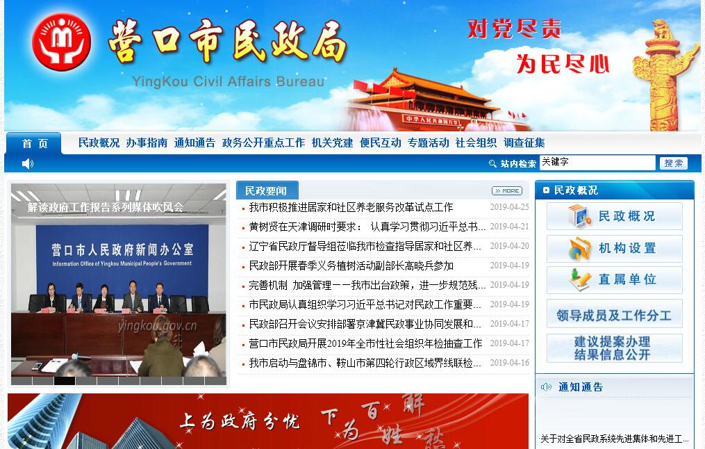 营口市民政局主要职责:(一)贯彻执行国家、省关于民政工作的法律法规,拟订全市民政事业发展规划和相关政策,起草有关地方规范性文件和市政府规章草案并组织实施和监督检查。(二)承担依法对全市性社会团体、基金会、社会服务机构进行管理和监督检查的责任,负责无业务主管单位的全市性社会组织的党建工作。(三)牵头拟订全市社会救助(不含医疗救助,下同)规划、政策,健全和完善城乡社会救助体系,负责城乡居民最低生活保障、临时救助工作,承担全市居民家庭经济状况核对机制建设工作。(四)拟订全市城乡基层群众自治建设和社区建设政策并指导实施,指导基层政权建设和社区服务体系建设,提出加强和改进基层政权和民主政治的建议,推动基层民主政治建设。(五)负责指导乡(镇)以上行政区域的设立、撤销、调整、更名和界线变更以及政府驻地迁移的审核报批工作,负责指导全市行政区域界线的勘定和管理工作,负责指导全市重要自然地理实体命名、更名的审核报批工作,规范全市地名标志的设置和管理,负责指导全市标准地名图书资料的审定工作。(六)拟订全市社会福利事业发展规划、政策和标准并组织实施,组织、指导福利机构管理和福利彩票发行工作,推进慈善事业发展,组织、指导社会捐助工作,负责老年人、特困人员、孤儿、农村留守儿童、困境儿童和残疾人等特殊群体生活及权益保障工作,负责收养登记工作。(七)负责推进婚俗和殡葬改革,拟订全市殡葬事业发展规划、政策和标准并监督实施,指导全市公墓建设和管理工作,负责生活无着流浪乞讨人员的救助工作,指导婚姻、殡葬、流浪乞讨人员救助服务机构管理工作,负责全市涉外婚姻登记。(八)会同有关方面拟订全市社会工作发展规划、政策和职业规范,推进全市社会工作、社会工作人才队伍建设和相关志愿者队伍建设工作。(九)完成市委、市政府交办的其他任务。(十)职能转变。市民政局应加强基层政权和社区建设,加强社会组织管理和监督检查,促进全市慈善组织和慈善事业发展,强化特困人员救助供养、农村留守儿童关爱保护困境儿童保障等工作,充分发挥民政部门在保障民生中的重要作用。(十一)与市卫生健康委员会的有关职责分工。市民政局负责统筹推进、督促指导、监督管理养老服务工作,拟订养老服务体系建设规划、法规、政策、标准并组织实施,承担老年人福利和特殊困难老年人救助工作。市卫生健康委员会负责拟订应对人口老龄化、医养结合政策措施,综合协调督促指导、组织推进老龄事业发展,承担老年疾病防治、老年人医疗照护、老年人心理健康与关怀服务等老年健康工作。