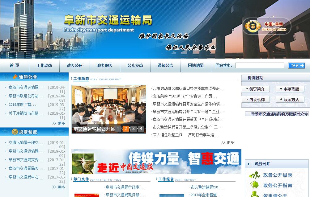 阜新市交通运输局主要职责:(一)贯彻执行国家、省有关交通运输行业的发展战略、方针政策和法律法规;拟订全市公路、水路、城市公共交通规范性文件并监督实施。(二)承担涉及全市综合运输体系的规划协调工作;会同有关部门组织编制综合运输体系规划;按规定组织协调国家和省、市重点物资运输和紧急客货运输。(三)承担全市公路建设市场的监管责任;会同有关部门组织编制公路、水路行业发展规划;负责全市公路及其附属设施建设和维护的管理和监督;负责各区(清河门除外)农村公路日常管理工作;组织实施全市重点交通工程建设工作;负责交通工程造价和工程质量与安全生产的监督管理工作。(四)承担全市道路运输和城市公共交通市场监管责任;组织制订道路运输和城市公共交通有关政策、准入制度、技术标准和运营规范并监督实施;负责全市道路运输和城市公共交通站(场)建设的布局规划并监督实施;负责全市道路客货运输、公共汽车、出租汽车、汽车租赁、运输站(场)经营、车辆维修、车辆技术综合性能检测、机动车驾驶员培训机构及驾驶员培训的行业管理,指导长途客车、公共汽车、出租汽车的运营管理。(五)贯彻执行国家、省水路运输的相关政策、准入制度、技术标准、运营规范;负责全市船舶运输、水运服务行业管理;承担全市水上交通安全监管责任。(六)负责全市交通建设资金的筹集、使用和监督管理。(七)指导全市公路、道路运输和城市公共交通行业安全生产和应急管理工作;指导全市交通运输行业体制改革,引导交通运输行业优化结构、协调发展。(八)指导交通运输信息化建设,监测分析运行情况,开展相关统计工作,发布有关信息;负责阜新市交通运输服务监督电话中心的日常管理。(九)指导全市公路和道路运输行业环境保护和节能减排工作。(十)负责本系统内安全生产、环境保护及道路交通安全等相关工作。(十一)承办市政府交办的其他事项。