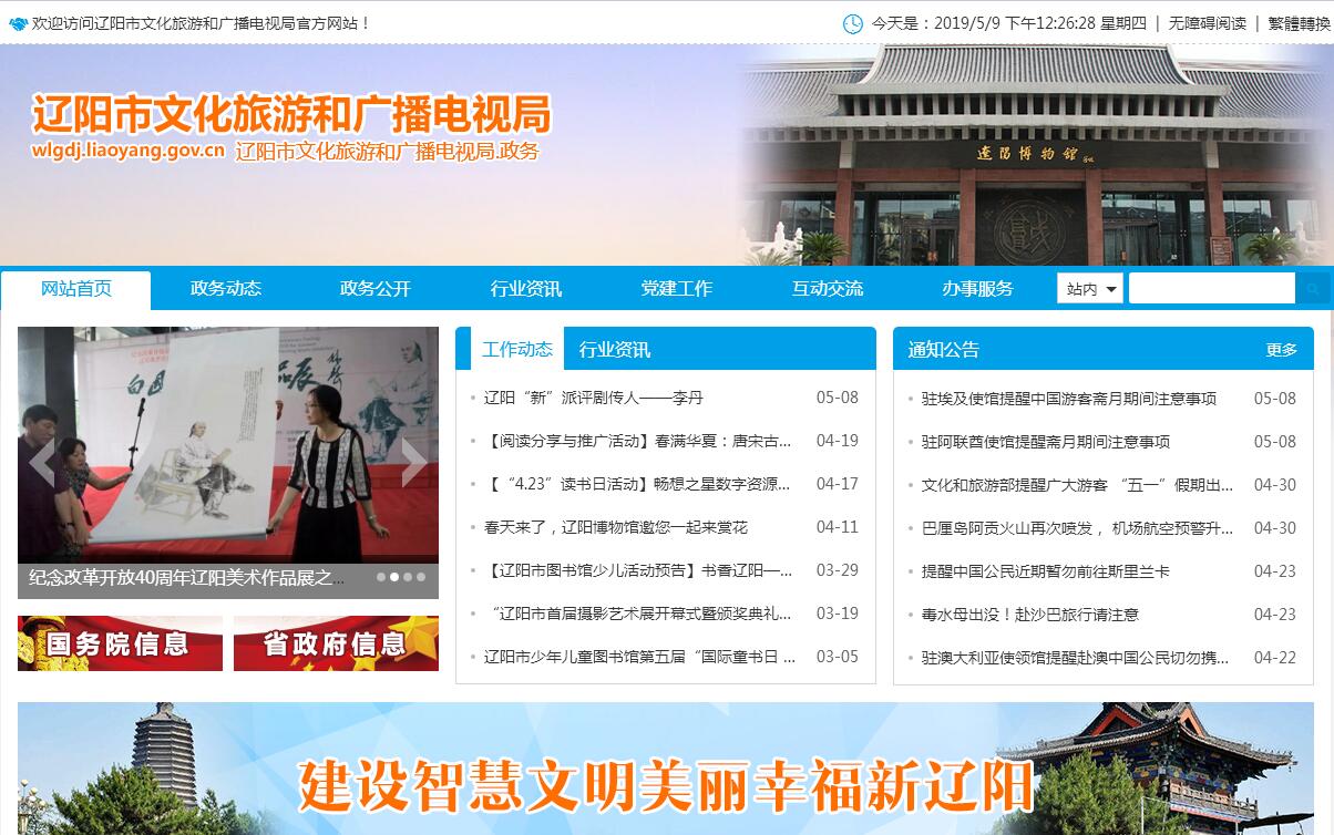| 网站简介: 辽阳市文化旅游和广播电视局网站由辽阳市政府建设,辽阳市文化旅游和广播电视局办公室负责管理,是我局在国际互联网上统一建立的网站。网站是辽阳市文化旅游和广播电视局面向社会的窗口,第一时间权威发布辽阳市文化旅游和广播电视局政务信息,同时也是与公众互动的渠道,对于促进政务公开、推进依法行政、接受公众监督、全面履行职能具有重要意义。网站秉承为社会和公众服务的理念,以服务公众为中心,以社会需求为导向,及时准确发布信息,不断推进政务公开。辽阳市文化旅游和广播电视局门户网站2019年2月19日改版运行。 |