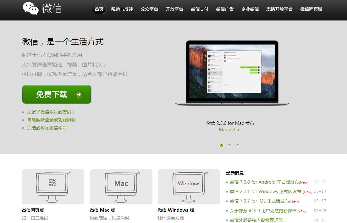 | 网站简介: 一款跨平台的通讯工具。支持单人、多人参与。通过手机网络发送语音、图片、视频和文字。微信(WeChat)是腾讯公司于2011年1月21日推出的一个为智能终端提供即时通讯服务的免费应用程序,由张小龙所带领的腾讯广州研发中心产品团队打造 。微信支持跨通信运营商、跨操作系统平台通过网络快速发送免费(需消耗少量网络流量)语音短信、视频、图片和文字,同时,也可以使用通过共享流媒体内容的资料和基于位置的社交插件“摇一摇”、“漂流瓶”、“朋友圈”、”公众平台“、”语音记事本“等服务插件。截止到2016年第二季度,微信已经覆盖中国 94% 以上的智能手机,月活跃用户达到 8.06亿,用户覆盖 200 多个国家、超过 20 种语言。此外,各品牌的微信公众账号总数已经超过 800 万个,移动应用对接数量超过 85000 个,广告收入增至36.79亿人民币,微信支付用户则达到了 4 亿左右。微信提供公众平台、朋友圈、消息推送等功能,用户可以通过“摇一摇”、“搜索号码”、“附近的人”、扫二维码方式添加好友和关注公众平台,同时微信将内容分享给好友以及将用户看到的精彩内容分享到微信朋友圈。 |