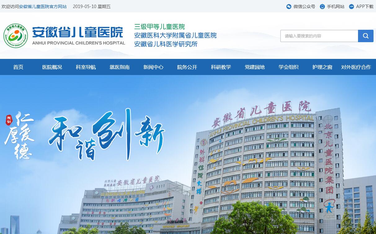 安徽省儿童医院筹建于1982年,1990年开诊,历任领导班子率领全院职工本着“仁爱、厚德、和谐、创新”的治院精神,励精图治,大胆创新,现已成为全省唯一一所设备先进、学科门类齐全,集医疗、教学、科研、预防、保健、康复为一体的省级大型综合性三级甲等儿童专科医院。医院现为安徽省儿童医疗协会会长单位、安徽省儿科专业质控中心主任单位、安徽省新生儿急救中心和随访干预中心、安徽省儿童急救中心、北京儿童医院集团首家成员单位;是安徽省儿科医学研究所所在单位、安徽医科大学附属省儿童医院、国家级儿科住院医师规范化培训基地、国家级新生儿围产期医学专业专科医师培训基地;还是全省儿科重症监护专科护士培训基地、全省妇幼医护培训基地、新生儿内科培训基地、省手术室专科护士临床实践基地、省骨科专科护士临床实践基地、省肿瘤专科护士临床实践基地等。医院占地面积5万平方米,拥有医疗用房面积7.2万平方米,开放床位1237张,设33个临床科室、6个医技科室、6个临床专科。2018年门诊量106.7万人次,年出院病人6.9万人次,年住院手术近1.9万台次。全院现有职工1846人,中级以上职称572人,其中高级职称139人。医院拥有全国一流带环境体验的1.5T核磁共振、64排螺旋CT等现代化的医疗、科研设备。医院学科门类齐全,儿内科系统设有新生儿内科、呼吸内科、消化内科、肾内科、血液内科、神经内科、风湿免疫科、感染科、心血管内科等,急救中心设有急诊内科、急诊外科、院前急救转运、急诊综合病房、PICU等,儿外科系统设有普外科、心脏外科、胸外科、神经外科、新生儿外科、泌尿外科、骨科、烧伤整形科、大五官科等。“十二五”期间,新生儿科为省优先发展临床重点专科、小儿心胸外科为省临床重点专科,小儿骨科、康复医学科(儿童)为省临床重点培育专科;“十三五”期间,小儿骨科为省临床重点专科,PICU和神经内科为省重点培育专科。近年来,医院大力实施科教兴院战略,鼓励开展新项目,支持临床科研,在危重新生儿的抢救、小儿先天性食道闭锁等先天性畸形、小儿脑瘫、癫痫、哮喘、肾病、先天性骨关节畸形、小儿先心病以及儿童白血病、恶性肿瘤诊治方面有丰富经验。在医院自身快速发展的同时,为迅速改变我省目前儿童医疗资源严重不足、儿科医师紧缺的现状,充分发挥省儿童医院在全省儿科的龙头带动作用,由我院牵头在全国率先成立了首家儿童医疗协会,成立安徽省儿童急救中心,开通安徽省儿童“120”,牵头成立安徽省首个医联体---安徽省儿童医疗联合体,建设安徽省儿童医学远程会诊中心,以省儿童医院为龙头、地市县医院儿科为枢纽、乡镇村为网底五级联动的儿童医疗急诊急救的医疗服务体系,让全省患儿在“家门口”就能享受到省城大专家乃至北京儿童医院等全国顶尖儿童医院专家的优质诊疗服务,牵头成立安徽省儿科专业质量控制中心。每年为全省培训基层儿科医生和妇幼保健系统的儿童保健人员2000多人次,迅速提升了基层的儿科诊疗水平,为降低我省婴幼儿死亡率作出了重大贡献。医院先后获得“全国卫生系统先进集体”“全国巾帼文明示范岗”“省直文明单位”“全国院务公开先进单位”“安徽省诚信医院”“合肥市消防安全能力建设4A级单位”“全国创先争优先进集体”“全国卫生计生系统先进集体”等各种荣誉称号。在“安徽省十大服务行业居民满意度调查”中,2014-2018年连续五年获得“金口碑奖”。新时代,新机遇,我院将以服务全省儿童健康事业为己任,加快科技兴院的步伐,努力提高医院的整体实力,把医院建设成为学科门类齐全、诊疗手段先进的国内一流的儿童医院。