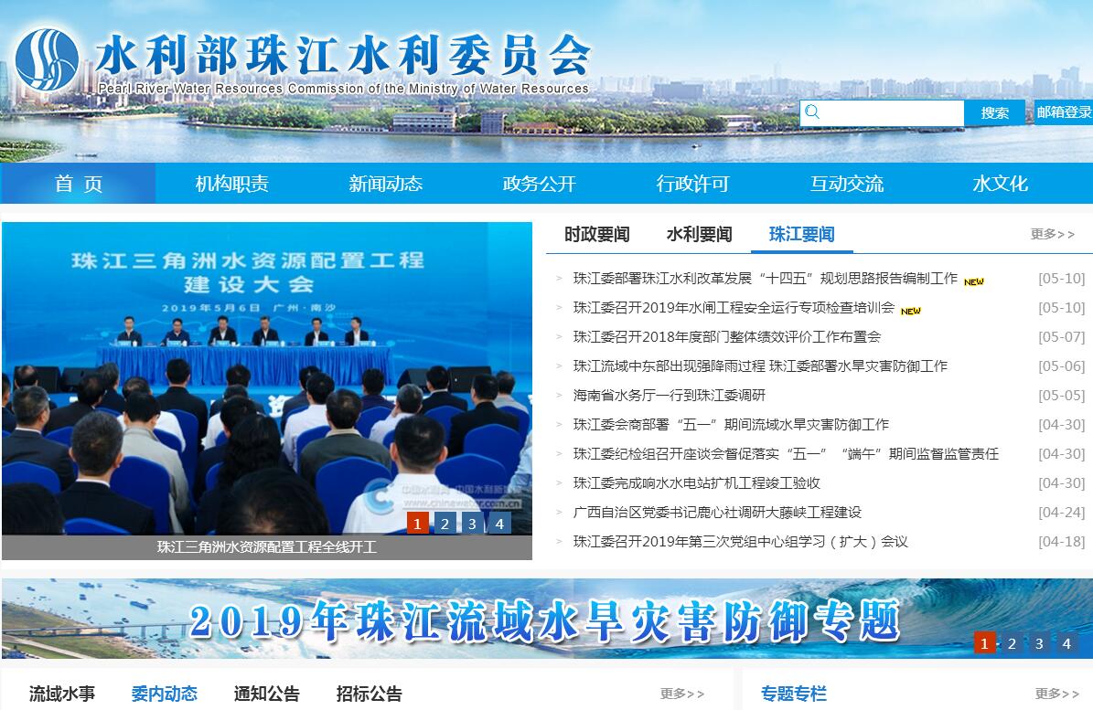 水利部珠江水利委员会(简称珠江委)成立于1979年,是水利部派出的流域管理机构,在珠江流域、韩江流域、澜沧江以东国际河流(不含澜沧江)、粤桂沿海诸河和海南省区域内依法行使水行政管理职责,为具有行政职能的事业单位。其主要职责是:(一)负责保障流域水资源的合理开发利用。受部委托组织编制流域或流域内跨省(自治区、直辖市)的江河湖泊的综合规划及有关的专业或专项规划并监督实施;拟订流域性的水利政策法规。组织开展流域控制性水利项目、跨省(自治区、直辖市)重要水利项目与中央水利项目的前期工作。根据授权,负责流域内有关规划和中央水利项目的审查、审批以及有关水工程项目的合规性审查。对地方大中型水利项目进行技术审核。负责提出流域内中央水利项目、水利前期工作、直属基础设施项目的年度投资计划并组织实施。组织、指导流域内有关水利规划和建设项目的后评估工作。(二)负责流域水资源的管理和监督,统筹协调流域生活、生产和生态用水。受部委托组织开展流域水资源调查评价工作,按规定开展流域水能资源调查评价工作。按照规定和授权,组织拟订流域内省际水量分配方案和流域年度水资源调度计划以及旱情紧急情况下的水量调度预案并组织实施,组织开展流域取水许可总量控制工作,组织实施流域取水许可和水资源论证等制度,按规定组织开展流域和流域重要水工程的水资源调度。(三)负责流域水资源保护工作。组织编制流域水资源保护规划,组织拟订跨省(自治区、直辖市)江河湖泊的水功能区划并监督实施,核定水域纳污能力,提出限制排污总量意见,负责授权范围内入河排污口设置的审查许可;负责省界水体、重要水功能区和重要入河排污口的水质状况监测;指导协调流域饮用水水源保护、地下水开发利用和保护工作。指导流域内地方节约用水和节水型社会建设有关工作。(四)负责防治流域内的水旱灾害,承担流域防汛抗旱总指挥部的具体工作。组织、协调、监督、指导流域防汛抗旱工作,指导、协调并监督防御台风工作。按照规定和授权对重要的水工程实施防汛抗旱调度和应急水量调度。组织实施流域防洪论证制度。组织制定流域防御洪水方案并监督实施。指导、监督流域内蓄滞洪区的管理和运用补偿工作。按规定组织、协调水利突发公共事件的应急管理工作。(五)指导流域内水文工作。按照规定和授权,负责流域水文水资源监测和水文站网的建设和管理工作。负责流域重要水域、直管江河湖库及跨流域调水的水量水质监测工作,组织协调流域地下水监测工作。发布流域水文水资源信息、情报预报和流域水资源公报。(六)指导流域内河流、湖泊及河口、海岸滩涂的治理和开发;按照规定权限,负责流域内水利设施、水域及其岸线的管理与保护以及重要水利工程的建设与运行管理。指导流域内所属水利工程移民管理有关工作。负责授权范围内河道范围内建设项目的审查许可及监督管理。负责直管河段及授权河段河道采砂管理,指导、监督流域内河道采砂管理有关工作。指导流域内水利建设市场监督管理工作。(七)指导、协调流域内水土流失防治工作。组织有关重点防治区水土流失预防、监督与管理。按规定负责有关水土保持中央投资建设项目的实施,指导并监督流域内国家重点水土保持建设项目的实施。受部委托组织编制流域水土保持规划并监督实施,承担国家立项审批的大中型生产建设项目水土保持方案实施的监督检查。组织开展流域水土流失监测、预报和公告。(八)负责职权范围内水政监察和水行政执法工作,查处水事违法行为;负责省际水事纠纷的调处工作。指导流域内水利安全生产工作,负责流域管理机构内安全生产工作及其直接管理的水利工程质量和安全监督;根据授权,组织、指导流域内水库、水电站大坝等水工程的安全监管。开展流域内中央投资的水利工程建设项目稽察。(九)按规定指导流域内农村水利及农村水能资源开发有关工作,指导水电农村电气化和小水电代燃料工作;承办国际河流有关涉外事务,负责开展水利科技、外事和质量技术监督工作;承担有关水利统计工作。(十)按照规定或授权负责流域控制性水利工程、跨省(自治区、直辖市)水利工程等中央水利工程的国有资产的运营或监督管理;研究提出直管工程和流域内跨省(自治区、直辖市)水利工程供水价格及直管工程上网电价核定与调整的建议。(十一)承办水利部交办的其他事项。