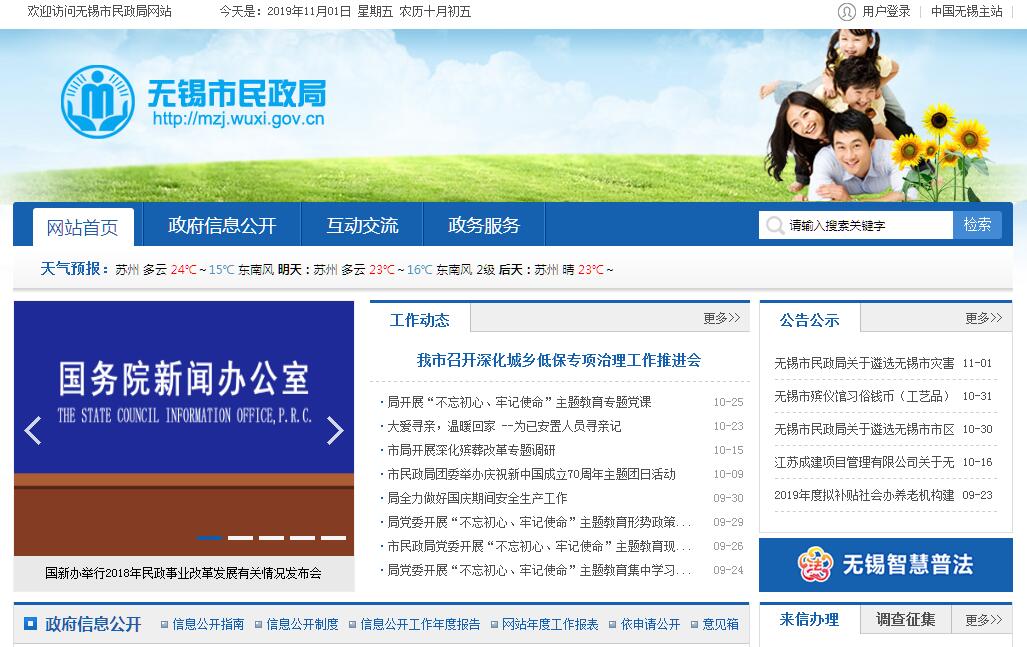 无锡市民政局,是无锡市政府主管社会行政事务的职能部门之一,担负着社会救助、社会福利、社区建设、民间组织管理、双拥优抚安置、婚姻收养、殡葬管理、基层政权建设、区划地名管理、老龄工作等多项工作任务和服务管理职能。其主要职责是:(一)贯彻民政事业发展法律、法规和政策、规划,负责拟订地方性法规、政府规章草案和全市民政事业发展规划、相关政策并组织实施。(二)负责全市社会团体、基金会、社会服务机构等社会组织登记管理工作,依法对社会组织进行登记管理和执法监督;协助做好社会组织党建工作。(三)拟订全市社会救助政策、标准,统筹社会救助体系建设,负责城乡居民最低生活保障、特困人员救助供养、临时救助、生活无着流浪乞讨人员救助工作,组织实施社会救助家庭经济状况核对工作。(四)拟订全市城乡基层群众自治和社区治理办法,指导城乡社区治理体系和治理能力建设,提出加强和改进城乡基层政权建设的建议,推动基层民主政治建设。(五)拟订全市行政区划、行政区域界线、地名管理的地方性法规、政府规章草案,以及相关政策和标准;承担行政区划、行政区域界线和地名的相关管理服务工作。(六)负责全市婚姻管理相关工作,推进婚俗改革 。(七)负责全市殡葬管理相关工作,推进殡葬改革。(八)拟订全市残疾人权益保护政策,统筹推进残疾人福利制度建设和康复辅助器具产业发展;统筹推进精神障碍社区康复服务工作;承担困难残疾人生活补贴和重度残疾人护理补贴的监督管理工作。(九)统筹推进、督促指导、监督管理全市养老服务工作,拟订养老服务的地方性法规、政府规章草案和养老服务体系建设规划、政策、标准并组织实施,承担老年人福利和特殊困难老年人救助工作,推动居家养老和社区养老服务发展。(十)拟订全市儿童福利、孤弃儿童保障、儿童收养、儿童救助保护政策、标准并组织实施,健全农村留守儿童关爱服务体系和困境儿童保障制度。(十一)拟订全市促进慈善事业发展政策和慈善信托、慈善组织及其活动管理办法,组织指导社会捐助工作。(十二)拟订全市社会工作、志愿服务政策和标准,组织推进社会工作人才队伍建设,承担志愿服务行政管理工作。(十三)负责民政事业费的使用、管理和监督工作。(十四)按照职责分工做好相关行业、领域的安全生产监督管理工作。(十五)完成市委、市政府交办的其他任务。