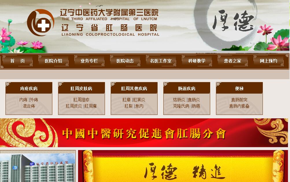 | 网站简介: 辽宁中医药大学附属第三医院(辽宁省肛肠医院)是一所集医疗、科研、教学、康复为一体的国家三级甲等中医专科医院,首批国家临床重点专科建设单位,国家区域中医(肛肠科)诊疗中心,国家中医药管理局中医肛肠专业重点学科和重点专科建设单位,中华中医药学会肛肠分会会长单位,中国中医药研究促进会肛肠分会会长单位,首批国家中医药管理局临床诊疗中心,国家中医药管理局中医外科肛肠病学优势学科继续教育基地,中华中医药学会全国肛肠专业继续教育基地,国家食品药品监督管理局药物临床试验机构(GCP),辽宁省中医药学会肛肠分会会长单位,辽宁省委干诊定点医院,省、市、铁路医保、商业保险定点医院,省、市新型农村合作医疗省级定点医院。 |
