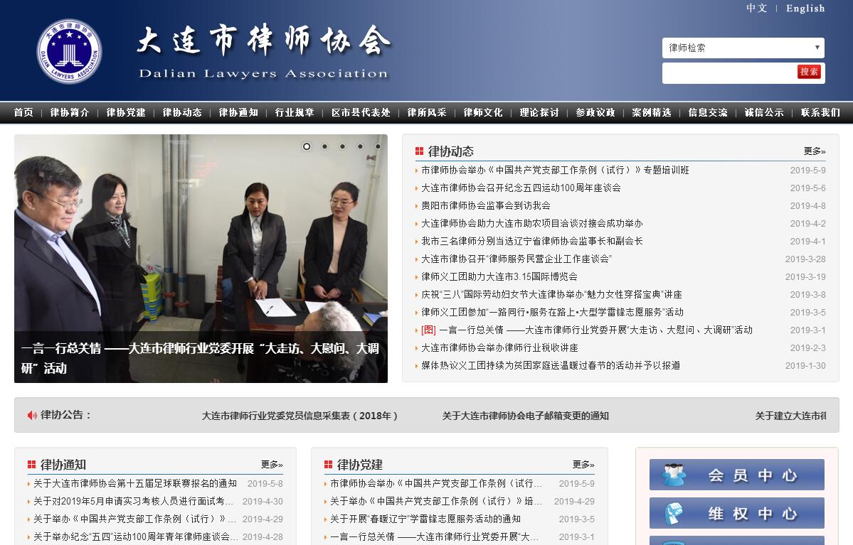 大连市律师协会是依法成立的社会团体法人,是大连市律师的自律性行业组织,依据《律师法》、《律师协会章程》,对大连市执业律师实行行业管理,受大连市司法局的监督和指导。协会现有团体会员286家,律师会员3600余人。近年来,协会先后荣获“全国先进社会组织”、“辽宁省示范社团”、“大连市5A级社会团体”等荣誉称号。协会党委先后荣获“辽宁省基层党建工作先进单位”、“民政部社会组织深入学习实践科学发展观活动先进单位”等荣誉称号。大连市律师协会的主要职责是:1、制定并监督实施行业发展规划、会员执业规范和行业管理规则和制度;2、保障会员依法执业,维护会员的合法权益;3、负责会员职业道德和执业纪律的教育、检查和监督,对会员的执业活动进行考核;4、制定律师继续教育大纲,负责对会员的政治和业务培训;5、组织管理申请律师执业人员的实习活动,制定和落实培训计划,对实习人员进行考核;6、开展业务研讨,总结交流律师工作经验;7、负责对会员登记和日常管理;8、调查处理对会员的投诉;9、调处会员之间在执业活动中的纠纷;10、制定并实施会员奖惩办法;11、宣传律师工作,出版律师刊物;12、组织会员开展对外交流;13、为会员提供福利和其他保障;14、指导律师事务所规范化管理工作;15、组织会员参与立法活动,向有关部门提出法制建设及律师制度建设的建议;16、鼓励和支持会员参政议政;17、协调与相关司法、行政机关的关系,为律师依法执业创造良好环境;18、完成司法行政机关及上级律师协会委托的其他职责;19、法律、法规、规章和章程规定的其他职责。