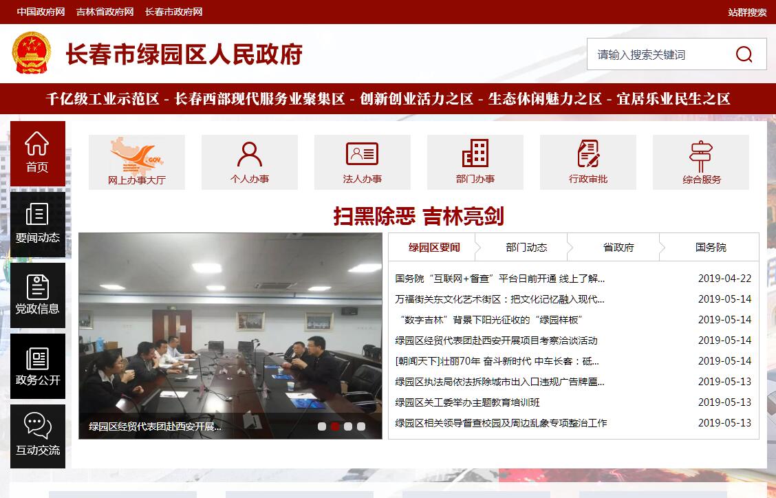 | 网站简介: 绿园区隶属吉林省长春市,成立于1995年,前身为长春市郊区,位于吉林省长春市西部,东连朝阳区、宽城区,南接长春汽车产业开发区,西邻公主岭市,北依农安县。是长春市重要的行走机械制造配套、农副产品加工和城市蔬菜副食品供应基地。截至2018年,绿园区幅员216平方公里,人口约62万人,辖三镇、五街、四个开发区,其中3个省级工业开发区、1个市级开发区,24个行政村、57个城市社区;2016年,绿园区地区生产总值完成247亿元。绿园区地理位置优越。京哈、长白、长郑、长农省际公路和绕城高速、四环路贯穿全境,哈大高速铁路客运专线、吉长城际铁路位于区内。首批全国农村社区建设示范单位。 |