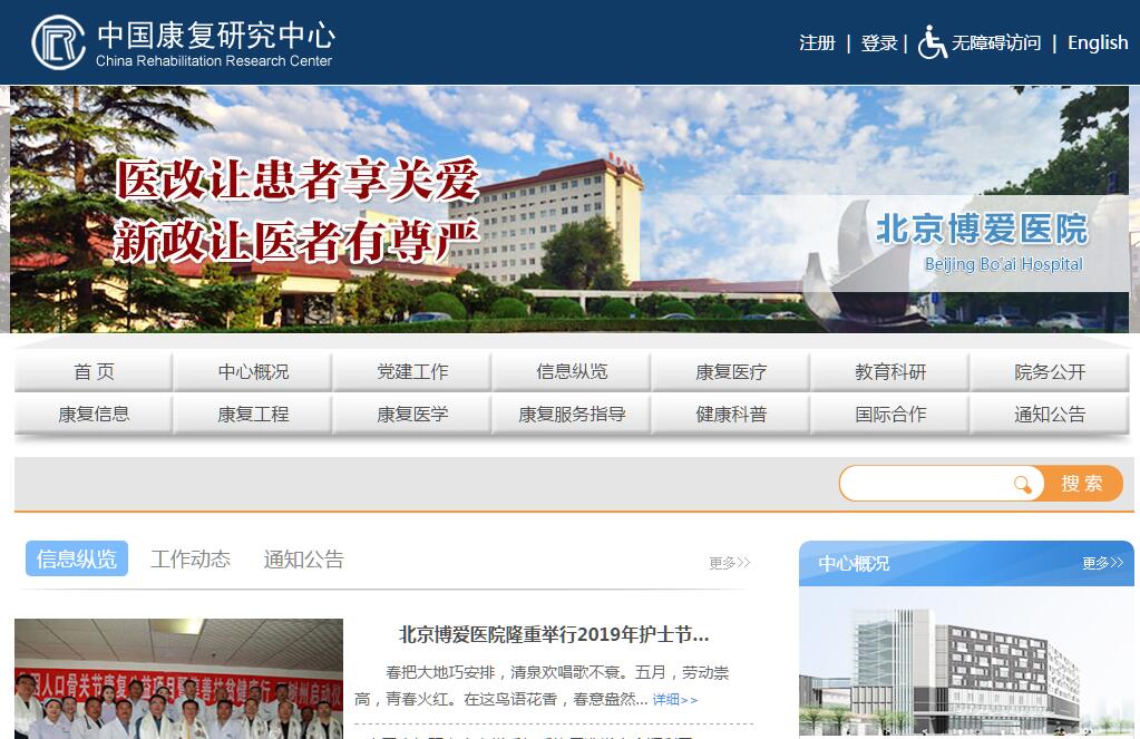 中国康复研究中心成立于1988年 10月,作为直属于中国残联的全民所有制事业单位,主要承担我国康复医疗、康复研究、人才培养、社区指导、国际交流等多领域康复工作。经过30年的探索与发展,中国康复研究中心已经成为拥有职工1700余人,占地220余亩,建筑面积12万平方米,集康复医疗、教育、科研、工程、信息、社会服务于一体的大型现代化综合性康复机构,并设有中国残联残疾预防与控制研究中心、国家孤独症康复研究中心、国家药物临床试验机构、神经损伤与康复北京市重点实验室等。中国康复研究中心具有规模最大、康复手段齐全、康复流程完善、康复模式先进、康复专家众多、康复技术创新能力突出等优势,形成了覆盖残疾预防、急性期救治、早期干预、中后期康复、职业康复和社区家庭更生等内容的中国特色全面康复服务模式。中国康复研究中心是我国现代康复医学发展史上的一座里程碑,也是我国康复事业的一颗明珠。中国康复研究中心北京博爱医院作为目前我国一家以康复为特色的三级甲等综合医院,是医疗保险和工伤保险定点医院,设有门急诊、康复临床、综合临床、康复治疗、医技等52个科室,开放床位1100张;拥有神经康复、脊髓损伤康复、儿童康复、骨与骨关节康复、神经泌尿康复和传统医学康复等多个优势专业学科。综合康复治疗手段包括运动疗法、作业疗法、语言治疗、文体治疗、水疗、物理因子治疗、心理治疗、音乐治疗、社会康复、假肢矫形、中医治疗、教育康复和职业训练等。形成了以功能评估—康复治疗—效果评价为基础的康复流程,探索出了一套急性期救治与恢复期康复相结合、中西医结合、医工结合的康复模式。多年来,中国康复研究中心北京博爱医院收治的患者来自全国各地和20多个国家或地区,康复效果得到国内外专家和患者的一致好评。2013年,中国康复研究中心北京博爱医院成为首届北京市康复质控中心主任委员单位,为进一步规范全市康复医疗质量管理、推动康复学科建设发展发挥了积极作用。中国康复研究中心北京博爱医院还承担着周边近百万居民的基本医疗服务、大型体育赛事医疗保障、精准扶贫、对口支援等多项社会责任,尤其在汶川、玉树、鲁甸、雅安等历次抗震救灾中,医务人员主动深入灾区,做出了突出贡献。1991年4月,中国康复研究中心与首都医科大学联合设立了临床医学七系,开展康复医学学历教育。2000年正式建立康复医学院,培养的学生学历涵盖本科、硕士研究生、博士研究生,并设立了博士后流动站。康复医学院在全国率先开设了康复治疗学专业的本科学历教育,现已成为中国第一家拥有PT、OT、假肢矫形三项国际教育认证的康复教育机构,康复治疗课程与国际全面接轨。中心编写了我国首套康复治疗专业本科教材,向中国康复治疗师的专门化培养迈出了划时代的一步。每年,各地前来进修学习的医务人员有几百名,参加各种培训班、国家级继续医学教育项目和国际项目的学员更是络绎不绝。2014年,中国康复研究中心成为第一批国家住院医师规范化培训基地,也是北京市住院医师规培康复医学专业培训基地和唯一的考核基地。2018年,中国残疾人康复人才教育基地建成启用,将成为我国一家现代化、规范化、应用型康复人才教育示范基地和国际康复学术交流的重要平台,这将为中国康复大学的建设提供重要支撑。中国康复研究中心坚持基础研究与康复临床紧密结合的方针,创新与转化并重,始终把科研作为发展的助力点。1995年,在中心原康复医学研究所、康复工程研究所、康复信息研究所和社会服务指导中心的基础上,整合成立了中国康复科学所。康复医学研究所坚持以基础研究和临床需求为导向,积极开发康复新技术、新材料,并促进其向临床应用转化,高分子材料等多项成果已成功转化。康复工程研究所坚持医工结合的科研模式,与临床应用精准对接,开发出了很多新型的假肢矫形器和辅助用品用具。康复信息研究所作为世界卫生组织国际分类家族中国合作中心,引进和修改了WHO残疾分类标准,积极推动ICF在国内的推广和应用。编辑、出版国家级核心期刊《中国康复理论与实践》,影响指数在同类期刊中排名第9位。社会服务指导中心充分利用技术和信息资源优势,积极开展康复新理念、新知识、新技术的普及宣传和教育。承担国家康复服务项目的组织、实施和督导,规范省、市康复机构建设,推动全国社区康复服务网络的发展,为全国康复服务体系的建设、加快残疾人小康进程做出了积极的贡献。中国康复研究中心作为国际康复领域交流与合作的重要平台,与日本、美国、德国、挪威等10多个国家和地区建立了合作关系,开展技术援助、人员互访、人才培养、学术交流和科研合作。接待过20多个国家和地区1800个团组1.7万人次和多国领导人的友好访问,在国际上产生了越来越大的影响。积极搭建国际学术交流平台,圆满举办了第42届国际脊髓学术年会、北京国际康复论坛、“一带一路”残疾人事务主题活动之高端康复国际论坛等各类国际会议40余个,其中北京国际康复论坛已经举办12届,已经成为国际康复领域的一张名片。新时代迈上新征程,新征程呼唤新作为。中国康复研究中心党委将继续带领全体党员干部职工,以习近平新时代中国特色社会主义思想为指引,