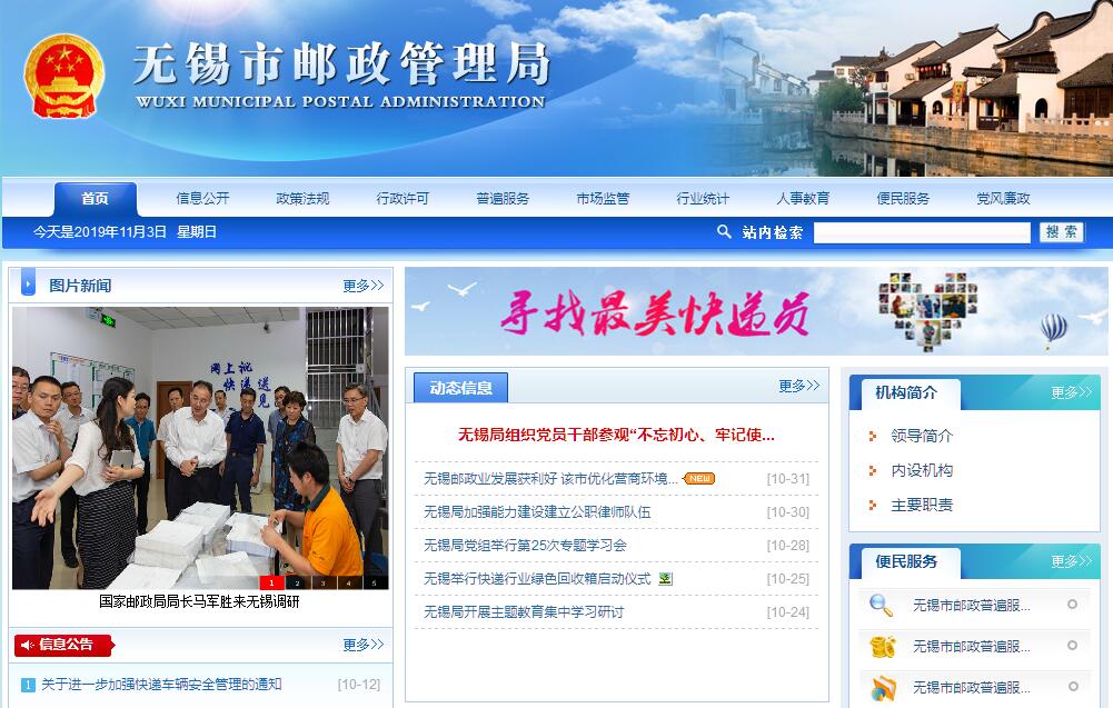 | 网站简介: 无锡市邮政管理局主要职责:一、贯彻执行国家邮政法律法规、方针政策和邮政服务标准;二、研究拟订本地区邮政发展规划;三、监督管理本地区邮政市场以及邮政普遍服务和机要通信等特殊服务的实施;四、负责行业安全生产监管、统计等工作;五、保障邮政通信与信息安全;六、承办省邮政管理局及市人民政府交办的其他事项。 |