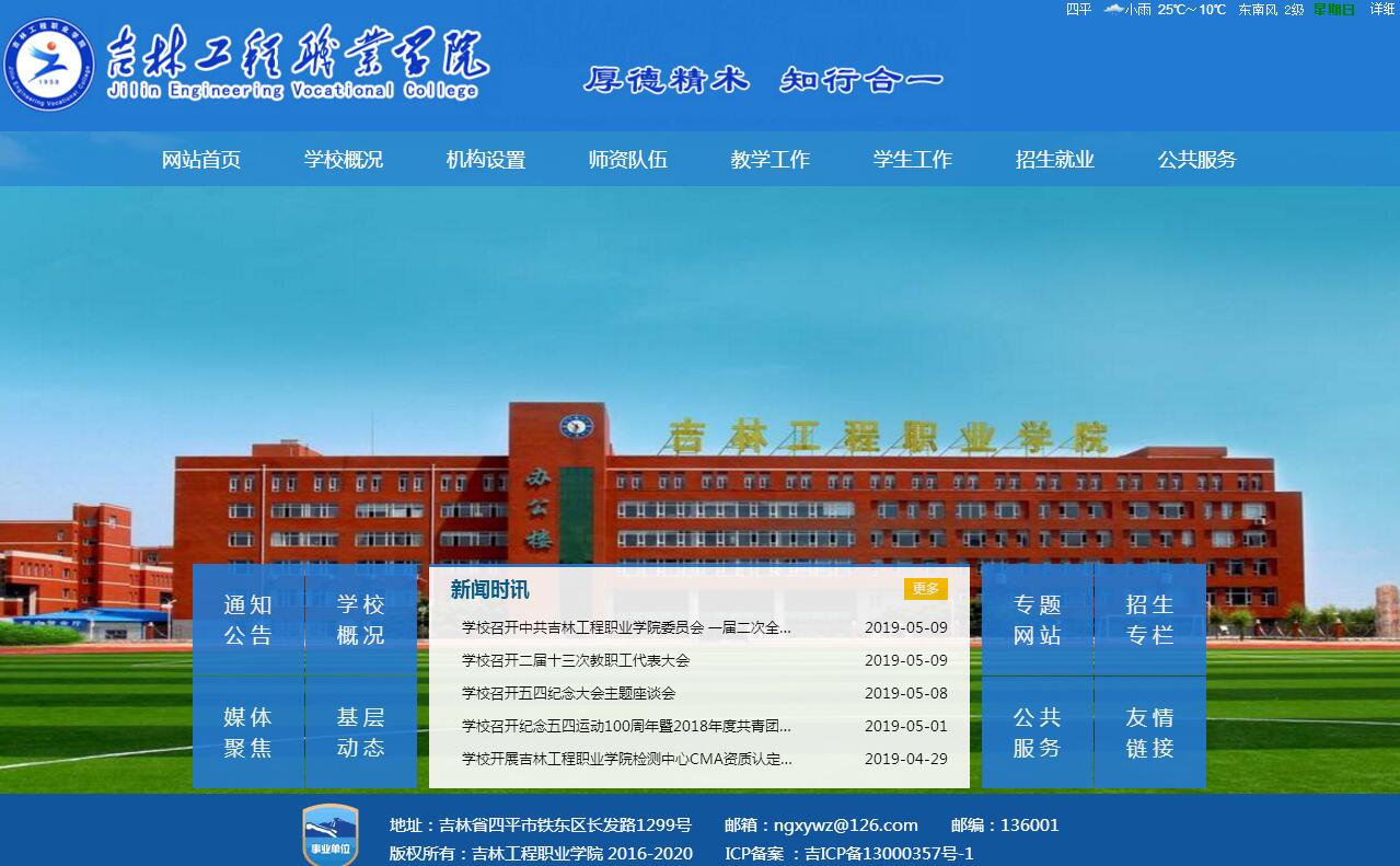 吉林工程职业学院是经吉林省政府批准成立,隶属于吉林省教育厅的省属公办普通高等职业学院。学校始建于1958年,是新中国成立后较早建立的普通高等院校之一。学校在建校之初和1978年恢复高考时期,两次举办全日制本科教育。经过60年的发展,特别是近年来的建设,学校办学规模不断扩大,办学水平不断提升,办学能力不断增强,现已发展成为一所以工科技术技能型教育为主,兼有继续教育,学历教育、短期培训、职业技能鉴定为一体,涵盖工、农、经、管、医五大学科门类的装备制造、汽车工程、粮食食品、信息通讯、建筑测绘、服务管理、生物制药和健康护理八大专业集群的多学科专业的特色鲜明的综合性高等职业院校。学校经过60年的历史积淀和文化传承,传承了 “厚德精术、知行合一”的校训;凝练了“求实、踏实、朴实,自我革新、主动更新、勇于创新”的“三实三新” 和“一把锹”精神;形成了“团结、求实、勤奋、创新”的校风、“厚德、博学、严谨、奉献”的教风和“笃学、善思、修身、强技”的学风。学校坚持 “德育为先,技业并进”的办学理念,以培养“有理想、爱国家,讲文明、守纪律,能吃苦、稳基层,实践动手能力强”的基础理论扎实、实践动手能力强、综合素质高的技术技能型人才为目标,向社会输送各类毕业生7万余人,为国家建设做出了一定的贡献。学校占地面积35.3万平方米,建筑面积12.8万平方米,固定资产总值4.8亿元,教学仪器设备总值1.6亿元,在编教职工410人,全日制在校学生6000余人。学校师资力量雄厚,现有专任教师326人,其中,教授、副教授145人,现有具有博士、硕士学历教师161人,“双师型”教师172人,入选国家“万人计划”1人,吉林省长白山技能名师4人,省级及以上教学名师6人。一支教学有名师、实践有技师、管理有专家的人才队伍正在形成。学院根据市场需求,科学设置学科和专业,设有粮食与食品工程学院、生物工程学院、机电工程学院、汽车工程学院、建筑工程学院、信息工程学院、管理学院、医护学院等12个教学院(部),开设食品营养与检测、生物制药技术、机电一体化技术、汽车检测与维修技术、道路桥梁工程技术、移动通信技术、电子商务、高铁客运乘务、护理等42个专业。学校教学手段先进,教学设施完善,实验仪器齐备,现有多媒体教室147个,专业实验室73个,计算机机房22个,计算机1050台,校内实习实训基地3个,并配有各种数控机床、拆装汽车等实习实训设备65台。其中,农产品加工与检测实训中心为吉林省示范性实习实训基地。校外实习实训、实践教学基地200多处,图书馆藏书33万册。学校建有全国计算机等级、全国大学生英语四、六级等10个考试点,国家职业技能鉴定中心(站)6个,可为生化药品提取工、汽车维修工、数控机床操作工、食品质量检验工、车工、电焊工等30个工种做职业技能鉴定,学生不出校门就可取得所学专业的职业上岗证,为学生就业提供了有利条件。学校现有省级教育改革试点专业1门,省级精品课程4门,省级优秀课程16门,近几年来共承担地厅级以上科研项目200余项,申请发明专利9项,发表学术论文1200余篇,编写教材、论著近300余部。迈入新时代以来,新一届学校党委班子以习近平新时代中国特色社会主义思想指为指导,在省委、省政府和省高校工委、教育厅的正确领导下,全面加强党的建设,切实发挥党委管党治党、办学治校主体作用,牢牢把握社会主义办学方向,带领全校师生员工按照学校第一次党员大会确定的“十三五”发展规划的“新思路、新战略,新定位、新目标,新任务、新举措”,围绕“特色鲜明的高水平高等职业技能型大学”建设总目标和“有理想、爱国家,讲文明、守纪律,能吃苦、稳基层,实践动手能力强”人才培养总体目标,以“一张蓝图干到底”的决心和意志,大力实施学校“三步走”战略、“六化”发展思路、“十大”计划;全面落实立德树人根本任务,按照 “12345”思政工作新思路,实施“六位一体”思政教育新模式,以“弦歌六十载·奋进新时代”建校60周年为契机,全力推进“校园文化建设计划”,加快完成“两年改观、三年见效、五年形成特色”的“七大平台”建设目标任务,着力打造特色鲜明的“吉林工程”文化,塑造“吉林工程人”形象,展现“吉林工程人”心系学校、艰苦奋斗的光荣传统,形成校园文化特色品牌,发挥文化育人作用。学校坚持“产教融合、校企合作”的特色办学和优质就业思路,校企合作注重发挥学校和企业的“双主体”作用;产教融合着重强调专业设置紧贴产业发展需求,课程教学内容安排紧贴职业标准;“做中学、学中做”的教学模式紧贴岗位能力形成过程要求,教学环境营造紧贴生产现场实际场景。通过建立招生、培养、就业联动机制,实施“一院、二群、三品”专业特色办学举措。(注:“一院两群”是指学校设置的每个二级学院都要打造“一个专业群,一个企业群”,每个专业群依托并服务一个企业群,企业群支持专业群,实行校企紧密合作、产教深度融合的特色专业办学模式,专业群按照大类培养,学生入校一年后可以根据自己兴趣爱好、就业需要选择专业,每一个专业群背后至少有3至5个企业集群支撑,合作办学;“三品”是指每个专业群至少有一个省级以上的优势品牌专业,每个企业群至少有一个规模以上的国内500强的品