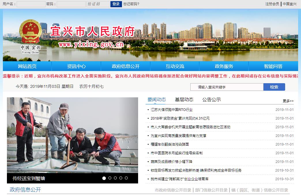 中国宜兴是宜兴市国家机关在互联网上统一建立的网站群,包括宜兴市政务门户网站、各区政务门户网站和各级国家机关网站。中国宜兴门户网站由宜兴市人民政府主办,中国宜兴运行管理中心负责运行维护,是宜兴市政府和各部门在互联网上发布政府信息和提供在线服务的综合平台,权威发布市政府重大决策部署和重要政策文件以及各类便民提示,搭建政府与公众互动的交流渠道,展示宜兴风土人情和时代风貌。宜兴市,简称宜,古称“荆邑”、“阳羡”,位于江苏南部,太湖西岸。宜兴是中国著名陶都,素有“陶的古都,洞的世界,茶的绿洲,竹的海洋”之称。宜兴是“紫砂壶”原产地,拥有石灰岩溶洞80多个,茶园3500余公顷,竹海纵横八百里。宋代大诗人苏东坡在宜兴留下“买田阳羡吾将老,从初只为溪山好”的诗句。宜兴人文荟萃,诞生了4位状元、10位宰相、26位两院院士,被誉为院士教授之乡。宜兴属吴越文化,是江浙民系使用吴语。宜兴是中国综合实力最强的县级市之一,连续多年被评为福布斯中国大陆最佳县级市。在经济、文化、商贸、会展、服务业和城市建设等领域成就显著,一直处于中国县级市的前列。获评2011年中国最具幸福感城市等众多荣誉。2015年位居中国百强县市第六名。2016年11月,宜兴市被国家旅游局评为第二批国家全域旅游示范区。宜兴有善卷洞、张公洞、宜兴竹海、龙背山森林公园、宜园、陶祖圣境、云湖、中国宜兴陶瓷博物馆等旅游景区。宜兴市位列2017年全国中小城市综合实力百强县市(全国综合实力百强县市)。2017年11月,宜兴市荣获2017年度中国全域旅游创新奖,全国文明城市。2017年12月,当选中国工业百强县。