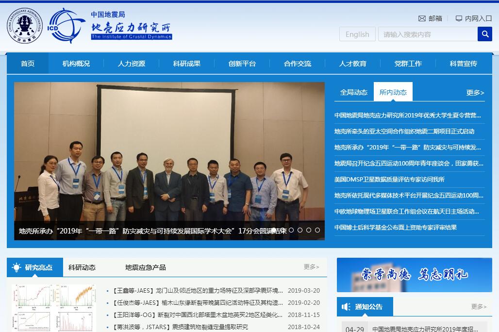 中国地震局地壳应力研究所的前身为地质部地震地质大队。1966年河北邢台地震后,在周恩来总理关怀下,国家计委、国家科委和地质部对地震地质工作统筹安排,在李四光部长的亲自组织和推动下,1966年4月25日地质部下发(66)地办字第50号文宣布地质部地震地质大队成立。地震地质大队为地质部的直属单位,下设华北、西南、西北、中南四个区队。1966~1970年李四光曾10余次接见大队有关领导及业务人员,1970年7月23日李四光还亲赴地震地质大队(河北省三河县)驻地指导工作并参观实验室。1970年3月25日地质部将地震地质大队交由中国科学院领导。同年5月,将地震地质大队下属的华北、中南、西南、西北区队移交各省(市)地震工作部门领导。1972年地震地质大队迁至北京市海淀区西三旗。1972年8月中国科学院办公会议决定,地震地质大队由国家地震局直接领导。1986年2月6日国家地震局下发(86)震发计字第053号文,将国家地震局地震地质大队更名为国家地震局地壳应力研究所。1998年3月29日国务院国发〔1998〕5号《国务院关于机构设置的通知》,将国家地震局更名为中国地震局。同年4月20日中国地震局中震发人〔1998〕6号《关于部分机构更名的通知》,将国家地震局地壳应力研究所更名为中国地震局地壳应力研究所。2000~2002年地壳应力研究所被列为科技部社会公益科研院所管理体制改革试点单位。2002年底~2004年,地壳应力研究所列入科技部、财政部、中编办、中国地震局等部委科技体制改革试点单位。从1966年地震地质大队成立至2018年,地壳应力研究所已经走过了53年的历程。