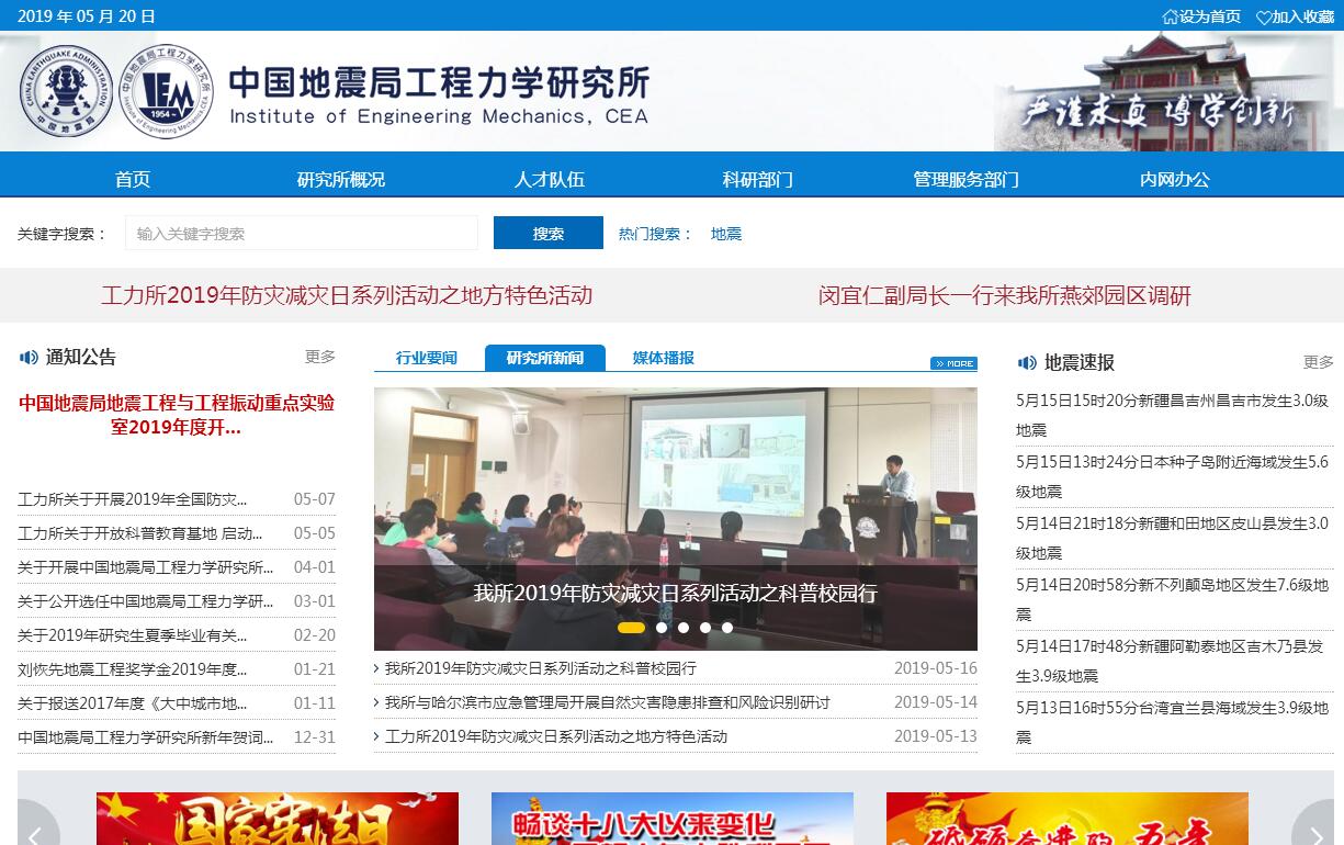 中国地震局工程力学研究所(简称工力所)筹建于1952年,正式成立于1954年,最初定名为中国科学院土木建筑研究所,是国内唯一以地震工程和防灾减灾为主要研究领域的国家公益性科研机构。建所以来,工力所服务国家战略需求和经济社会发展,始终围绕现代化建设需要开展科学研究,主攻研究领域逐步调整。1954年-1962年,为中国科学院土木建筑研究所,主要从事建筑材料、土壤力学、工程结构和建筑设计等方面的研究,同时开展钢筋混凝土和预应力钢筋混凝土、地震工程、结构安全度和黄土工程性质等研究方向的探索。1962年-1970年,更名为中国科学院工程力学研究所后,主要研究领域调整为地震工程、核反应堆结构力学、土壤力学、冲击与振动和特殊混凝土材料及其动力性能的研究。1970年-1984年,受国家地震局和中国科学院的双重领导。1984年4月,改由国家地震局领导,所名随之改为国家地震局工程力学研究所。主要研究领域调整为地震工程和防灾减灾,主要开展强震动观测、工程地震、结构工程、生命线工程、岩土工程、城市防灾减灾等方面的研究。1998年4月,随着国家地震局更名为中国地震局,所名改为中国地震局工程力学研究所。中国地震工程学奠基人、中国科学院学部委员刘恢先教授担任首任所长,胡聿贤、谢君斐、谢礼立、冯启民、齐霄斋、王自法先后担任所长。现任名誉所长谢礼立院士,所长孙柏涛研究员。工力所现设有强震动观测、工程地震、结构工程、生命线工程、城市与工程综合防灾、岩土工程、振动测量仪器等七个研究室和恢先地震工程综合实验室。设有所务办公室、科技发展部、人才资源部、计划财务部、党群工作办公室、纪检监察审计室、离退休工作办公室、北京园区办公室等八个管理部门,以及后勤管理中心、科技杂志社、图书资料与网络中心、试验厂等科研辅助部门。工力所是中国地震局地震灾害评估、房屋建筑安全鉴定、地震预警与烈度速报以及强震动观测的技术牵头单位,国家强震动台网中心建在工力所北京园区(燕郊)。工力所还建有中国地震局地震工程与工程振动重点实验室、黑龙江省灾害预警与工程防御重点实验室、黑龙江省防震减灾工程技术研究中心,拥有地震模拟振动台阵、伪动力试验设施、超级计算机系统、土工离心机振动台、超低频振动计量标准装置、动三轴和共振柱土动力试验装置、多功能静力触探车等大型试验设备,并且是国际先进、国内领先的地震工程综合试验系统。工力所是国家首批硕士、博士学位授权单位,现有土木工程一级学科博士学位授权点和土木工程、仪器科学与技术、力学等3个一级学科硕士学位授权点,设有土木工程博士后科研流动站。现有专兼职博士生导师40余人、硕士生导师60余人,每年招收硕士研究生近70人、博士研究生20余人、博士后若干。工力所近年来承担完成了一大批国家级科研项目(如我国土木工程领域第一个国家973计划项目《城市工程的地震破坏与控制》),组织参加了国内主要破坏性地震的工程震害调查(如汶川、玉树、芦山、鲁甸地震等)。1985年以来,共获国家级科技奖励20项、省部级科技奖励170余项。工力所组织编写了我国第一部抗震设计规范(草稿),主持编写了《核电厂抗震设计规范》、《建筑工程抗震性态设计通则》(试用)、《中国地震烈度表(1980)》等20余部国家技术标准及行业和地方标准,参与编写了《建筑抗震设计规范》等近40部国家技术标准,出版了《唐山大地震震害》、《地震工程研究报告集》、《刘恢先地震工程学论文选集》、《地震工程学》等数十部学术专著,编辑出版《地震工程与工程振动》、《自然灾害学报》、《世界地震工程》等三本中文核心期刊以及《Earthquake Engineering and Engineering Vibration》SCI和EI双检索英文期刊,为我国的地震工程研究和防震减灾事业发展做出了重要贡献。工力所是中国地震工程联合会、中国地震学会地震专业委员会和亚太地震工程研究中心联合会的秘书处挂靠单位,承办了第十四届世界地震工程大会,多年来与美国、日本、俄罗斯、欧盟、韩国等三十多个国家以及中国香港、澳门、台湾等地区进行了广泛的合作研究,享有很高的国际学术声誉。此外,工力所持有建设工程地震安全性评价甲级资质、地质灾害危险性评估甲级资质、工程勘察(岩土工程)甲级资质等,完成了《金沙江下游梯级水电站水库地震监测系统建设》、《京沪高速铁路地震动参数区划》、《故宫博物院文物减隔震防护装置研制》等项目。作为铁道部与中国地震局高速铁路地震安全技术研发组的地震系统牵头单位,工力所与铁道部门合作开展了高速铁路地震监测预警的技术研发和系统建设。