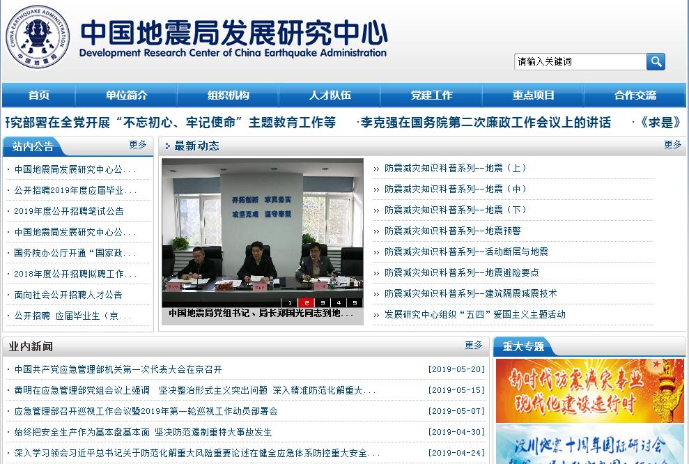 | 网站简介: 中国地震局发展研究中心是中国地震局直属的公益一类事业单位。主要负责开展国家防震减灾工作发展战略、方针政策、法律法规等研究工作,参与编制防震减灾规划等。 |