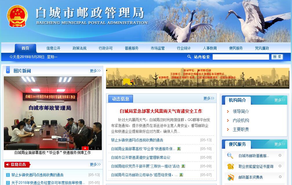 | 网站简介: 白城市邮政管理局的主要职责是:1、贯彻执行国家邮政法律法规、方针政策和邮政服务标准;2、研究拟订本地区邮政发展规划;3、监督管理本地区邮政市场及邮政普遍服务和机要通信等特殊服务的实施;4、负责行业安全生产监管、统计等工作;5、保障邮政通信与信息安全;6、承办上级邮政部门和地方人民政府交办的其他事项。 |