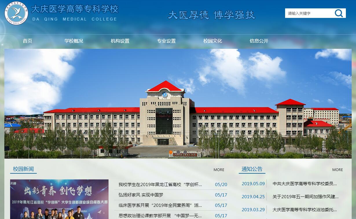 大庆医学高等专科学校的前身大庆石油管理局卫生学校建于1965年,大庆职工医学院于1985年在卫生学校基础上成立。2002年8月,学校开始在大庆职工医学院(大庆石油管理局卫生学校)基础上申办大庆医学高等专科学校,2006年2月经国家教育部批准成立,成为黑龙江省一所独立设置的医学高等专科学校。学校是黑龙江省优秀骨干高等职业院校;省高职高专医药卫生类专业建设教学指导委员会主任委员单位;省高职高专医药卫生类专业建设教学指导委员会临床医学专业、康复治疗技术、助产专业分委员会主任委员单位;省大学生心理健康教育及心理咨询专业副主任委员单位。学校还是全国医学高职高专教育研究会副主任委员单位、全国卫生职教联盟副理事长单位、全国医学教材建设委员会专家成员单位、全国医学教育慕课联盟理事单位、黑龙江省康复医学会副理事长单位、黑龙江省医学心理学会副理事长单位、大庆市医院联盟理事会成员单位。学校目前以普通专科教育为主,成人教育和继续教育为辅。现开设护理学、康复治疗技术、临床医学、口腔医学、口腔医学技术、药学、医学检验技术、助产、医学营养、中药学、针灸推拿11个专业。学校是黑龙江首批和国家第二批现代学徒制试点单位,国家职业教育康复治疗技术专业教学资源库建设项目单位;现有国家财政支持提升服务能力专业2个(康复治疗技术、临床医学),国家养老服务类示范专业点1个(康复治疗技术),国家级学徒制试点专业2个(营养学、药学),黑龙江省高等职业院校高水平骨干专业建设项目3个(护理、康复治疗技术、药学);黑龙江省重点建设专业6个(康复治疗技术、临床医学、口腔医学、口腔医学技术、药学、医学检验技术);学校现有8门省级精品课(解剖学、病理学、生理学、妇产科护理学、儿科护理技术、内科护理技术、内科常见病诊治、运动疗法技术)。学校同时开展职工在岗培训,是黑龙江省卫生厅全科医学教育基地、乡村卫生技术人员培训基地、医学继续教育I类学分授予基地、大庆市全科医师培训基地和再就业培训基地、大庆油田有限责任公司职工培训基地。学校现有全日制普通大专在校生3201人,成人学员162人。学校目前占地面积24.6万平方米,建筑面积7.5万平方米;固定资产总值10023万元,其中教学仪器设备2846万元;藏书24万册。学校设有“两所两中心”(大庆市特殊病原研究所、优生遗传研究所、司法鉴定中心、心理健康指导中心),拥有东北地区唯一一所以过敏病诊疗为主的专科医院(大庆过敏病医院)作为校内门诊部。学校的附属医院是大庆油田总医院、龙南医院、大庆市中医医院。在校内建设了20个与临床工作实际接轨、现代化、高仿真的专业课实训中心,现有国家财政支持实训基地项目1个(护理实训中心);黑龙江省高等职业教育实训基地重点建设项目1个(康复治疗技术实训基地)。校院共建包括广州中山医科大学附属第一医院、深圳北大医院、北京武警总医院等辐射全国的校外实训基地83个。学校建有覆盖整个校园的千兆有线网络和无线网络,建有数字化校园和网络化教学平台2套应用系统以及一卡通系统等。学校设教学系(部、院)10个,机关后勤部门9个,直属部门5个。现有教职工312人,其中专任教师142人。教师中具有高级职称的50人(其中正高级职称13人,副高级职称37人);具有硕士学位以上的76人。并从大庆各大医院聘请了304名临床医护专家作为兼职教师。教师队伍中涌现出省级教学团队2个、师德先进集体2个、名师4人、优秀教师1人、教学新秀1人、优秀教育工作者1人、师德先进个人3人、高校教师年度人物提名奖1人;在全省首届普通高校教学管理质量奖评选中,学校获得集体奖4项,个人奖3项。辅导员中先后有2人获得全省辅导员年度人物奖和提名奖;4人获得心理咨询资格证书,5人获得就业指导师资格证书。学校创建了“(技能+特长)×态度”的特色人才培养模式。以技能、特长培养解决学生“如何做事”、就业的问题,以态度培养解决学生“如何做人”、可持续发展的问题,强化学生的职业能力培养,更加注重学生的全面发展。该人才培养模式在中国高教学会高教管理研究会2008学术会议暨第三届大学经营国际论坛做了典型经验介绍,2011、2012、2013年连续三年在全省高职高专教学工作会议上进行了典型发言,2013年8月在全省高等职业教育论坛上进行了经验介绍,并被列为大庆油田科研项目、矿区服务事业部重点科研项目,黑龙江省高等教育新世纪教学改革项目、省级人才培养模式创新实验区,获得省教育科研项目一等奖。学校招生在黑龙江省的基础上,涵盖北京、上海、天津、重庆、山西、内蒙古、辽宁、吉林、安徽、江西、山东、河南、湖北、广东、广西、四川、贵州、陕西、甘肃、青海、宁夏22个省(市)。近年来,学校毕业生一次就业率高于全省平均水平,学生护士执业资格考试通过率达到90%以上;就业区域主要有省内的哈尔滨、齐齐哈尔、大庆等地,省外的北京、上海、天津、辽宁、吉林、福建、海南海口、山东青岛、河北石家庄、河南郑州、内蒙古包头等地;先后有56名学生通过考试赴英国、新西兰、日本、加拿大、美国、沙特等国留学及就业。建校以来,培养毕业生26600余人。有些已成为所在单位的领导,许多人成为业务骨干。特别是护理专业毕业生,深受