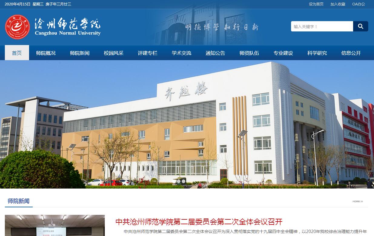 沧州师范学院坐落于河北省东部渤海之滨、运河之畔的沧州市,秉承“明德博学知行日新”的校训,经过59年的建设和发展,学校已成为以教育类学科为主,涵盖文、理、工、管、艺术等多学科的地方性、应用型普通本科高等院校。学校始建于1958年。1962年更名为沧州师范学校,1970年并入泊头师范学校,1976年复建沧州师范学校,1984年升建为沧州师范专科学校,1991年5月,沧州地区教育学院并入沧州师范专科学校,2001年9月,沧州师范学校、沧州市教师进修学校、沧州农机工程学校并入沧州师范专科学校,2010年3月升建为本科层次的普通高校,更名“沧州师范学院”。2014年获得学士学位授予权。学校规划用地1028亩。现已完成713亩的规划建设,附属中学占地62.8亩,政府新批建设用地249亩。目前建筑面积36.82万平方米,现有各类实验(实训)室239个,校外实习基地130个,固定资产44376万元,其中教学设备仪器总值8747万元;图书馆馆藏纸质图书128万册,纸质期刊1439种,电子图书44万册,其中线装图书6000余册,《许氏说文》为明末清初影印本,《四库全书珍本初集》为1936年由中央图书馆筹备处委托上海商务印书馆影印《文渊阁》本;《申报》《大公报》等珍贵影印资料200余册。有15个数字资源数据库。校园网全面覆盖教学与办公区。现有教职工871名,其中专任教师607人,副高级以上职称233人,具有硕士、博士学位者405人。拥有国务院特殊津贴专家、省政府特殊津贴专家、河北省教学名师等一批优秀教师。外聘教师130人,并聘请知名学者担任客座教授。学校现有18个二级学院,目前招生专业中本科38个,专科26个,涵盖法学、教育学、文学、历史学、理学、工学、农学、管理学、艺术学九大学科门类,形成以师范专业为基础,师范与非师范专业协调发展的办学格局。学校主要面向河北省招生,生源来自全国19个省(市、自治区),有全日制在校生12603人,其中本科生8578人,专科生4025人。建校近60年来,为地方基础教育和经济社会发展培养和输送了大量高素质人才,造就了一批以资深文物鉴定专家赵榆、北京外国语大学博士生导师韩宝成、鲁迅文学奖获得者李浩等为代表的文化教育精英,许多毕业生成为省、市、县党政机关、企事业单位的主要领导和技术骨干。近几年,学校以应用型人才培养为目标,不断深化教育教学改革,人才培养成效显著,为地方基础教育培养中小学以及幼儿园教师5000余人,为区域经济发展培养应用型人才近万人。2014-2017届毕业生平均就业率近90%;毕业生考研录取率(录取数与报名数比例)为51.3%,在同类院校中名列前茅。在国家级、省级电商大赛、创业创新大赛等各类专业比赛中,我校学生获奖111项。冰窟救人的大学生王盼荣登“中国好人榜”,杜茜被团中央授予“全国优秀共青团员”称号,并出席全国第十七届团代会。我校化学专业是教育厅首批省级专业综合改革试点专业;化学实验教学中心与生物学实验教学中心是河北省高校实验教学示范中心,建有1个省级大学生校外实践教育基地,1个省级大学生创新创业孵化园。有2门省级精品课。获河北省高校教学成果二等奖2项,三等奖6项。我校有应用化学与文艺学2个省级重点发展学科,有中国武术培训基地、齐越教育研究中心、河北省绿色化学研究中心、河北省非物质文化遗产研究基地等21个科研平台。近三年来,完成省部级课题69项,其中国家社科基金项目1项,教育部人文社科一般项目2项,河北省自然科学基金项目3项,河北省哲学社会科学基金项目15项;完成横向课题21项。教师在国内外公开发表论文800余篇,其中国内核心期刊102篇,被SCI、EI、A&HCI、ISTP检索收录论文18篇;出版著作49部,教材40部。获沧州市社会科学优秀成果奖94项;申报国家实用新型专利45件。学校建有3个独具特色的科研和教育基地。“中国武术培训基地”充分挖掘整理沧州武术文化,开展武术专业的国际推广培训,推进“武术进校园”活动和武术段位考评。“野生动物救护中心”承担野生动物救护、疫源疫病监测、鸟类环志、湿地研究等工作,为国家、省市野生动物救护提供了大量的监测数据,中心被命名为“全国重要野生动物疫病主动预警试点工作实施单位”“河北省野生动物疫源疫病监测点”“河北省科普教育基地”。“齐越教育研究中心”依托齐越教育馆,集展品保护、革命教育、科学研究为一体,努力建设成为国内新闻传播从业人员革命传统教育基地,播音艺术教育研究基地,中小学教师汉语口语表达技能培训基地,京津冀语言、传播交流发展综合实训基地。大力推进学术交流与合作,聘请美国威斯康星大学、清华大学、北京师范大学等高校的知名学者为客座教授。与韩国、美国、加拿大、德国等14个国家和地区40余所高校结为友好院校,完成30余次互访,建立了广泛的合作。留学韩国已成为我校国际交流的主要工作内容,有100多名学生出国交换或深造。多次承办国家级、省级学术会议,2017年举办学术讲座116场次,参加全国性学术会议200余人次。学校被省委、省政府评为“河北省文明单位”,先后获得“河北省青少年科技创新教育示范基地”、首批“河北省青年普法志愿者培训基地”“河北省五四红旗团委”“河北省青年志愿者优秀集体”等多项荣誉称号;被团中央授予“MM百万青年创业计划”优秀组织奖;被评为河北省第一批高校文化讲坛;《沧州师范学