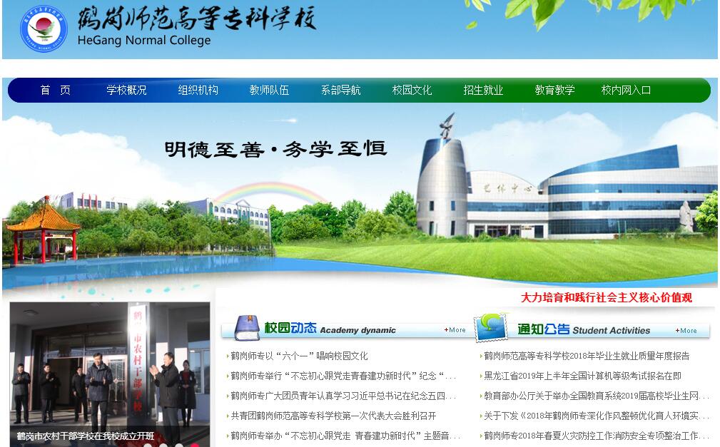 鹤岗师范高等专科学校是2002年3月经国家教育部批准的公办全日制普通高等院校,其前身是始建于1958年的鹤岗市师范学校及鹤岗矿务局师范学校、鹤岗财经学校,至今已有59年的办学历史。学校坚持“突出教师教育优势,大力发展职业技术教育,为基础教育及地方经济社会发展服务”的办学定位。学校确立了 “强化教师教育办学特色,拓宽职业技术类专业,积极为地方开展技能培训”的办学思路。学校办学条件完善。现有东西两个校区,校园占地面积近50万平方米,建筑面积近10万平方米,固定资产1.32亿元,教学仪器设备总值近2000万元,图书馆藏书36万册。学校主校区现有教学楼二栋;艺体综合楼一座,内设篮球馆、排球馆、乒乓球馆、体操馆、舞蹈房、琴房;有标准化体育运动场、篮球场、网球场和羽毛球场等运动场地;设有餐厅超市综合楼和可容纳5000余名学生的公寓四栋。附属小学一所。学校教师队伍合理。现有教职工422人。专任教师216人,其中教授及正高职30人,副教授及副高职158人;博士3人,硕士研究生导师1人,硕士研究生63人;享受国务院、省政府特殊津贴2名,获曾宪梓基金奖2名,省级名师2名,省级中青年骨干教师26名,省级领军人材梯队学科带头人1名,市级领军人才1名、拔尖人才11名、优秀人才12名。学校设有人文社会科学系、教育科学系、外语系、计算机技术系、数理与工程技术系、财务与经济管理系、体育教研部、思想政治教研部8个系部。开设语文教育、英语教育、学前教育、计算机应用、历史教育、数学教育、地理教育、音乐教育、体育教育、美术教育、学前教育等15个教师教育类专业,以及会计与审计、计算机网络技术、建筑工程技术、煤矿开采技术、矿山机电、煤化工生产技术、新闻采编与制作、应用俄语等41个职业技术类专业。学校现有语文教育、计算机网络技术2个省级教学团队,现当代文学、基础会计、综合俄语3门省级精品课程,学前教育、煤炭开采技术、语文教育、心理咨询、会计与审计5个专业被评为省级重点专业;学前教育和煤炭开采技术2个专业被确定为中央财政重点支持建设专业。招生范围辐射到全国28个省市自治区。学校现有各类学生1800人。学校注重实验实训基地建设。先后建设了教师教育综合素质训练中心、学前教育实训中心、计算机与网络技术实训中心、煤矿开采技术实训中心、新闻采编实验室、财会电算化实验室等校内外实验实训基地20余个。学校充分发挥高校在人才培养、科技创新、文化引领和社会服务方面的积极作用,不断提高为地方经济社会发展服务的能力。几年来,紧紧围绕黑龙江省“八大经济区、十大工程”发展战略和鹤岗市委确定的“8528”总体发展战略目标,积极探索与企业合作办学,实行订单式培养,先后开办了建筑工程技术、矿井通风与安全、矿山机电、煤矿开采技术、会计与审计、应用俄语等专业和鹤岗市幼儿园教师培训中心,为地方经济社会发展培养了一大批高素质技能型的落地人才,自2005年以来,学校共为鹤岗市培养各类落地人才2000余人。学校以“明德至善,务学至恒”为办学理念,加强学风、教风、校风建设;坚持以教学为中心,强化学术研究,教学与科研成果显著。先后承担和参加了国家自然科学基金项目、国家重点基础研究发展规划项目(973)、国家高技术研究发展计划(863计划)项目以及省自然科学基金项上目等科研课题20余项,完成省(厅)教改课题90项,获省级科技进步二等奖1项,省级教学成果二等奖1项,市级教学、科研成果奖100余项,全国优秀科技图书三等奖1项,国家实用新型专利10余项,发表学术论文800余篇,出版教材及学术专著130余部。教师在各类省级以上教学竞赛获奖60余项,学生参加省以上各类竞赛获奖150余项。毕业生专升本考取率,连续六年高于全省平均水平;2012年达到16.62%,高于全省平均水平11.62个百分点。2013年达到26.51%,高于全省平均水平21.51个百分点。2014年达到21.8%,高于全省平均水平16.8个百分点。学校始终坚持合作办学,积极拓宽办学渠道。先后与哈尔滨师范大学、黑龙江大学、黑龙江工程学院、哈尔滨铁道职业技术学院等省内院校开展合作办学;与中央财经大学、北大青鸟、北京科瑞尔思国际研发集团、北京科技职业学院开展跨省市合作办学;与俄罗斯阿莱汉姆大学、日本富山国际大学、马来西亚林登大学建立了国际间校际友好关系。学校建立多个省内外就业基地。先后建立了北京、广州、东莞、杭州、苏州、常州、哈尔滨等就业基地,为学生就业提供机会搭建平台。连续三年毕业生就业率高于全省平均水平;2012年毕业生就业率达到87.6%;2013年毕业生初次就业率达到82.5%。近年来,学校先后被评为黑龙江省精神文明单位标兵、黑龙江省花园式单位、鹤岗市文明单位标兵。学校党委先后被鹤岗市委授予领导班子思想政治建设工作先进单位、先进性教育先进集体、党建工作先进党委等荣誉称号。自2006年以来,学校连续六年在鹤岗市责任制目标考核中获得优秀等级。