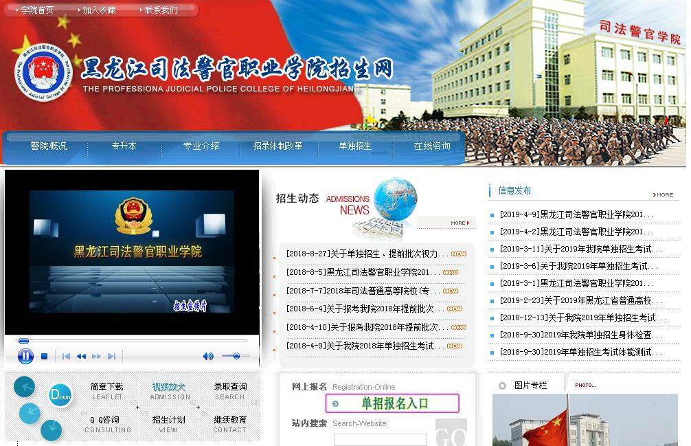黑龙江司法警官职业学院是经黑龙江省人民政府批准成立、国家教育部备案的公办政法类全日制普通高等学校。曾先后被评为国家级重点学校、部级重点学校和省级重点学校,被司法部授予集体一等功。学院是全国教育管理创新示范院校,并于2012年当选黑龙江省高职高专教育法律类专业教学指导委员会主任委员单位,奠定了学院在全省法律类高等职业教育领域的龙头地位,为进一步推进学院法律类专业教学建设和教学改革搭建了新的平台。学院的人才培养方向主要是为司法行政系统培养人民警察和法律服务工作者。学院面向全国招生,毕业生面向全国就业。学院的办学指导思想是:稳步发展高等职业教育,大力发展在职继续教育,突出警官学院办学特色,提高警官学院办学水平;办学特色是:从严治警、从严治校,强化养成教育、强化素质教育;发展定位是:立足系统,服务社会;立足龙江,面向全国;特色立校、从严治校、人才强校、质量兴校;依托行业、服务行业、融入行业、引领行业;发展方向是:加强预备警察培养基地建设、在职人员继续教育基地建设、司法行政理论研究基地建设。学院地处高校集中的哈尔滨市南岗区学府路,交通便利,教学区、生活区、实验实训区布局科学合理,拥有图书馆、室内体育馆、游泳馆、警体训练馆、实弹射击训练馆、刑事影像处理实训室、痕迹检验实训室、现场勘查实训室等教学设施和41个校内实验实训室及150个校外实习实训基地。(包括全省24个监狱、14个戒毒所,以及多家法院、检察院、律师事务所、司法鉴定机构等)。学院拥有综合配套的教学楼、实验实训楼、学生宿舍、办公楼共12座,有学术报告厅、教学录播系统、图书馆、室内体育馆、游泳馆、警体训练馆、实弹射击训练馆,还拥有刑事影像处理实训室、痕迹检验实训室、现场勘查实训室、罪犯个体心理咨询实训室、罪犯团体心理咨询实训室、罪犯心理测量实训室、监狱安全信息采集实训室、司法会计模拟实验室、司法会计电算化实验室、司法会计职场模拟实验室、司法信息技术专业综合实训室、司法信息采集实训室、司法信息技术实训室、办公自动化实训室、人民调解实务实训室、法律咨询实训室、社区矫正实训室、法律文书制作实训室和模拟法庭等现代化的教学基础设施。学院紧密结合专业实际,设有41个校内实验实训室和150个校外实习实训基地。包括全省24个监狱、14个戒毒所,以及多家法院、检察院、律师事务所、司法鉴定机构等。学院设有黑龙江省内规模较大的汽车驾驶员培训学校。学院现有专任教师215人,其中具有高级职称的教师92人,具有硕士研究生学历或硕士以上学位的教师90人,“双师”素质教师109人,校外行业、企业兼职教师111人,具有一支适应现代高等职业教育需要,思想素质、业务能力“双过硬”,年龄结构、学历结构、专业结构和职称结构比较合理的专兼结合的“双师素质型”教师队伍。根据政法部门录警的需要,我院重新调整设置了6个涉警专业,其中有3个省级重点专业, 2个中央财政支持重点专业建设项目已顺利通过检查验收,为了能够适应政法一线对人才的实际需求,目前学院涉警专业男女招生比例为8:2。学院始终坚持教书育人、管理育人、服务育人相结合,不断深化教育教学改革,积极打造培养学生高素质、多技能的人才培养模式。学院始终重视学生综合素质教育,强化学生养成教育,实施以“五化”(德政教育体系化、警容风纪标准化、警体训练常态化、学习生活制度化、内务卫生规范化)为内涵的学生警务化教育管理。作为警察的摇篮,学院十分重视学生擒拿格斗的教学与训练。不仅警体课上有警务技能教学,在业余时间,还以年级为单位组建了精英训练队。进一步学习和强化各种擒拿格斗技能,这一做法丰富了同学们的业余文化生活。学院注重发挥英语协会、美术协会、舞蹈协会、足球协会、文学社等学生社团的作用,通过组织开展丰富多彩的高品位校园文化活动,开发学生的创新能力,培养学生特长,陶冶学生情操,提高学生综合素质。学院法律事务专业学生在“全省高职院校法律应用技能大赛”中荣获民事法律应用技能和经济法律应用技能全部赛项团体一等奖;司法信息技术系学生荣获“全国高等院校信息素养与核心技能大赛总决赛高职组冠军特等奖和一等奖”,两名同学分别获得2012年、2013年“IC3大赛海峡两岸赛一等奖”。学院拥有集餐饮、超市、游泳、洗澡、理发、照相、洗衣、IC电话、书店、储蓄、卫生医疗救助等配套的学习生活综合服务体系,有一支责任心强、素质高的后勤服务队伍,能够为学生学习、生活提供优质高效地后勤服务。学院为有志升入大学本科层次继续学习和深造的学生提供了十分便利的条件,每年按省教育厅统一规定的报考比例推荐应届毕业生参加专升本考试,符合录取条件者可升入专业对应的省内本科院校学习,毕业时颁发全日制第一学历本科文凭,并授予相应学位。学院是经省高等教育自学考试委员会批准的首批高职高专院校 “专本衔接”考试的试点院校。学院与黑龙江大学联合举办本科自考助学班,专科生在校期间可同时参加自考本科学习和考试,考试合格可以获得自学考试本科毕业证书。参加学位考试外语合格者,同时可以获得本科学士学位。我院学生大三就具有参加政