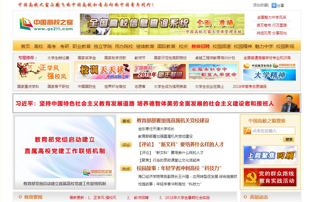 中国高校之窗网(www.gx211.com)成立于2004年1月,是中华人民共和国教育部、中国教育电视台精心打造的以“立足教育,面向学生,服务高校”为宗旨的教育类门户网站。是提供全面高校资讯,展示大学风采,助推高校发展和研究的高端平台。中国高校之窗网坚持深入贯彻和落实党的十八大精神,以高举中国特色社会主义伟大旗帜为中心,创新实践网络思想政治教育;以“立足教育,面向学生,服务高校”为宗旨,繁荣发展积极健康的校园网络文化。中国高校之窗网站充分发挥网络凝聚、服务、教育、引导、宣传的作用,促进社会主义先进文化在网上和校园间的传播,促进学生高尚思想道德品德的形成,促进学生社会道德责任感的形成,促进学生社会主义核心价值观的形成。中国高校之窗网站以“弘扬先进文化、服务中国高校、塑造学生品格、引导学生成才”为主题。高校传授学生专业知识固然重要,但培养学生的精神是高校最最重要的根本任务。满足学生日益增长的成长成才需求,使网站成为青年学生喜爱的网上精神家园。中国高校之窗将以报道中国高校的卓越教育体系、提升教育质量为核心、培养社会合格人才、完善学生走向世界的自我成长平台为高校的社会责任。中国高校之窗宣传学生的创新精神、创造能力,具有竞争合作、互惠共赢的意识,具有和谐共存、共同发展的意识。