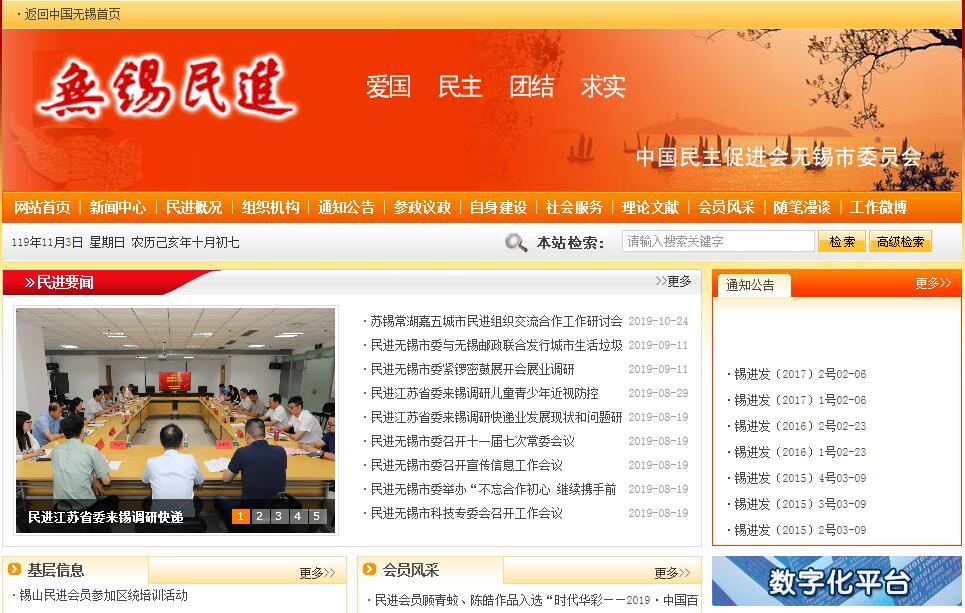 | 网站简介: 中国民主促进会,是以从事教育文化出版工作的高中级知识分子为主的,是具有政治联盟性质的、致力于建设有中国特色社会主义事业的参政党。民进无锡市委第一届委员会于1958年4月19日成立,最初筹备成立时只有5名会员,2016年12月6日中国民主促进会无锡市第十一次代表大会选举产生了民进无锡市第十一届委员会,金元兴当选为主任委员,杨瑞金、吴国平、惠莲、康立为当选为副主任委员,任命惠莲为秘书长。到2016年12月, 我会共有县级地方组织2个,基层组织84个,其中基层委员会6个、基层支部78个。我会共有会员1372名,教育界别会员占66%,新阶层人士占10.1%,政府机关会员占9.7%,文化艺术界会员占7.3%,公有制经济人士占3.3%,其他界别会员占9.7%,保持了鲜明的界别特色;大学及以上学历会员820人,占62.9%;目前我会行政事业单位科级以上会员31人,特级教师13人,国家一级演员15人,国家级书画家、工艺美术大师24人,博士研究生14人;各级人大代表、政协委员188人。 |