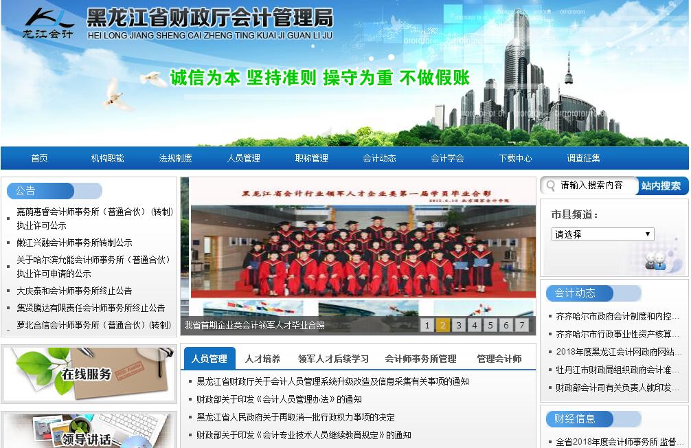 | 网站简介: 黑龙江省财政厅会计管理局主要职责:贯彻实施国家会计法规和政策;负责拟订全省性会计法规和制度;负责全省会计人员从业资格管理工作;负责单位会计核算和会计资料真实性、完整性情况检查工作;按规定负责全省会计专业技术职称考试、评审的管理工作;负责全省会计人员继续教育工作;监督全省会计电算化工作;指导全省会计基础规范工作;监督管理全省会计账薄设置工作;负责全省代理记账管理工作;指导会计学会工作。 |