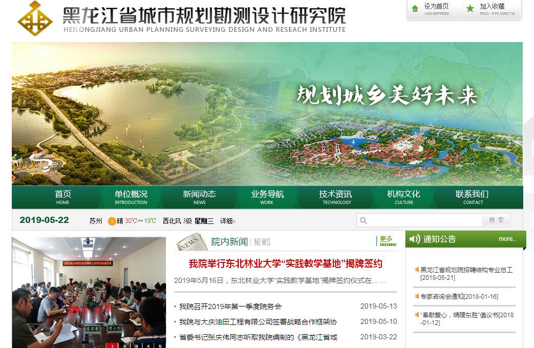 黑龙江省城市规划勘测设计研究院是一家创建于1979年8月,以服务于城乡建设事业为主的综合型规划设计勘察科研单位,具有国家批准的城市规划编制、给排水工程设计、风景园林设计、建筑工程设计、工程测量、岩土工程勘察、工程咨询与环境卫生、热力、道路工程设计、旅游规划等甲、乙级资质共计15项。2008年全院现有职工184人,其中有正、副高级技术职称人员64人。黑龙江省城市规划勘测设计研究院技术力量雄厚、专业配置齐全。单位下设城市规划、市政、建筑、风景园林、测量、地质、经济、计算机等12个作业所及6个管理职能部门。院内现代化技术设备先进,彩色激光打印机、彩色扫描仪、工程扫描仪、大幅面绘图仪等设备齐全,计算机普及率及成图率达到100%。建院二十多年来,业务遍及国内12个省、自治区,承担完成各层次和类型的城市规划设计、市政工程设计、风景园林规划设计、建筑工程设计、勘察测绘、工程咨询、旅游规划以及政府下达的科研任务总计4000余项,其中黑龙江省城镇体系规划、黑龙江省风景名胜区体系规划、大庆市城市总体规划、北安市闹龙河水库供水工程设计、瑷珲历史博物馆设计等百余项成果分别荣获国家、省部级嘉奖。 本院的质量方针为:“科学管理、质量第一、顾客至上、诚信守约、团结协作、持续发展”。在新世纪里,黑龙江省城市规划勘测设计研究院全体职工将竭诚为全国各地城乡建设提供更加优质的服务,为我国城乡规划建设事业的繁荣发展做出更大贡献。