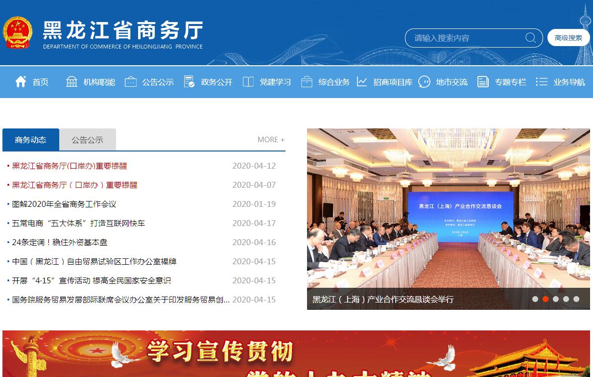 黑龙江省商务厅主要职责:(一)贯彻执行国家有关国内外贸易、利用外资及国际经济合作的发展战略、政策,拟订有关地方性法规、省政府规章草案并贯彻实施。研究经济全球化、区域经济合作、对外开放、现代流通方式的发展趋势和流通体制改革并提出建议。(二)负责推进流通产业结构调整,指导商贸服务业和社区商业发展,提出促进商贸中小企业发展的政策建议,推动流通标准化和连锁经营、商业特许经营、物流配送、电子商务等现代流通方式的发展。(三)拟订省内贸易发展规划,促进城乡市场发展,研究提出引导省内外资金投向市场体系建设的政策措施。指导全省大宗产品批发市场规划和城市商业网点规划、商业体系建设工作。推进农村市场体系建设,组织实施农村现代流通网络工程。(四)拟订规范市场运行、流通秩序政策。推动全省商务领域信用建设,指导商业信用销售,建立商务诚信公共服务平台。拟订促进餐饮服务、酒类流通和药品流通发展规划及政策,按有关规定对特殊流通行业进行监督管理。(五)承担组织实施全省重要消费品市场调控和重要生产资料流通管理责任。建立健全生活必需品市场供应应急管理机制。监测分析全省市场运行和商品供求状况,调查分析商品价格信息,进行预测预警和信息引导。按照分工负责重要消费品储备管理和市场调控工作。按有关规定对成品油和拍卖等行业进行监督管理。(六)贯彻实施国家进出口商品管理办法和进出口管理商品、技术目录。拟订促进全省外贸增长方式转变的政策措施。组织实施全省重要工业品、原材料和重要农产品进出口总量计划。会同有关部门协调大宗进出口商品,指导贸易促进活动和外贸促进体系建设。(七)执行国家对外技术贸易、进出口管制以及鼓励技术和成套设备进出口的贸易政策。推进全省进出口贸易标准化工作。依法监督全省技术引进、设备进口、国家限制出口技术工作。监督管理防扩散等与国家安全相关的进出口工作。(八)牵头拟订全省服务贸易发展规划。会同有关部门拟订促进服务出口和服务外包发展政策并组织实施,推动全省服务外包平台建设。(九)处理全省在国别(地区)经贸关系中的相关事务,负责对外经济合作和对外贸易协调工作。(十)组织协调全省反倾销、反补贴、保障措施及其他与进出口公平贸易相关的工作。建立进出口公平贸易预警机制。指导协调产业安全应对工作及国外对我省出口商品的反倾销、反补贴、保障措施的应诉及相关工作。(十一)宏观指导全省利用外来投资工作。负责权限内外商投资企业申报、设立及变更。依法监督检查外商企业执行有关法律法规、合同章程的情况。负责外商投资情况的统计、分析和联合年报。负责市(地)招商引资工作考评工作。组织境内外重大招商引资活动。(十二)指导省际间区域合作工作。负责区域经济合作情况的统计、分析。配合有关部门做好外来投资企业的服务工作。(十三)负责全省对外经济合作工作,依法管理和监督对外直接投资、对外承包工程、对外劳务合作等。配合有关部门做好外派劳务(含境外就业人员)的权益保护工作。牵头拟订境外投资管理办法和具体政策,依法监督管理省内企业对外投资开办企业(金融企业除外)。负责对外援助和受援相关工作。(十四)拟订与毗邻国家经贸发展规划、政策和措施,指导管理对俄边境小额贸易、边民互市贸易。负责省对俄、东北亚地区多边、双边经贸会议活动的组织与衔接工作。负责管理边境贸易重点商品专营权。(十五)牵头拟订全省经济类开发区发展规划和相关政策,指导和协调全省相关工作。牵头综合全省开发区(含经济类和科技类)情况。负责全省口岸运行管理、对外联络、综合协调和发展建设等相关工作,牵头拟订有关政策措施。(十六)研究拟定国际商务人才队伍建设发展规划并组织实施。监督指导各地对口部门做好国际商务人才队伍建设。协助指导全省各类园区非公有制企业党建工作。(十七)负责本行业领域行业规划、产业政策、法规标准、行政许可、日常管理等方面的安全生产工作,指导本行业领域单位的安全生产工作。(十八)完成省委、省政府交办的其他任务。