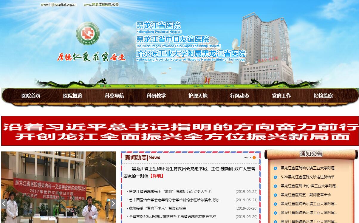 黑龙江省医院暨黑龙江省中日友谊医院隶属于黑龙江省卫生健康委员会,成立于1954年9月8日。总院位于黑龙江省哈尔滨市香坊区中山路82号,是一所集医疗、教学、科研、预防保健、社区服务和康复医疗于一体的三级甲等综合性医院。公益二类事业单位,经费形式为省财政部分补助。2017年门(急)诊量927060人次,出院病人数71151人次,手术例数22205人次,年业务收入118803.63亿元。医院占地面积5.53万平方米,总建筑面积24.2万平方米,医疗用房21.7万平方米。固定资产原值20亿,现有3.0T磁共振、西门子Flash炫速双源CT、西门子三维DSA、西门子S2000彩超机、全自动高速生化分析仪、多功能胃肠机等总价值5.2亿元的医疗设备。目前开放床位2442张,56个临床专业、9个医技专业、9个教研室。医院下设香坊院区、南岗院区、消化病院、门诊部、火车头社区服务中心,黑龙江省急重症抢救中心也设在我院。医院在职职工总数2732人,其中卫生技术人员2292人,正高级职称人员318人,副高级职称人员453人,博士学位55人,硕士学位465人。获得国务院津贴22人,省政府津贴25人。医院消化内科经国家卫生和计划生育委员会批准成为国家临床重点专科。消化病学、皮肤病学、口腔内科学、内分泌病学与代谢病学、整形外科学、医学影像学、神经病学7个学科为省级领军人才带头人梯队。内科学(呼吸病学)、外科学(骨外科学)、外科学(神经外科学)、神经病学、妇科学、眼科学、药学(药剂学)、中西医结合医学、外科学(普通外科学)、外科学(心血管外科学)、儿科学、临床医学(临床诊断学-物理诊断学)12个专业为厅级重点学科。消化内科、泌尿外科、整形外科、高压氧为省级医疗质控中心。医院秉承厚德、仁爱、求实、奋进的精神,坚持制度立院、质量建院、人才兴院、文化强院的办院方针,努力实现建设管理现代化、服务人性化、设备一流化、人才专业化的诚信医院。2018年是医院深入贯彻落实“医院十三五发展规划”,实现发展战略转型的起步之年。医院将以习近平新时代中国特色社会主义思想为指引、以省委省政府发展龙江健康战略为指导、在新一届委党组的全力支持和帮助下,以维护龙江人民健康为己任,以问题为导向,以改革创新为动力,以现代化医院管理制度为抓手,转方式、调结构、建机制、强内涵、稳增长、抓落实,全力打造管理精细、运行高效、特色鲜明、服务人文,医教研管服并重的现代化省级医学中心,力争实现服务能力有明显提升、学科建设有较大突破、安全生产得到有效保证、整体运营保持相对平衡,让政府放心、病人满意、社会信任、百姓健康、职工幸福的五位一体战略目标。