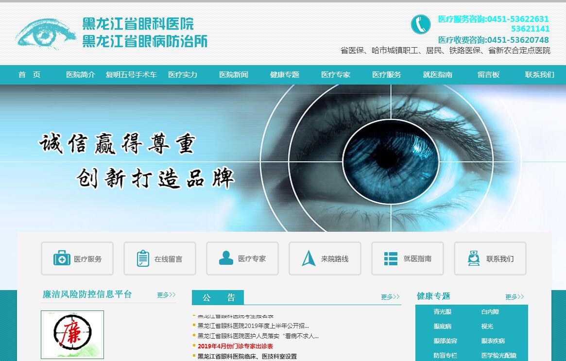 黑龙江省眼科医院(黑龙江省眼病防治所)为“三级甲等专科医院”始建于1959年,隶属于黑龙江省卫生计生委,是公益二类事业单位,承担全省眼科医疗、教学、科研、康复工作,并履行省防盲技术指导组办公室工作职能,协助省卫生计生委制订全省防盲工作规划,并督促检查、指导、评估全省防盲规划及卫生部下达的眼科重大公共卫生服务项目落实情况;对基层医院眼科医生进行技术培训。临床工作:白内障超声乳化、人工晶体植入术;各种青光眼的药物、激光及手术治疗;玻璃体出血、眼内异物、视网膜脱离、增殖性玻璃体视网膜病变、黄斑裂孔、眼外伤等玻璃体切除手术;开展显微手术治疗技术,有效为斜视病人手术治疗;开展小儿、学龄儿童弱视训练矫正治疗;新引进日本尼德克EC-5000CX2纳米视准分子激光系统和玻前像差系统治疗100-1200度近视,600度以内近视和散光。防盲工作:管理使用“复明五号”眼科流动手术车,赴基层边远贫困地区开展复明扶贫巡回医疗,为贫困白内障患者实施手术救治;进行全省眼科流行病学调查研究,为政府制订卫生工作政策提供科学依据。医院社区卫生服务中心选派医疗专家“走进社区、惠民复明”。让广大的百姓不出家门就能享受到免费的专家咨询、眼科检查以及科普知识讲解,为眼病患者送去福音。科研工作:自2013年至今获黑龙江省医疗卫生新技术应用奖18项;获批卫生厅科研课题9项,完成4项;完成黑龙江省继续医学教育项目5项;完成哈尔滨市继续医学教育项目1项;协助完成“视觉第一 中国行动”三期项目工作会暨黑龙江省中西医结合学会眼视光专业委员会第三次学术交流会;全院卫生技术人员继续医学教育学分审验通过率100%。医院年总收入两千万余元。专业技术人员:医疗专业技术人员85人,其中正高职19人、副高职13人、中级9人、初级44人;硕士13人,硕士生导师1人。眼科先进设备:角膜地形图、泪膜破裂时间测定、角膜内皮细胞测定、IOL Master、超声诊断仪、超声生物显微镜、全自动视野仪、视觉诱发电位、眼底血管造影、光学相干断层扫描仪、眼前节激光治疗仪、玻璃体消融激光治疗仪和多波长激光眼底治疗仪、负压无创青光眼治疗系统(PNT)、氩离子眼底激光治疗仪、泪道激光、白内障超声乳化仪、玻切机、激光角膜共焦显微镜、准分子激光近视眼治疗仪等。医院设施:现有病床80张、单间12间。手术室为最先进的层流手术室,配有百级手术间2间、万级手术间2间、万级辅助间8间。是省医保、哈市城镇职工、居民医保、铁路职工及家属医保、省新农合医疗定点医院。医院秉承敬业、创新、博学、奉献的理念,竭诚为广大患者服务。