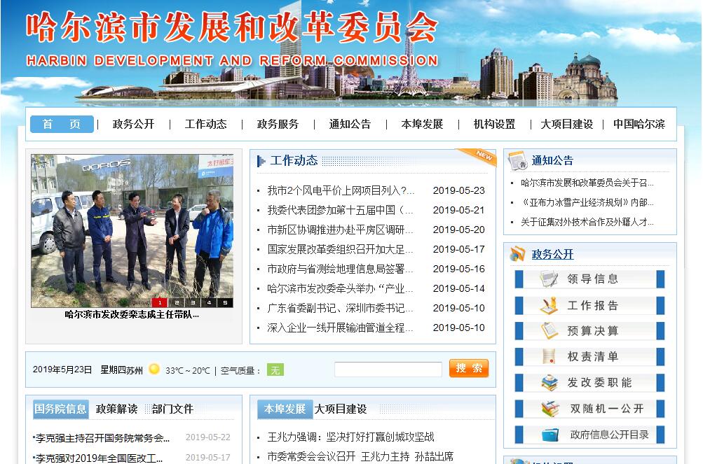 哈尔滨市发展和改革委员会是市政府批准的正局级行政单位,单位地址为松北区世纪大道1号。哈尔滨市发展和改革委员会主要职责:(一)拟订并组织实施全市国民经济和社会发展战略、中长期规划和年度计划,统筹协调经济社会发展,研究分析国内外经济形势,提出全市国民经济发展、价格总水平调控和优化重大经济结构的目标、政策,提出综合运用各种经济手段和政策的建议,受市政府委托向市人大提交国民经济和社会发展计划的报告。(二)负责监测全市宏观经济和社会发展态势,承担预测预警和信息引导的责任,研究宏观经济运行、总量平衡、经济安全和总体产业安全等重要问题并提出宏观调控政策建议,负责协调解决经济运行中的重大问题,调节经济运行,负责组织重要物资的紧急调度。(三)负责汇总和分析财政、金融等方面的情况;负责制定全市财政金融发展战略和中长期发展规划、年度计划;协调筹措重点建设资金;负责全市上市公司的审核、推荐申报和规范管理工作;承担依法监管小额贷款公司的责任;负责市属投融资平台的建设管理工作;负责全市金融市场体系建设工作;参与制定财政政策和土地政策,拟订并组织实施产业政策和价格政策;综合分析财政、金融、产业、价格政策的执行效果,监督检查产业政策、价格政策的执行;负责全口径外债的总量控制、结构优化和监测工作。(四)承担指导推进和综合协调全市经济体制改革的责任,研究经济体制改革和对外开放的重大问题,组织拟订综合性经济体制改革方案,协调有关专项经济体制改革方案,会同有关部门搞好重要专项经济体制改革之间的衔接,指导经济体制改革试点和改革试验区工作。(五)承担规划全市重大建设项目和生产力布局的责任,拟订全市固定资产投资总规模和投资结构的调控目标、政策及措施,衔接平衡需要安排国家、省及市政府投资和涉及重大建设项目的专项规划。安排市本级财政性建设资金,按规定权限,审批、核准、审核重大建设项目、重大外资项目和大额用汇投资项目。指导和监督全市国外贷款建设资金的使用,引导民间投资的方向,研究提出利用外资和境外投资的战略、规划、总量平衡和结构优化的目标和政策。组织开展重大建设项目稽察。指导工程咨询业发展。(六)推进全市经济结构战略性调整。组织拟订综合性产业政策,负责协调第一、二、三产业发展的重大问题并衔接平衡相关发展规划和重大政策,做好与国民经济和社会发展规划、计划的衔接平衡;协调农业和农村经济社会发展的重大问题;会同有关部门拟订服务业发展战略和重大政策,拟订现代物流业发展战略、规划,组织拟订高技术产业发展、产业技术进步的战略、规划和重大政策,协调解决重大技术装备推广应用等方面的重大问题;承担全市水库移民安置和后期扶持工作。(七)组织拟订振兴老工业基地、区域协调发展的战略、规划和重大政策,研究提出城镇化发展战略和重大政策,负责地区经济协作的统筹协调。(八)承担全市重要商品总量平衡和宏观调控的责任,编制重要农产品、工业品和原材料进出口总量计划并监督执行,根据经济运行情况对进出口总量计划进行调整,拟订市级战略物资储备规划,负责组织市级战略物资的收储、动用、轮换和管理,会同有关部门管理国家粮食、棉花和食糖等储备。(九)负责全社会发展与国民经济发展的政策衔接,组织拟订社会发展战略、总体规划和年度计划,参与拟订人口和计划生育、科学技术、教育、文化、卫生、民政等发展政策,推进社会事业建设,研究提出促进就业、调整收入分配、完善社会保障与经济协调发展的政策建议,协调社会事业发展和改革中的重大问题及政策。(十)推进可持续发展战略,负责全市节能减排的综合协调工作,组织拟订发展循环经济、全社会能源资源节约和综合利用规划及政策措施并协调实施,参与编制生态建设、环境保护规划,协调生态建设、能源资源节约和综合利用的重大问题,综合协调环保产业和清洁生产促进有关工作;组织拟订全市应对气候变化重大战略、规划和政策,负责相关工作。(十一)起草涉及全市国民经济和社会发展、经济体制改革和对外开放的地方性法规和政府规章草案。按规定指导和协调全市招投标工作。(十二)组织编制全市国民经济动员规划、计划,研究国民经济动员与国民经济、国防建设的关系,协调相关重大问题,组织实施国民经济动员有关工作。(十三)拟订全市能源发展战略、产业政策并组织实施;提出相关体制改革建议;制定全市中长期煤炭、电力、新能源等能源规划,负责能源规划与全市国民经济和社会发展规划以及其它行业规划的衔接平衡;按规定权限负责煤炭、石油、天然气、电力(含核电)、新能源和可再生能源的产业管理;负责能源行业的节能、资源综合利用和重大示范工程;按规定权限,审批、核准、审核能源各行业固定资产投资项目;衔接能源生产建设和供需保障,负责能源预测预警及信息发布,参与能源运行调节和应急保障。(十四)承担市大项目工作和振兴老工业基地领导小组办公室、市节能减排及应对气候变化工作领导小组办公室、市哈大齐工业走廊建设领导小组办公室、市建设节约型社会领导小组办公室、市铁路建设领导小组办公室、市深化医药卫生体制改革领导小组办公室、市政府信用